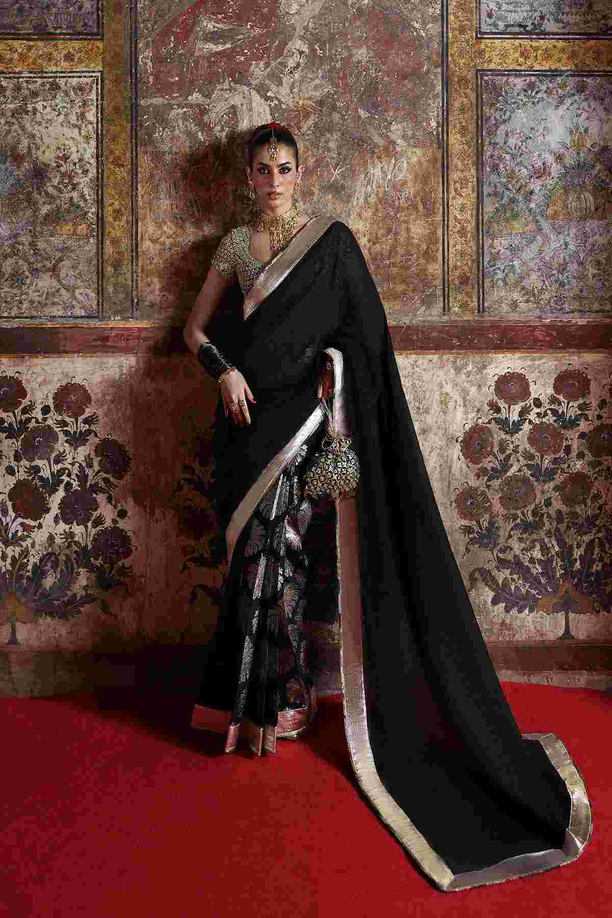 This black saree is the ultimate blend of sophistication, mystery, and glamour. Its embellished blouse can completely elevate the entire look with a handi neckline and cap sleeves, which add richness, character, and personality to the entire saree. It’s banarasi pleats, folds are made at the front while draping, to allow ease of movement and to give it a structured, elegant look. The lapa border on the saree is adding a touch of elegance and sophistication to the overall look. It's chatta patti facings are adding structure and stability to the saree, helping it maintains its shape. Whether you're going for a regal, glamorous, modern aesthetic, reception, formal dinner, or even a fashion-forward festive event, a black saree is always a showstopper.