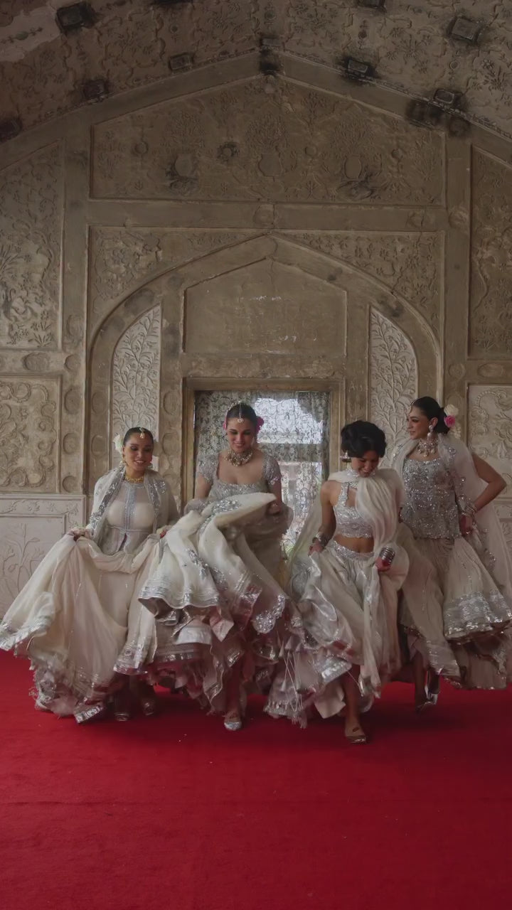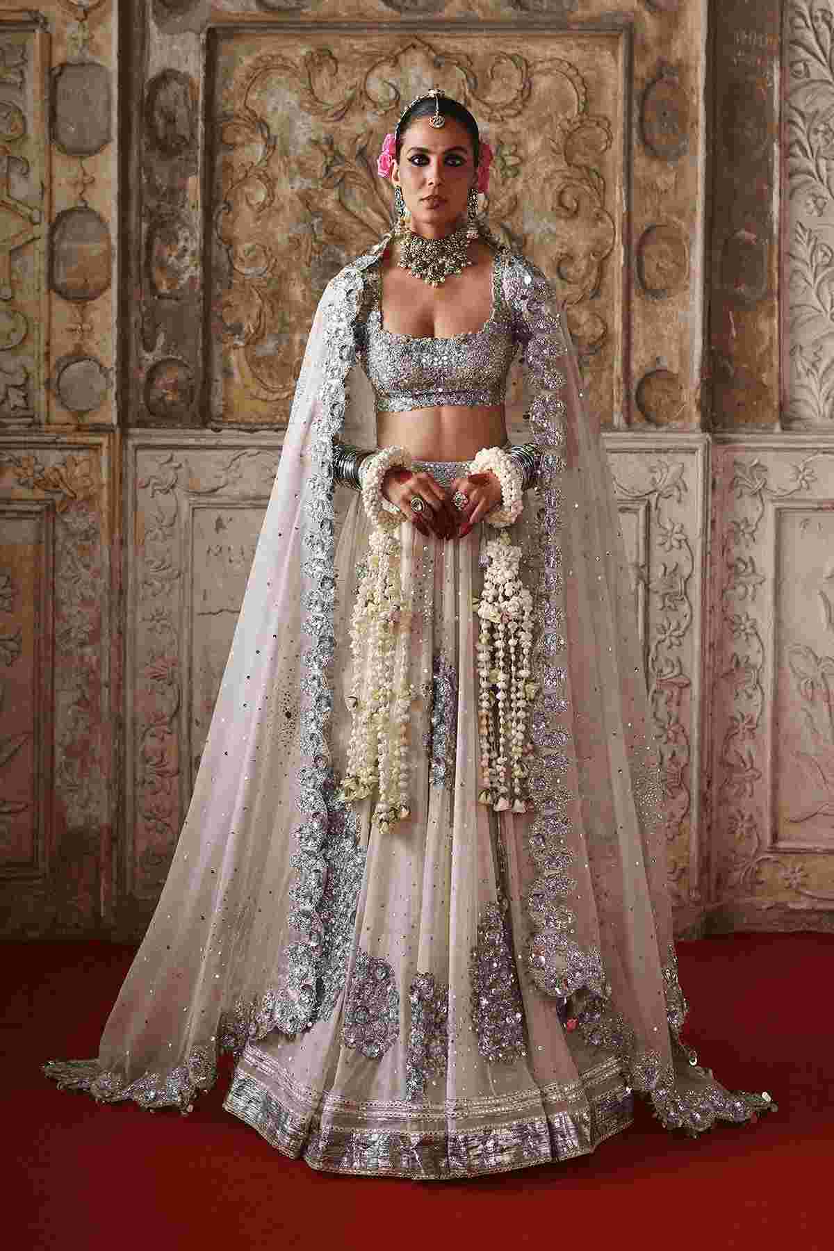 It's a classic and elegant color, often associated with sophistication, purity, and timelessness. A mirror embellishment choli is a dazzling statement piece that combines traditional shisha work with contemporary or classic silhouettes. This chanderi choli is an iconic and trending styles that elevate the lehenga. The organza dupatta with sparkle of mirror work in the middle is finished with a finely scalloped border, lending a graceful rhythm to the edges, perfect for understated elegance. The lehenga features hydrangea embellishments that give a 3D effect without being too bulky, adding a floral and feminine touch. This heavily embellished lehenga is a show-stopping, richly decorated outfit ideal for grand occasions like weddings, receptions, or high-fashion bridal shoots. This lehenga has intricate handwork, luxurious fabrics, and royal silhouettes. The outfit boasts intricate handwork, showcasing exceptional craftsmanship.