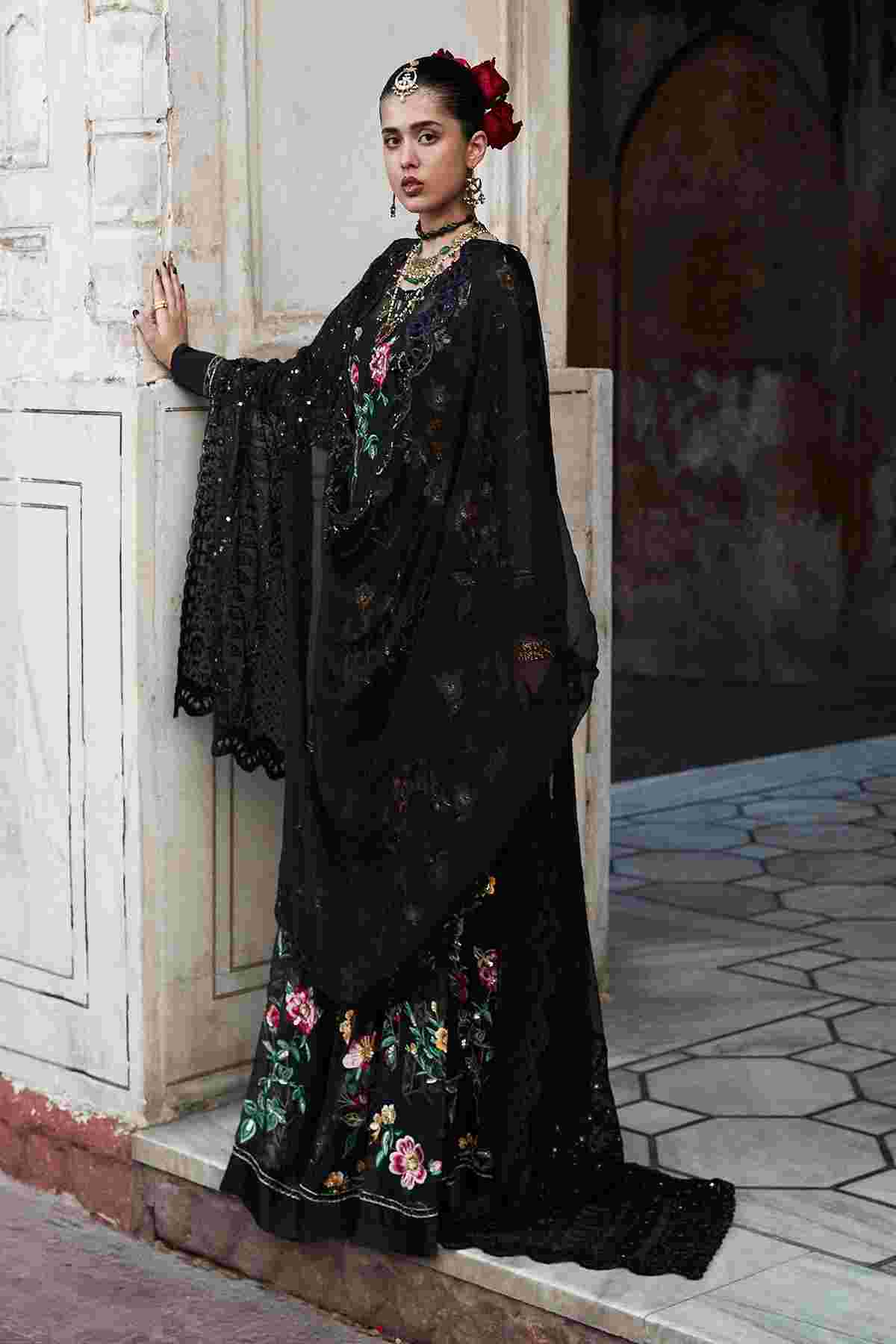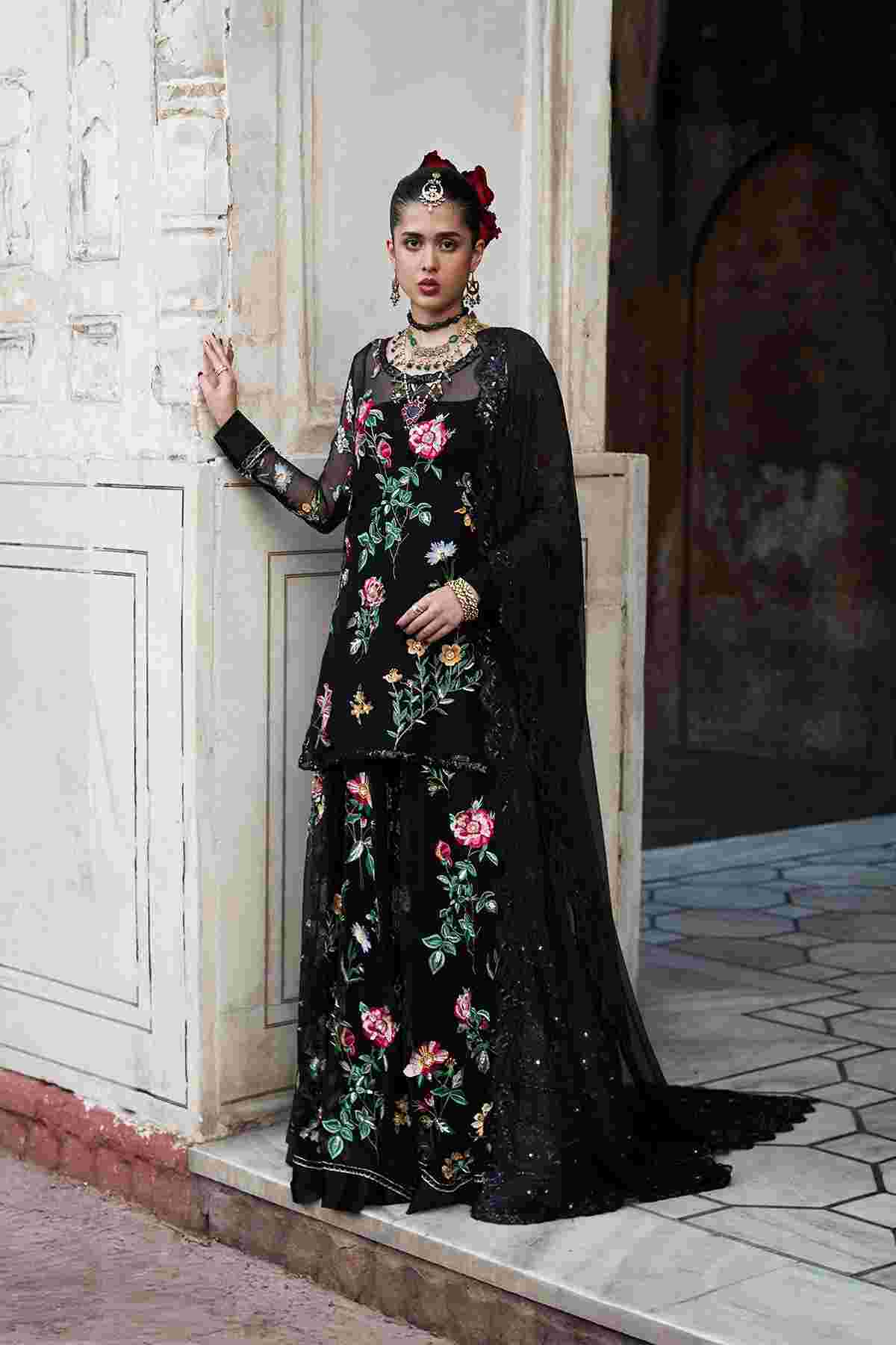 A delicate black chiffon sharara set, adorned with vibrant multicolored floral embroidery, gold sequins accents, finished with satin silk color blocks and intricate tilla trim at the hem. Embellished with black sequin trims at the hem and neckline, and tassels at the back. Paired with a stunning black chiffon dupatta, featuring black sequin and panni accents, and delicate scalloped borders.
