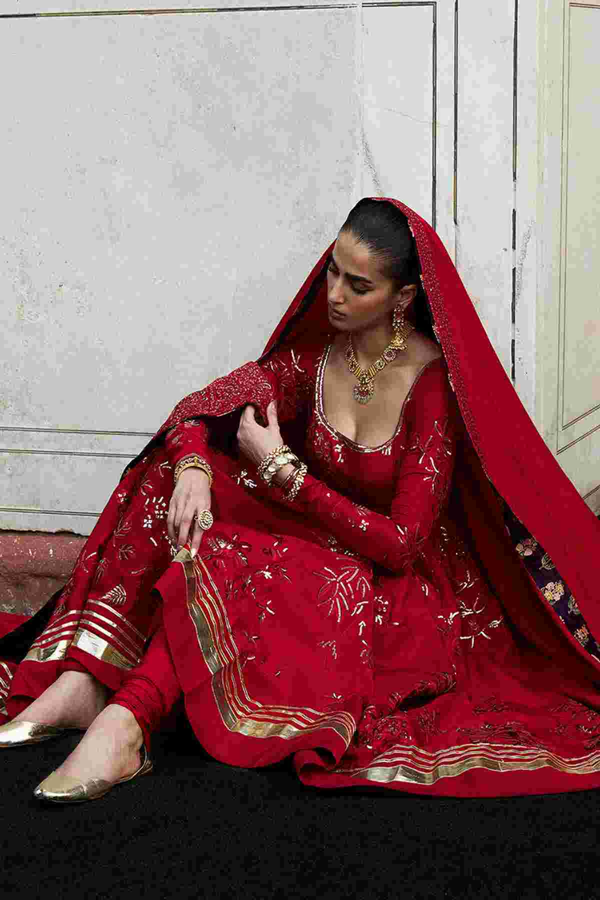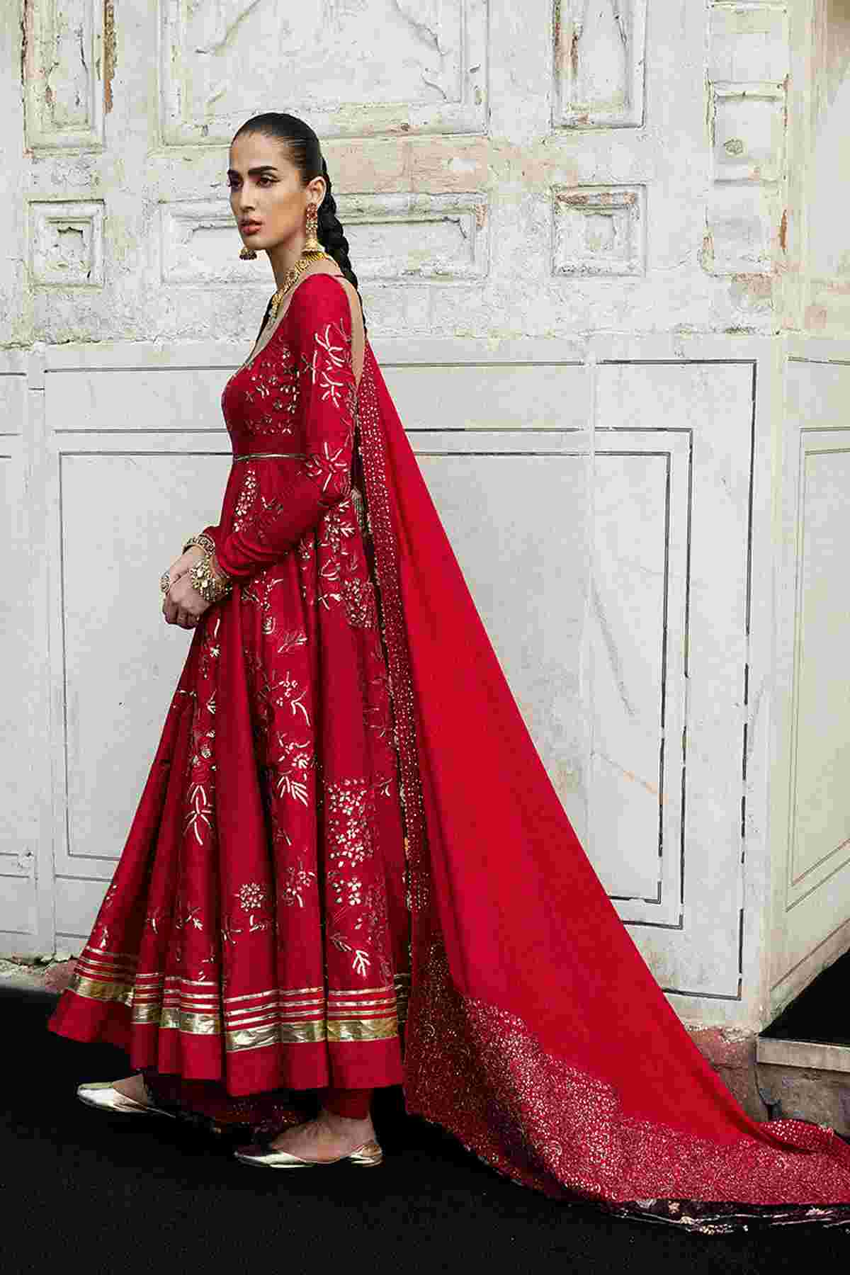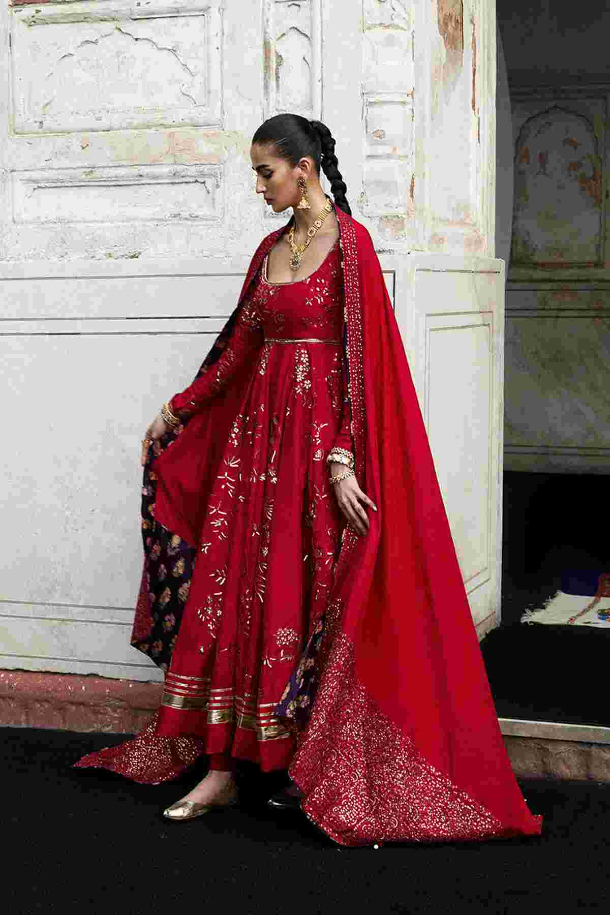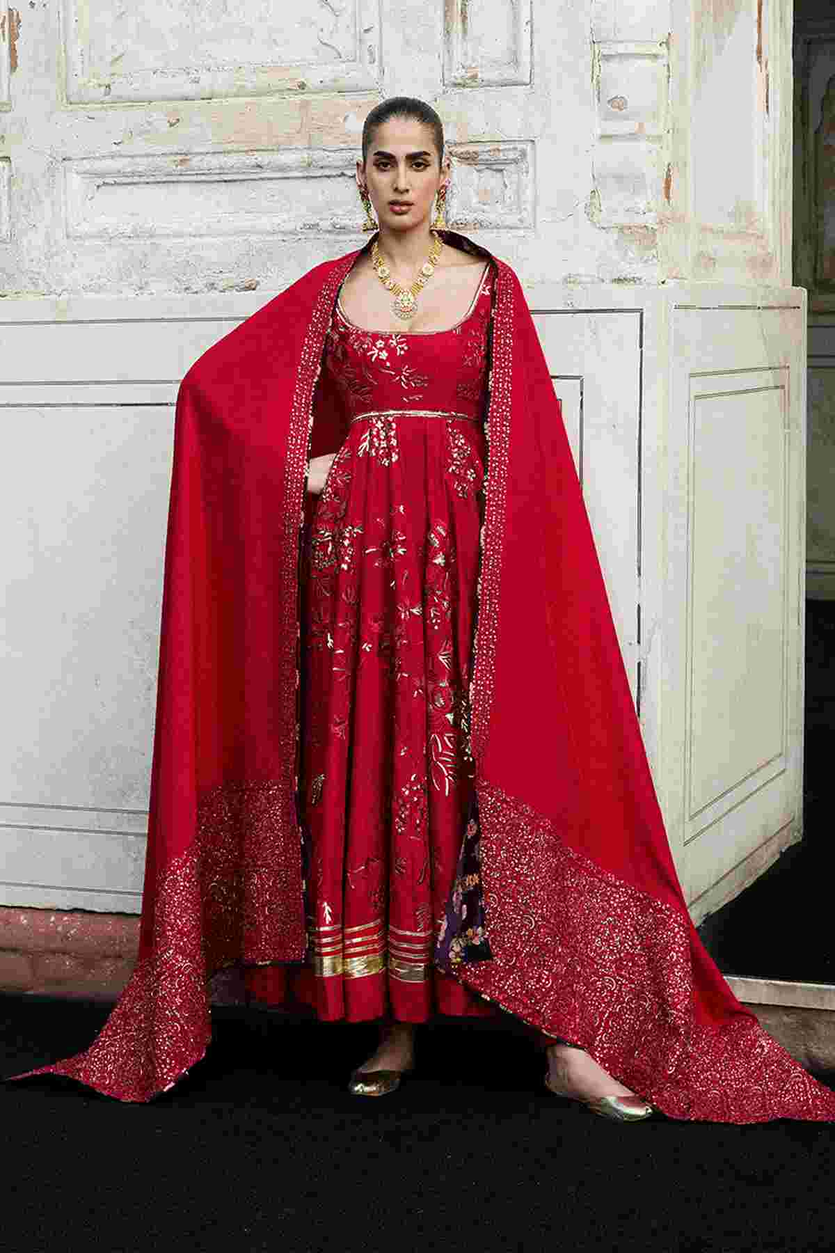 A vibrant Red Korean raw silk peshwaz, adorned with rich Gara embroidery, golden sequin accents and inserts, it ornate lappa and gotta detailing at the hem. Paired with a stunning Korean raw silk shawl, featuring embroidered borders on all four sides, finished with rich plum-colored printed satin silk facing. Complemented by a sleek plain Korean Raw silk churidar, this ensemble exudes elegance.