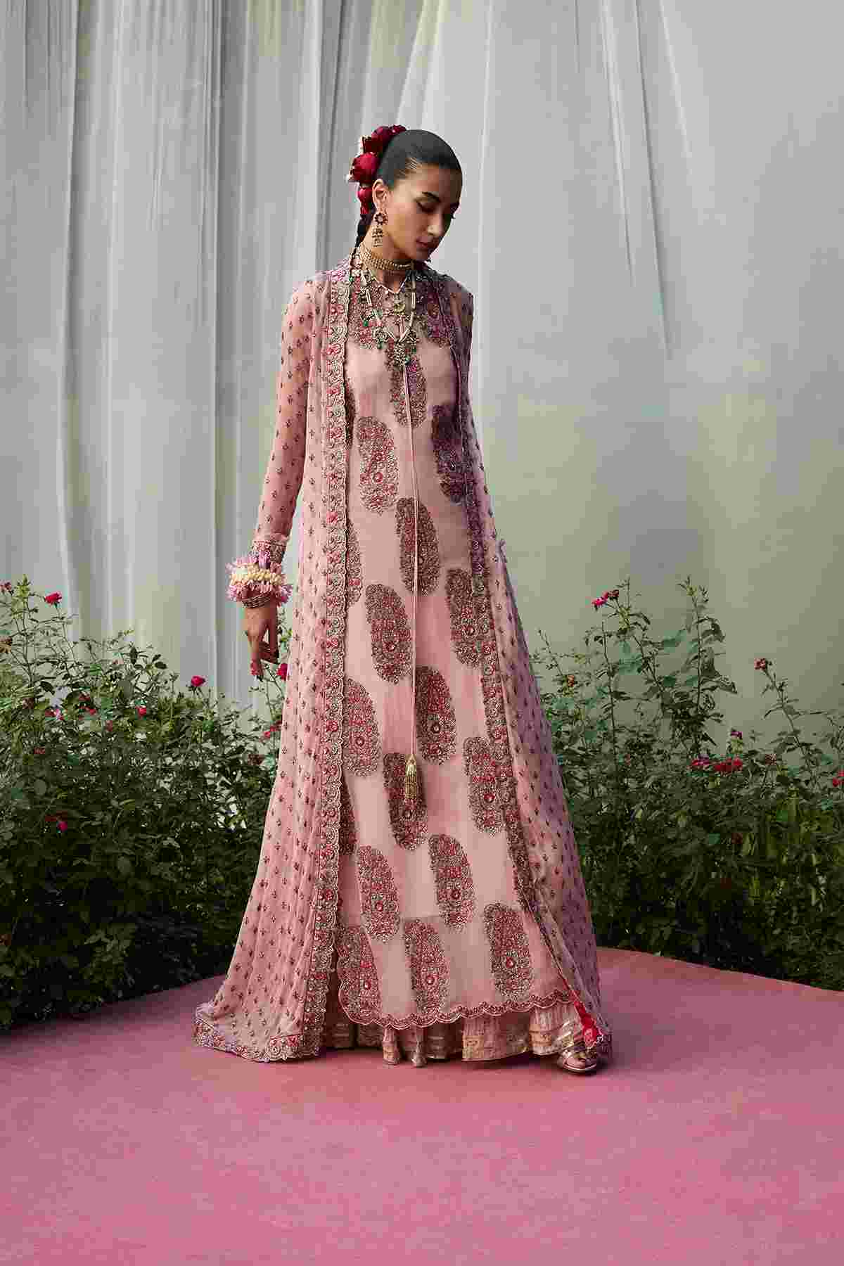 A delicate powder pink Organza shirt, adorned with vibrant multicolor embroidered paisley motifs, scalloped borders, and tassel detailing at the neckline and golden sequin accents. Paired with a stunning floor-length chiffon jacket adorn with delicate multicolored stitch work and embroidered borders, finished with hot pink printed facing. Complemented by a crushed silk sharara, screen-printed with a vibrant design and embellished with gotta trimmings at the hem, this ensemble exudes playful elegance.