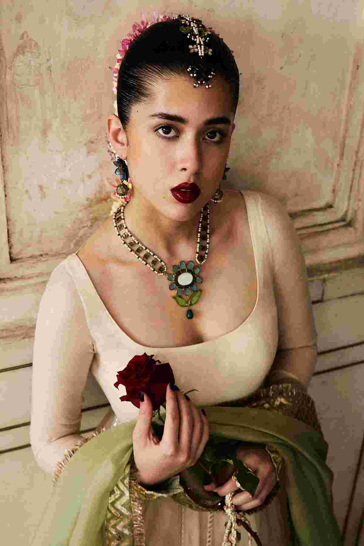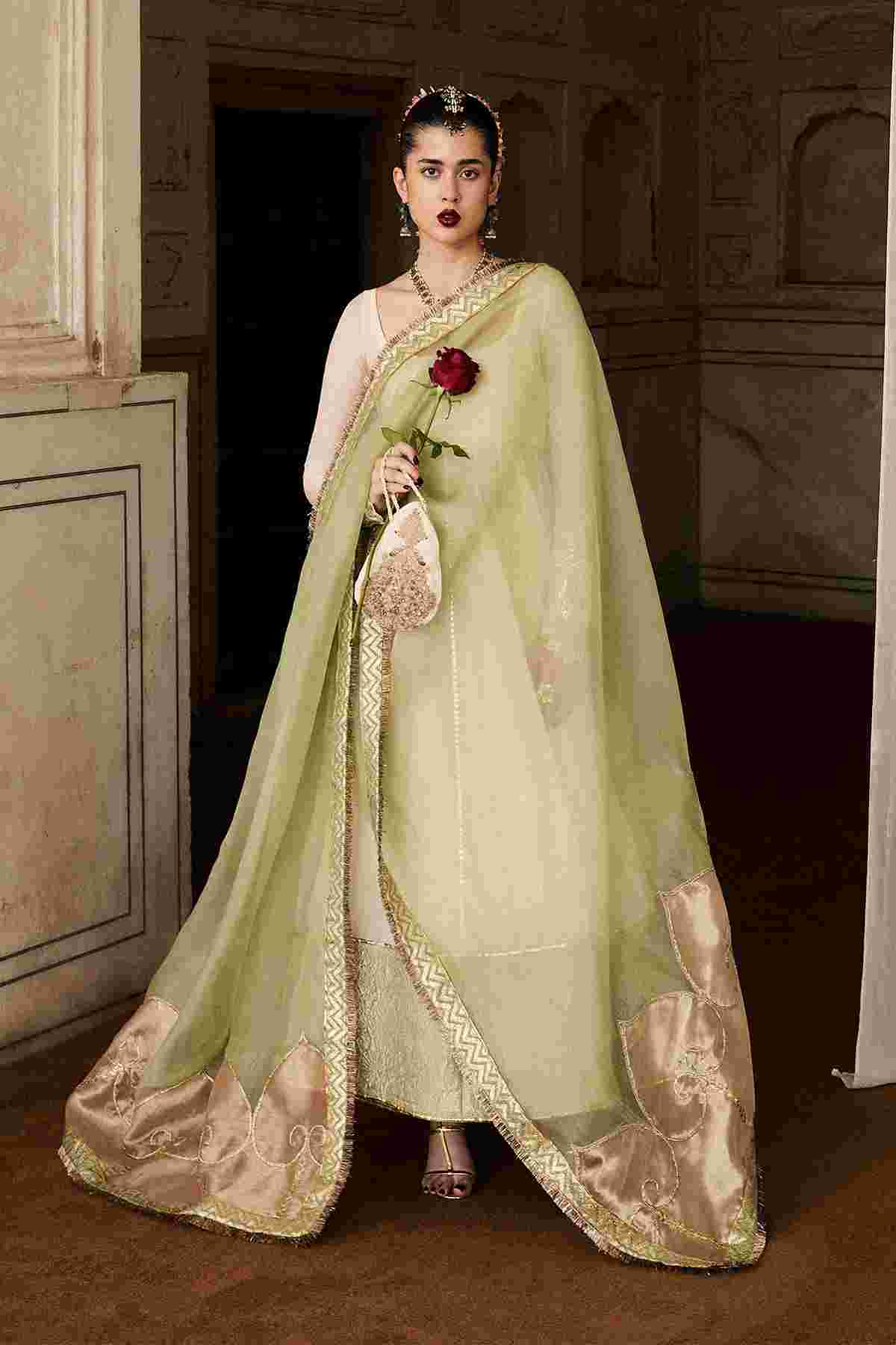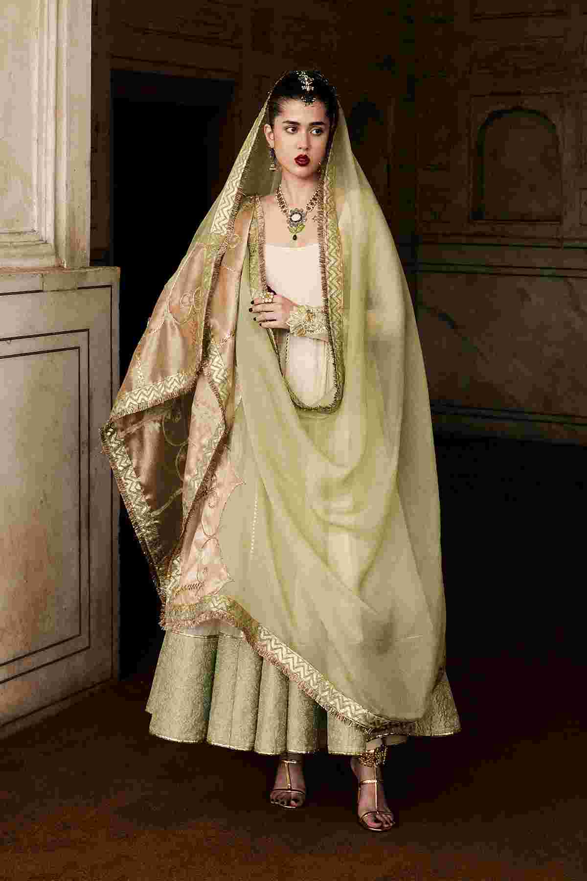An ethereal ivory chanderi silk pishwas featuring delicate pani inserts, and a pistachio green hem border that is adorned with intricate quilted tilla embroidery. The edges are accentuated with fine gota, adding a touch of traditional elegance. Paired with a classic ivory chanderi churidar for a timeless silhouette. The look is completed with a pistachio green organza dupatta, detailed with tilla-embroidered pallus and finished with rich banarsi chanderi silk borders — a perfect harmony of grace and craftsmanship.