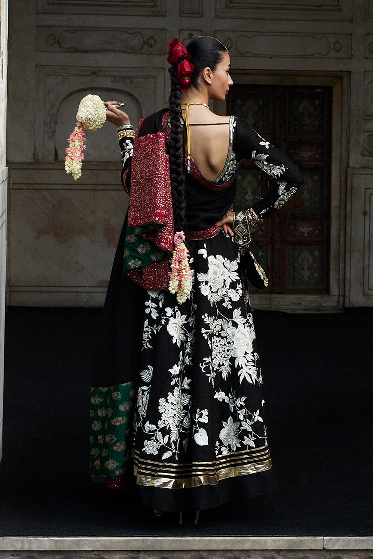 A black Korean raw silk pishwas, adorned with rich Gara embroidery, golden sequin accents, and ornate lappa and gotta detailing at the hem. Paired with a striking black Korean raw silk shawl that is color-blocked with maroon intricate embroidered borders, and finished with green printed satin silk facing. Completed with a sleek plain black Korean raw silk churidar, this ensemble exudes sophistication.