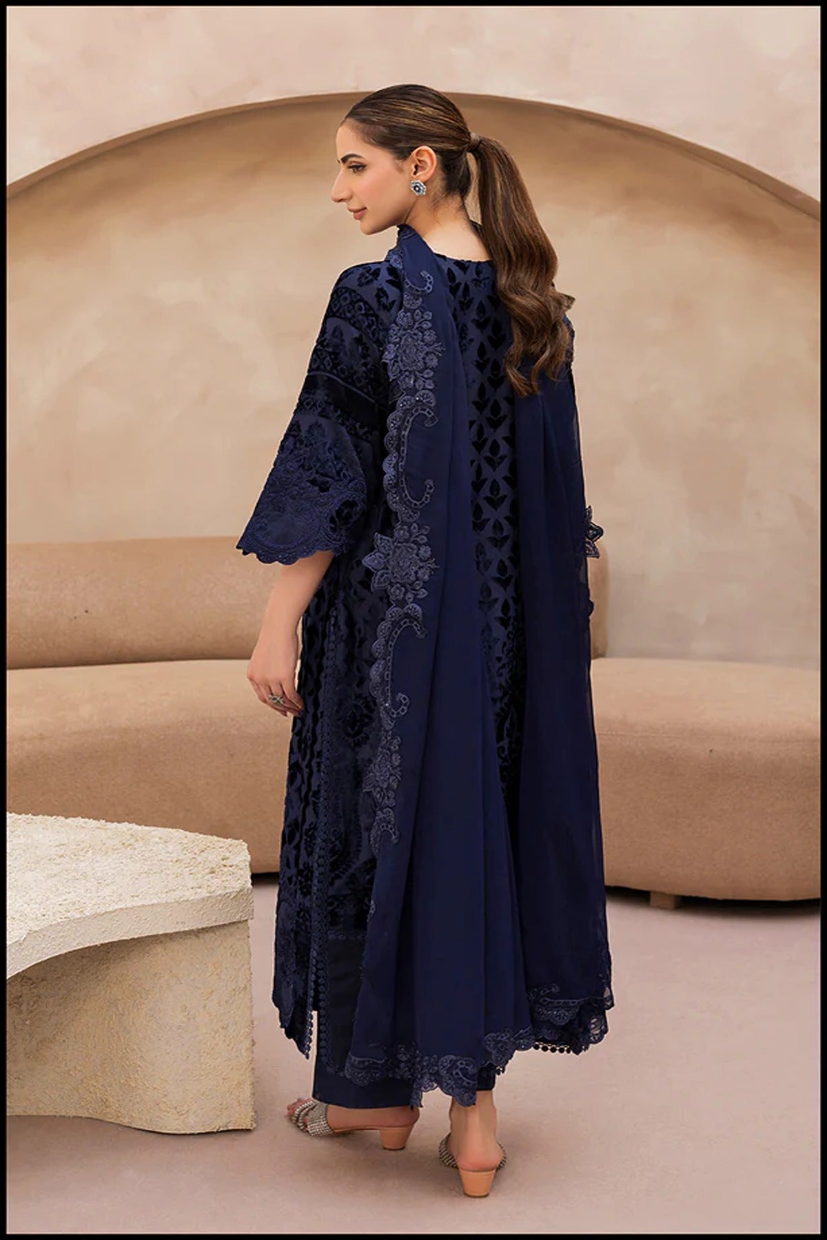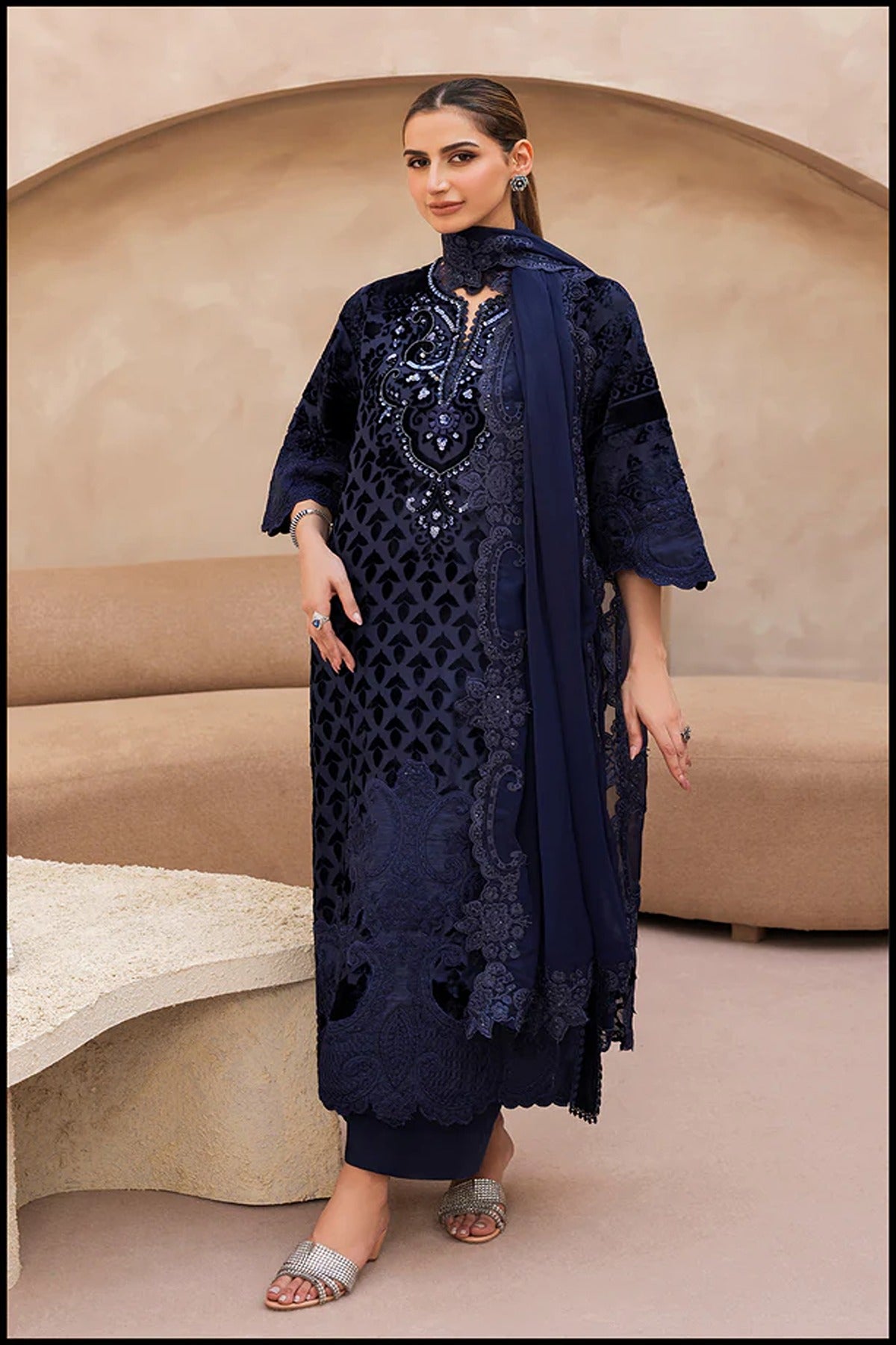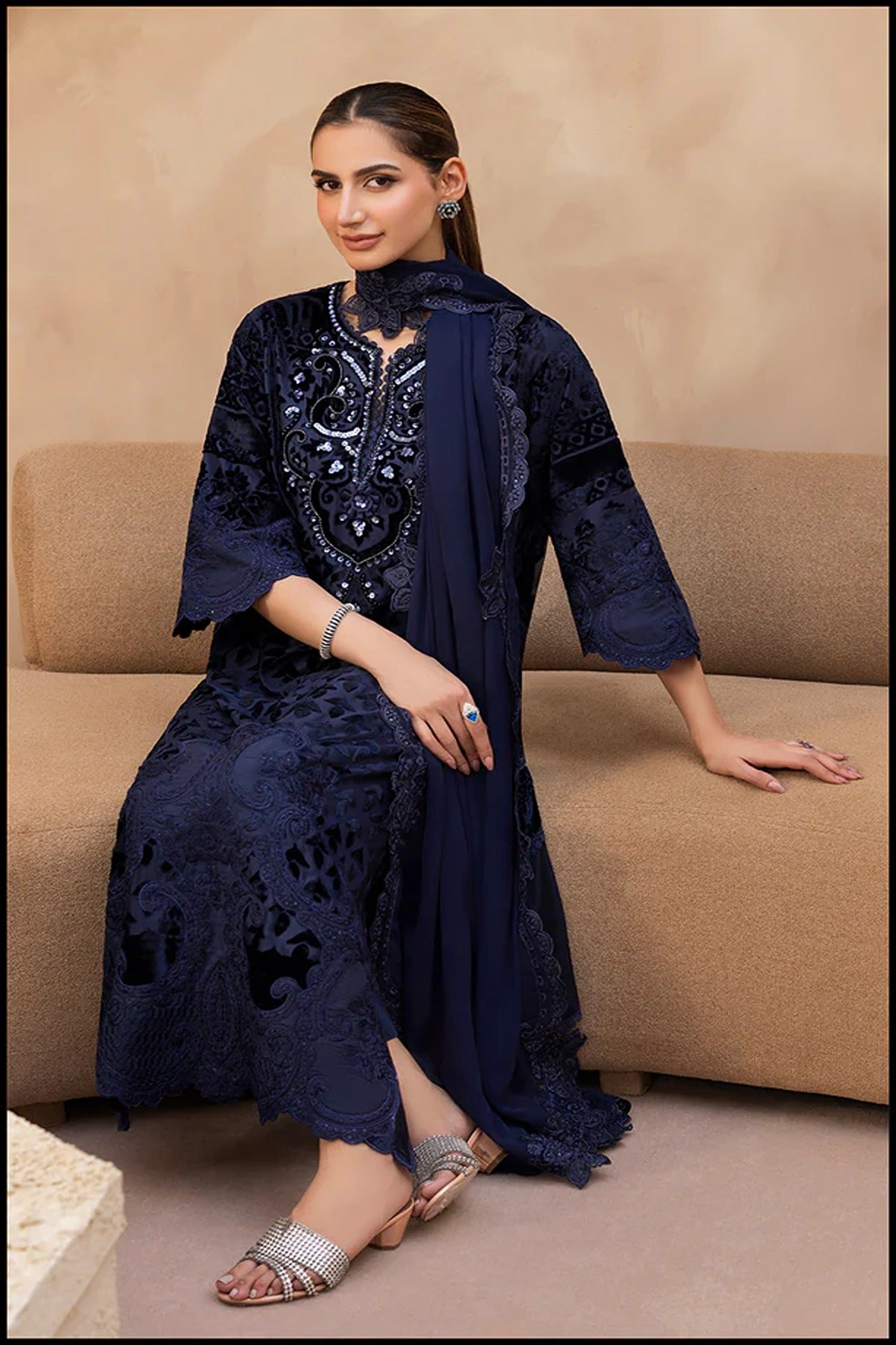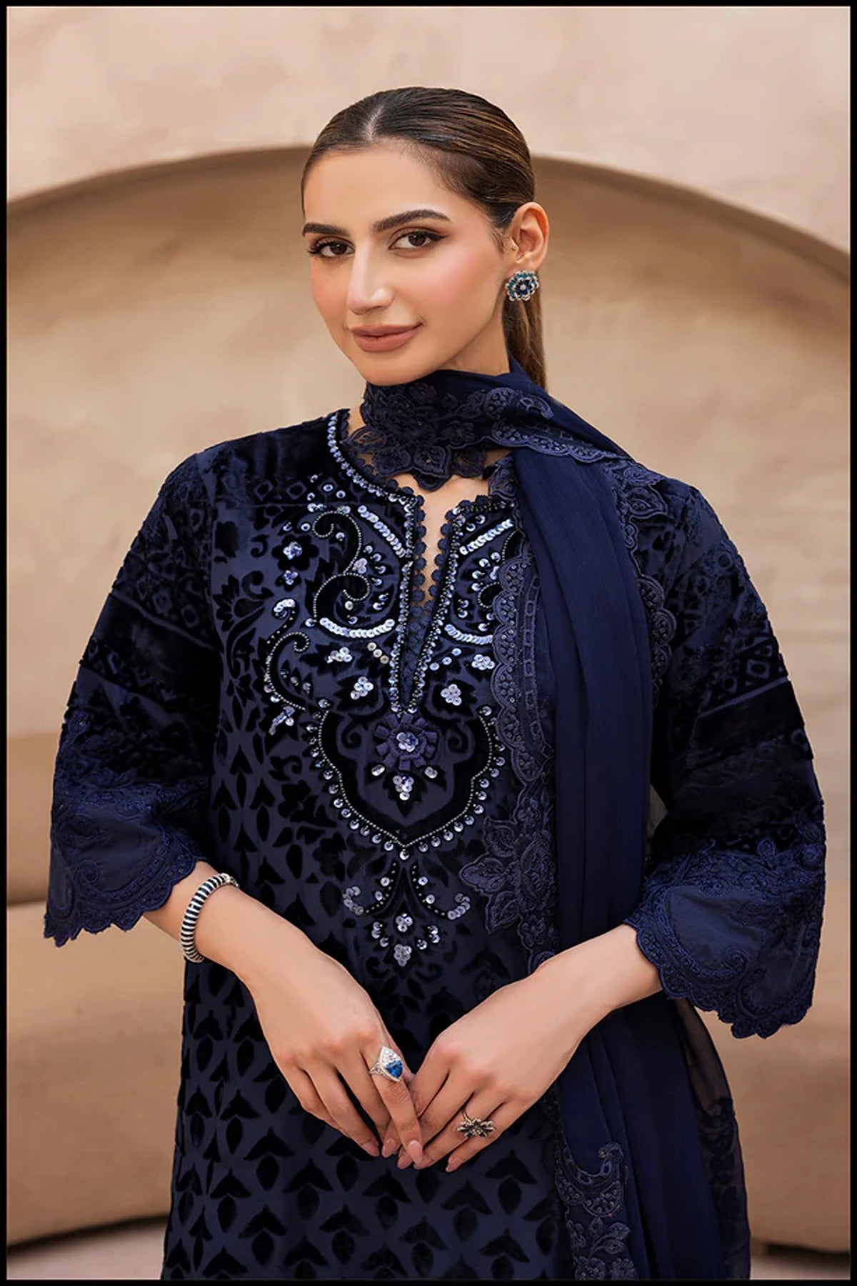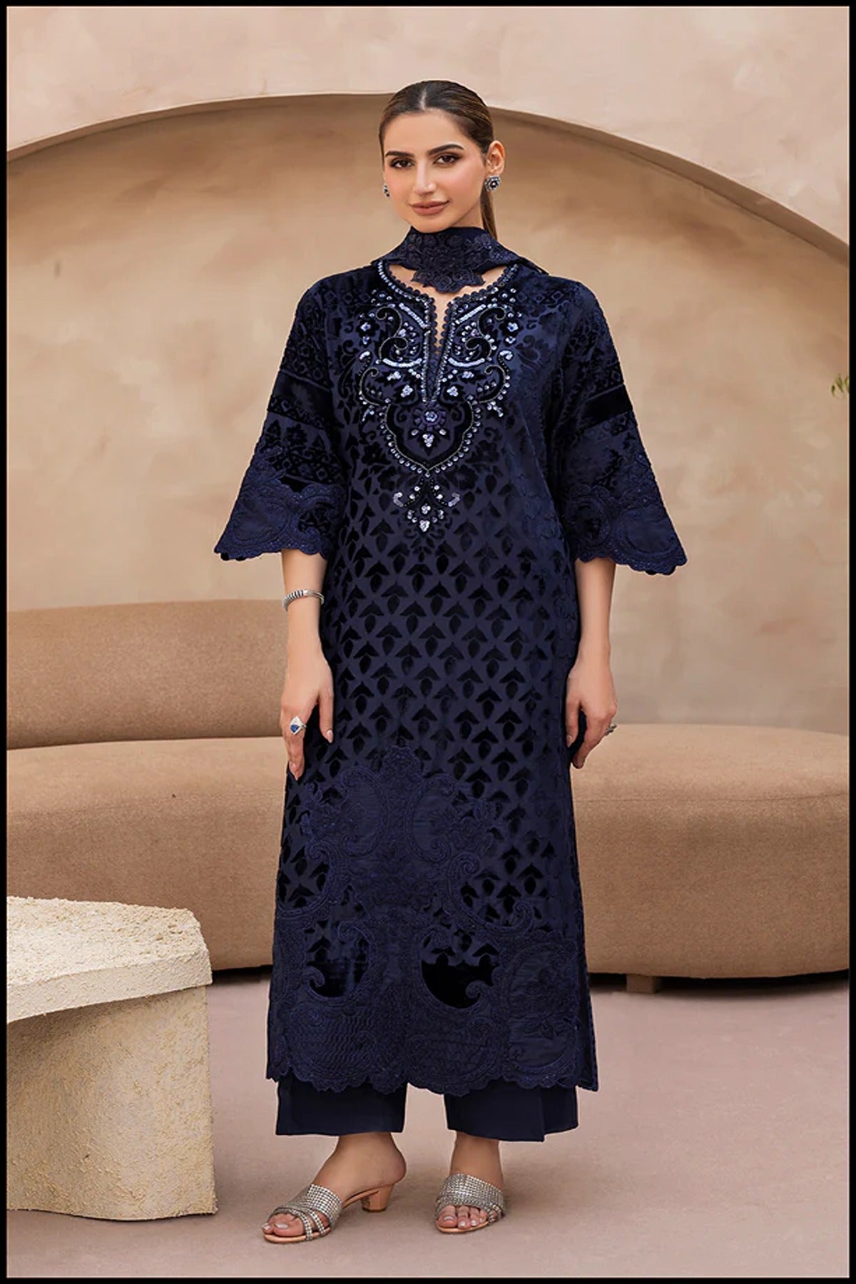 A symphony of elegance and opulence, Navy Serenade is a 3-piece velvet ensemble that radiates regal sophistication. Crafted in a majestic midnight blue hue, this masterpiece features an intricately embroidered neckline adorned with glistening hand embellishments and sequins that catch the light with every movement. The plush velvet canvas is elevated with ornate cutwork and lace detailing, blending traditional artistry with contemporary finesse. Paired with a gracefully draped dupatta, this ensemble exudes timeless grandeur — an ode to refined luxury, perfect for winter soirées and festive celebrations.