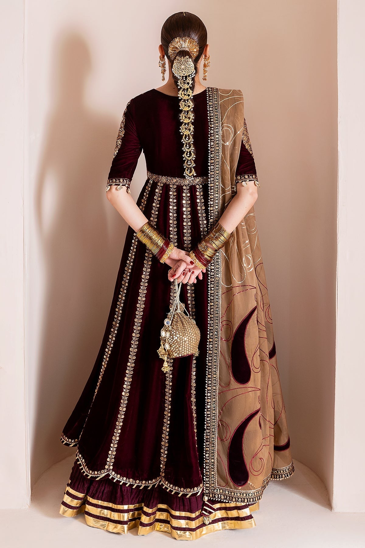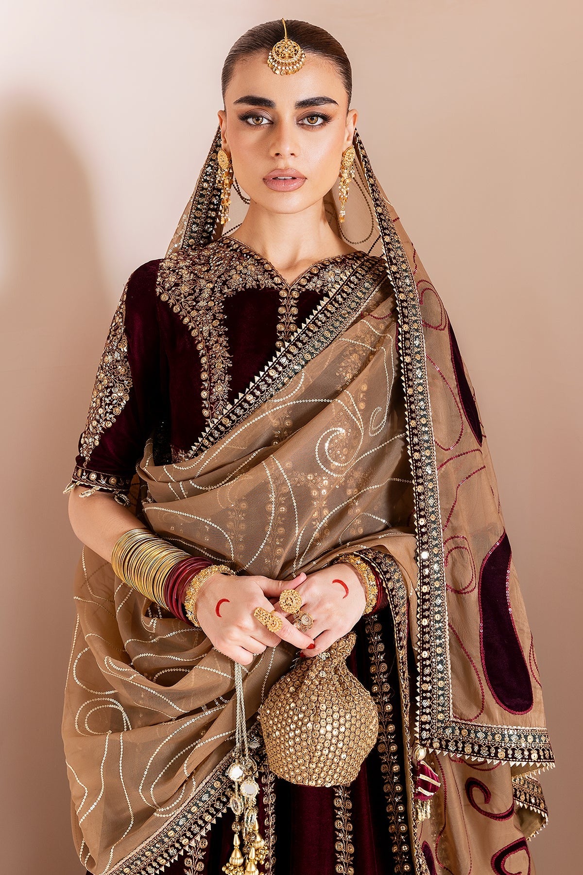 “Gulmirah” is a symphony of opulence, crafted from pure velvet and adorned with intricate embroidery on front and back panels. The design is elevated with rich embroidered borders and a delicately ornate organza dupatta, finished with velvet accents and laser detailing. Paired with a crushed raw silk bottom, this ensemble embodies timeless luxury and regal charm.