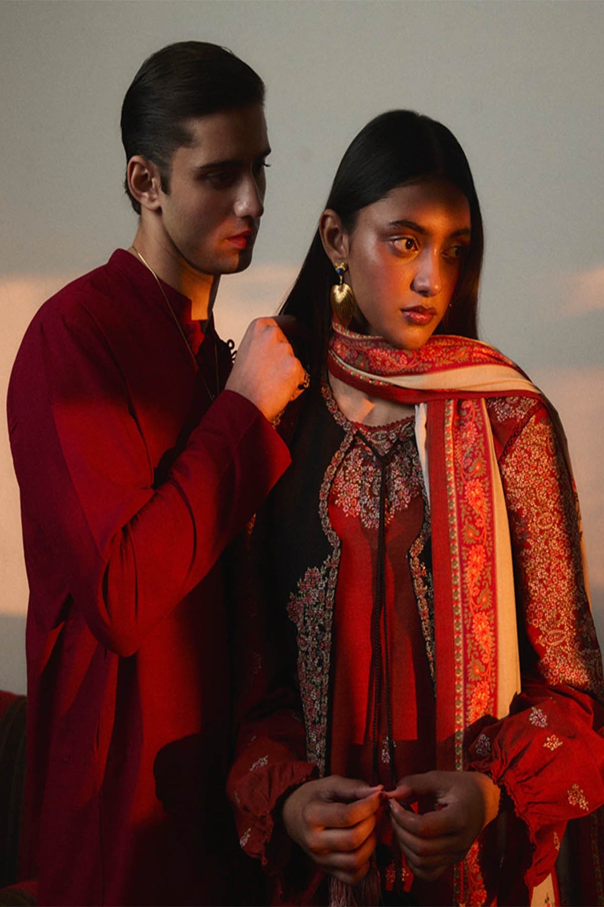 This captivating ensemble features a rust-colored long shirt with intricate cross-stitch embroidery and playful tassels, creating a striking blend of tradition and modern flair. The balloon sleeves, also embroidered with cross-stitch designs, add volume and elegance to the outfit. Paired with a screen-printed rust-colored shalwar, the look maintains a harmonious balance of color and intricate detailing. The ensemble is completed with a black cross-stitch embroidered koti, offering a bold contrast, and a light green printed wool shawl adorned with tassels, adding warmth and texture. Perfect for festive occasions or cultural gatherings, this outfit beautifully combines rich hues and fine craftsmanship for an effortlessly sophisticated look.