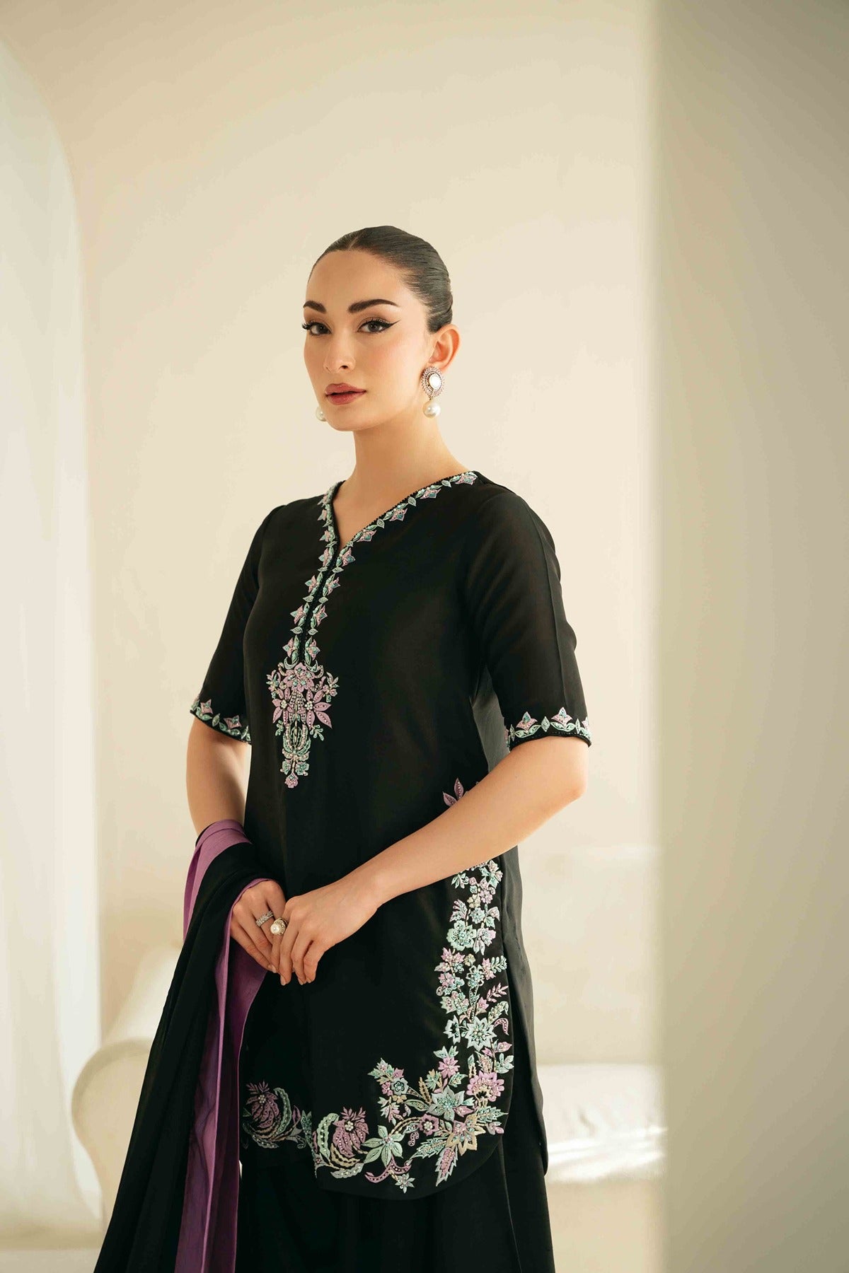 Hand embroidered base with embellishment of pearls, crystals, Katdana in monotones.
