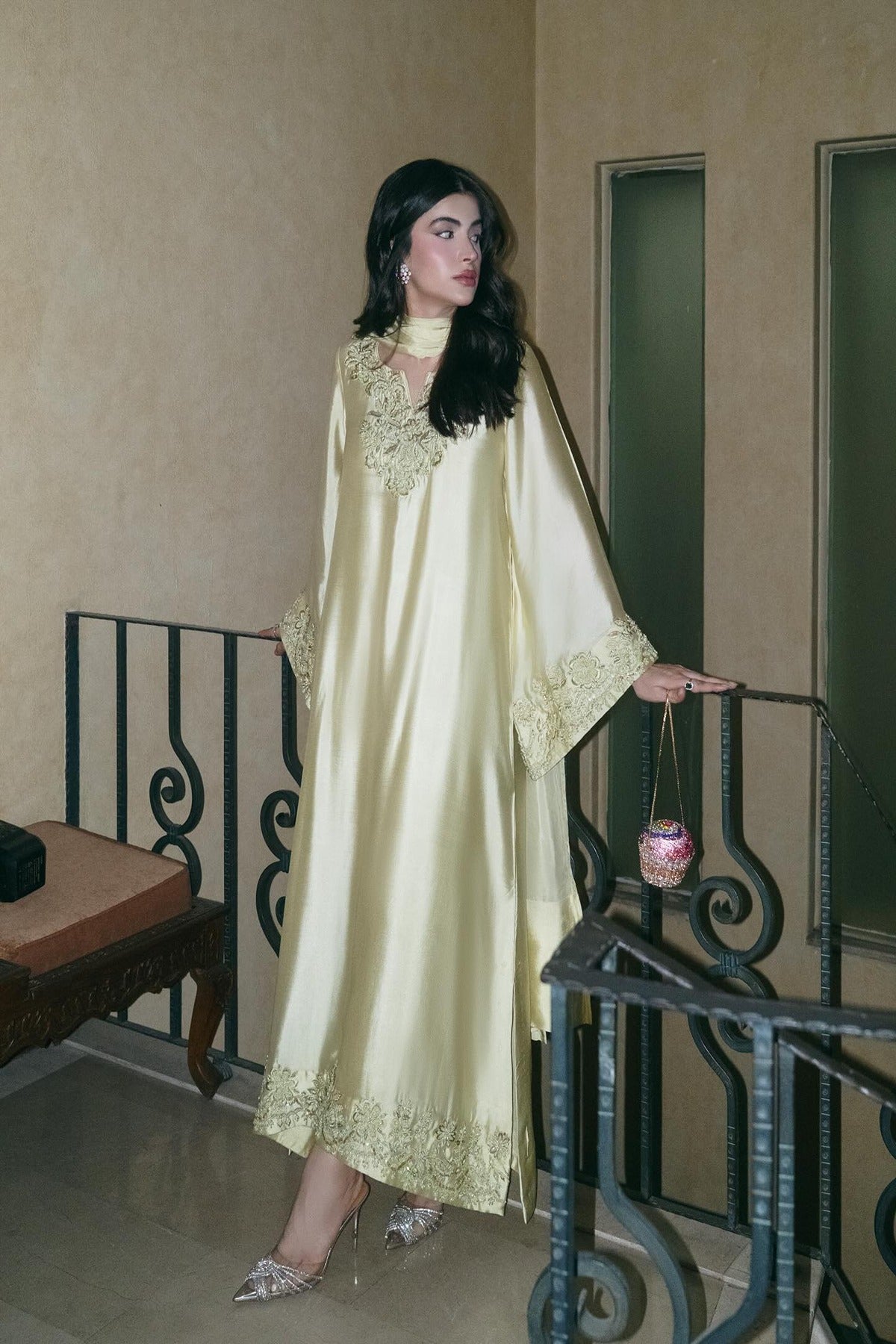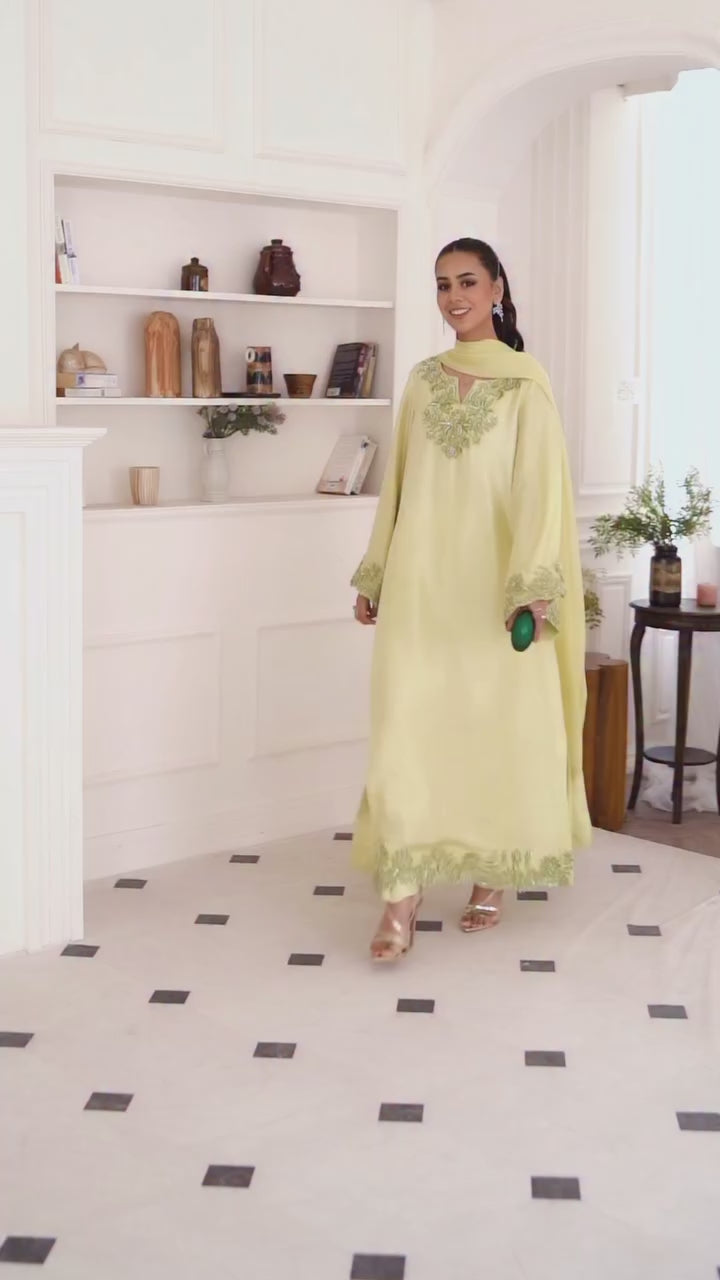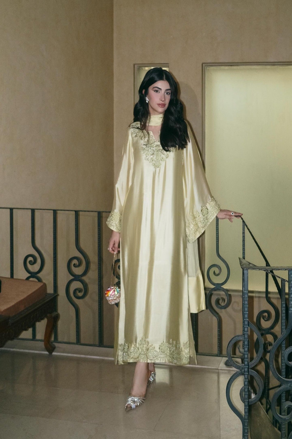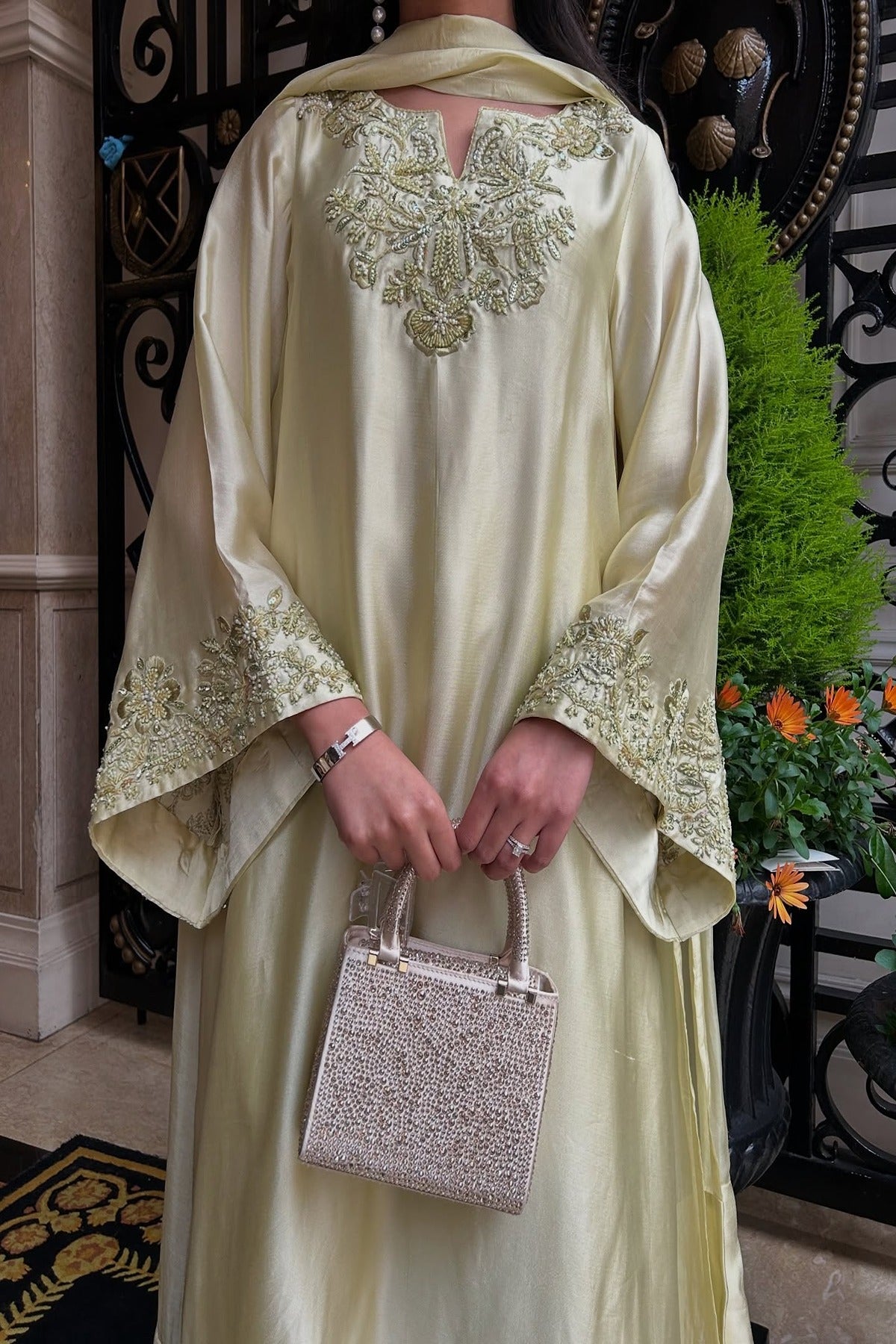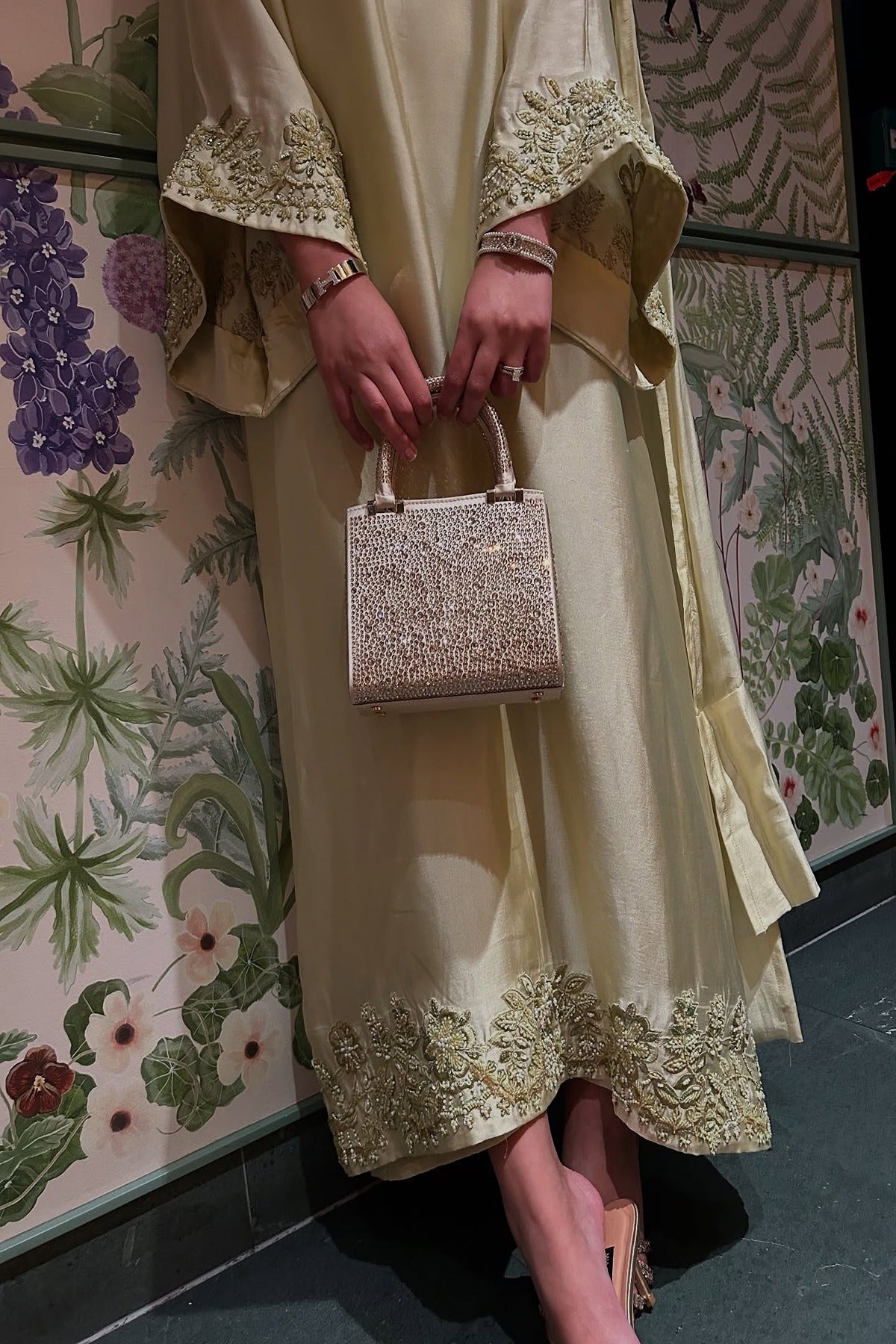 Hand embroidered base with embellishment of crystals, Katdana and sequins in monotones.