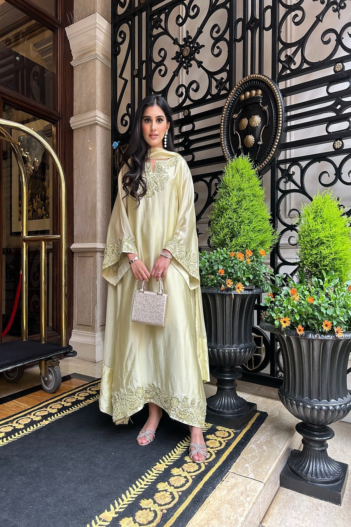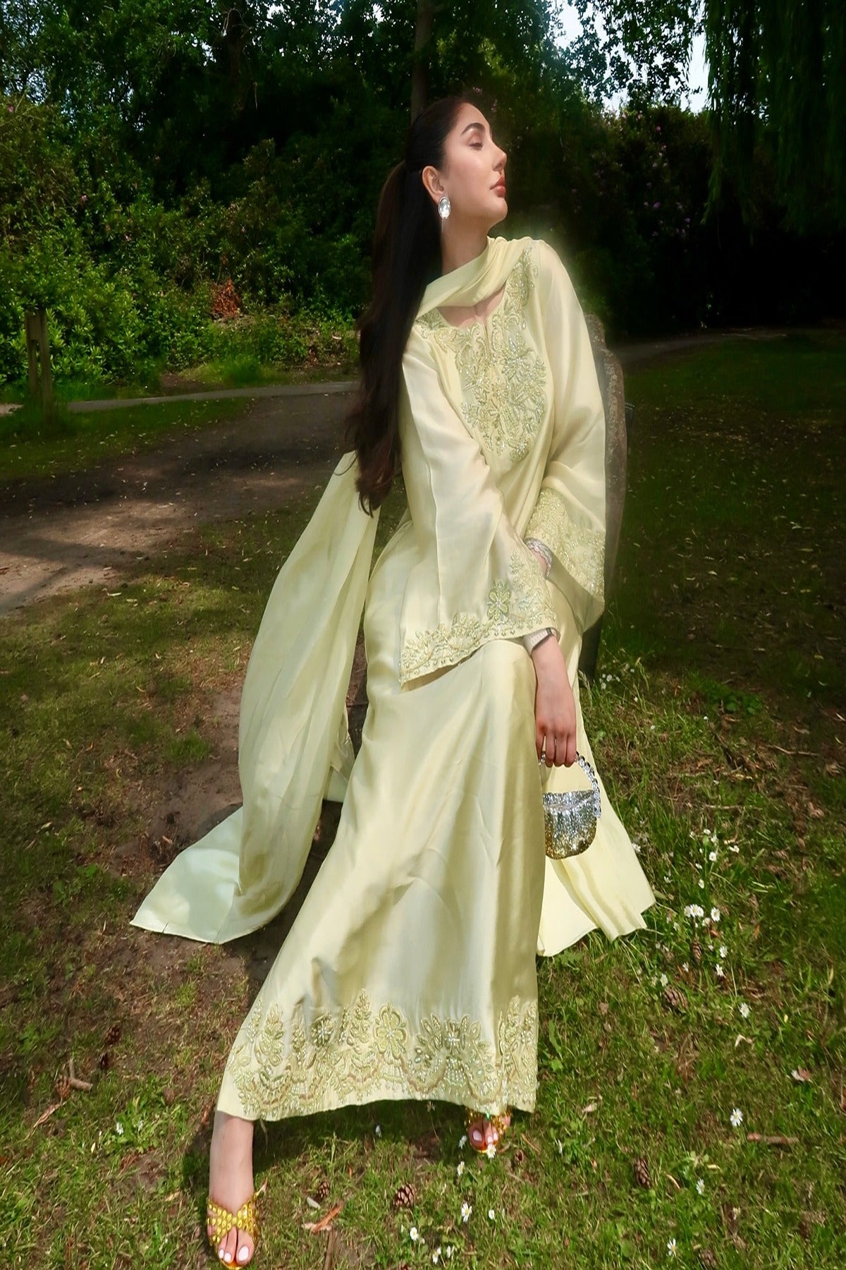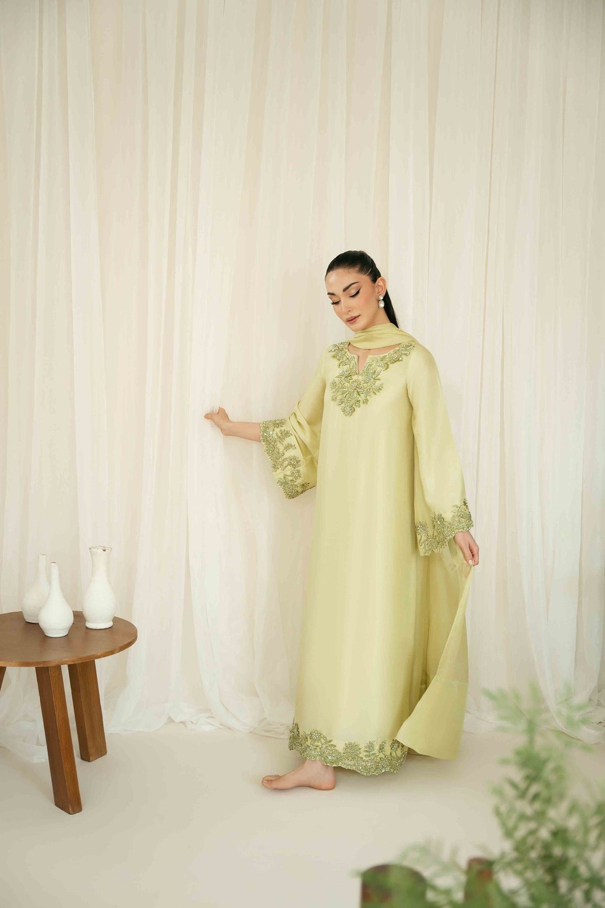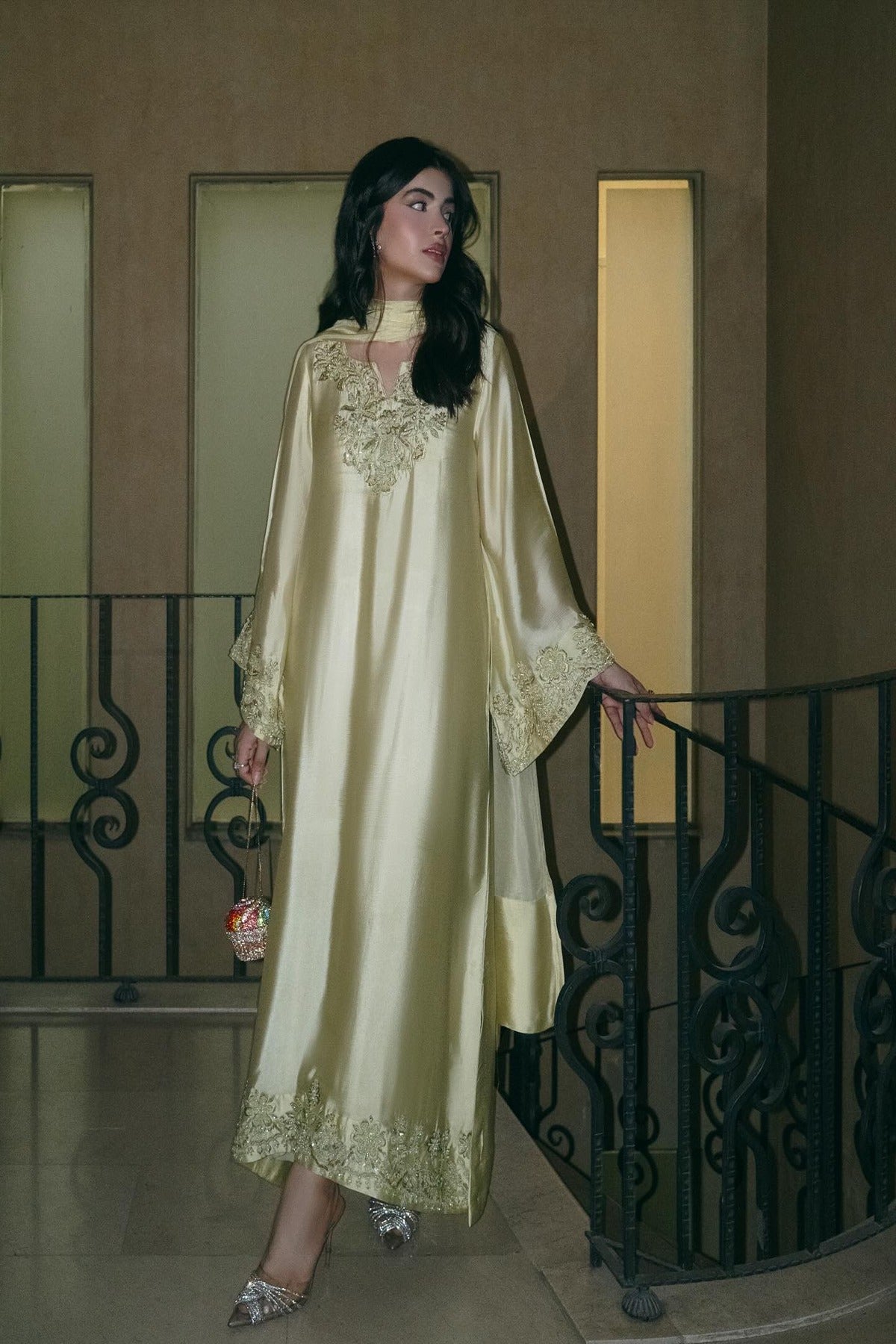 Hand embroidered base with embellishment of crystals, Katdana and sequins in monotones.