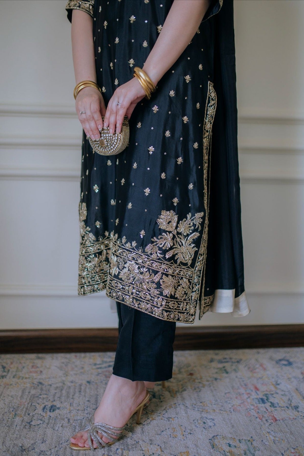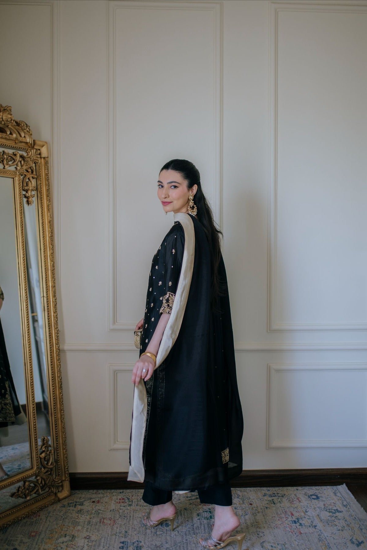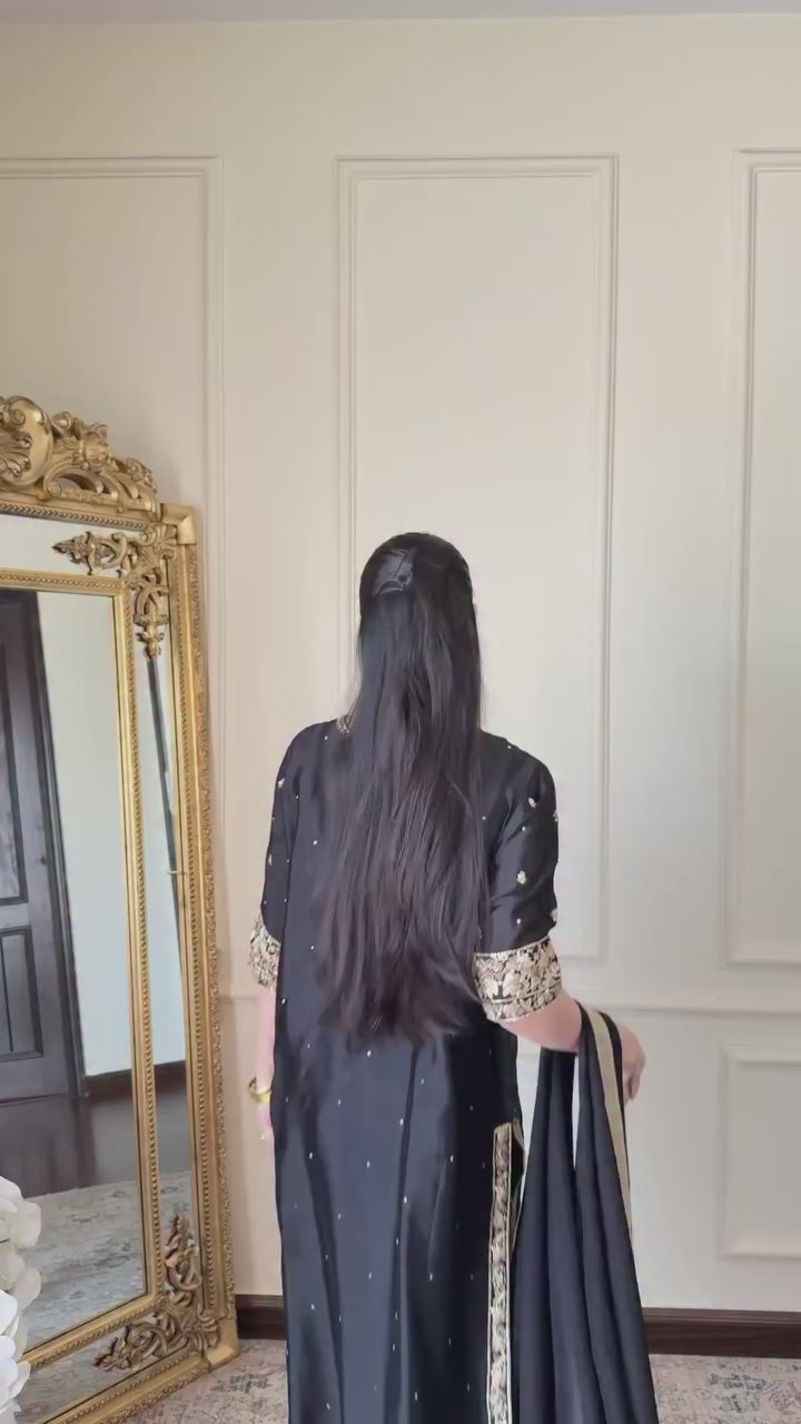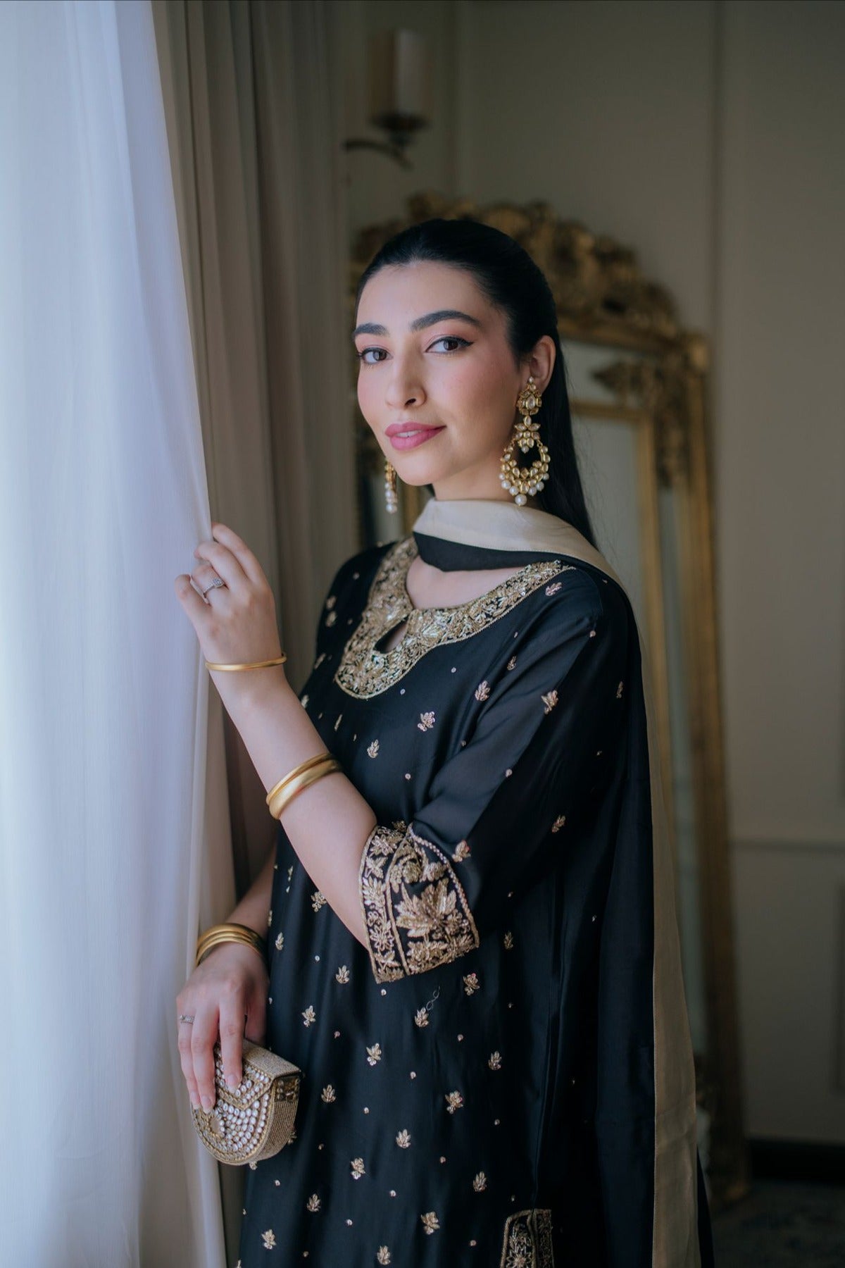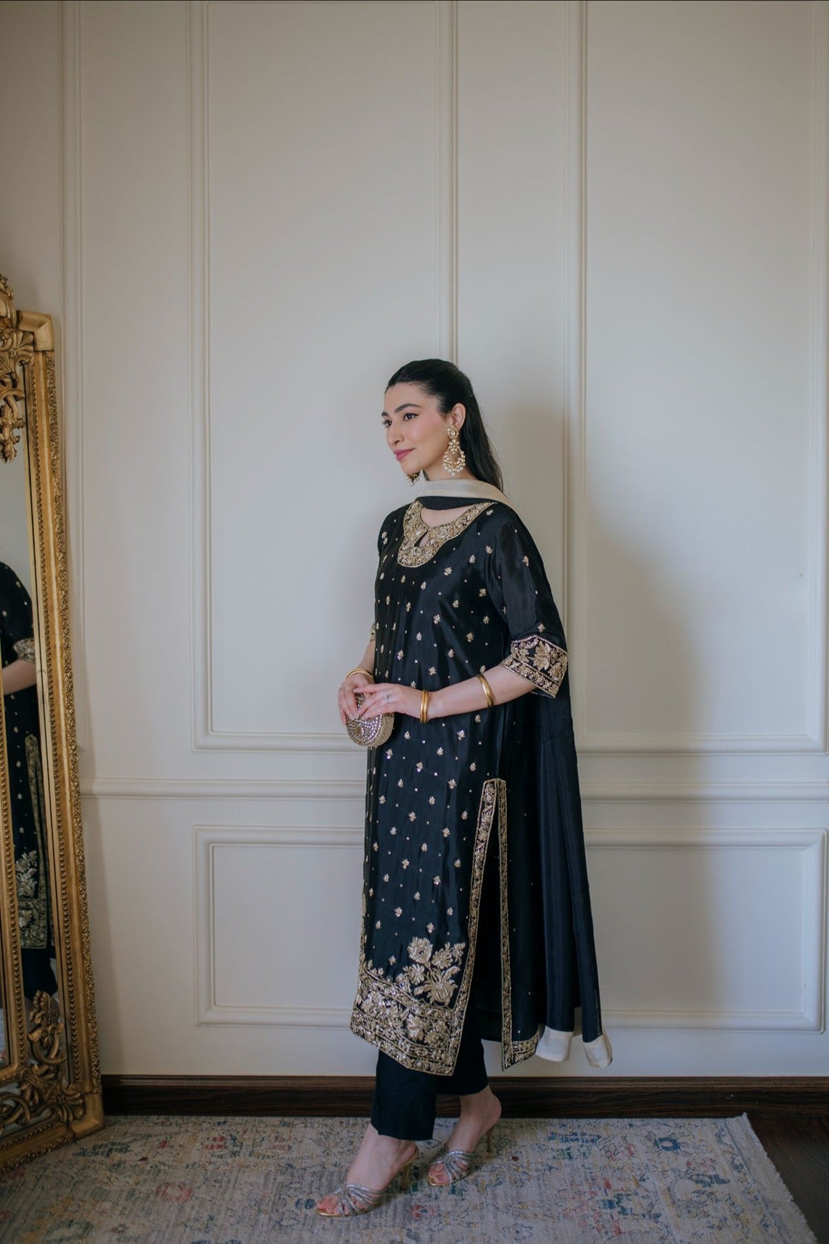 This exquisitely embellished ensemble features intricate kora, dabka, sequins, and nakshi detailing, creating a timeless addition to your wardrobe. It comes paired with a luxurious medium silk dupatta and straight pants for a complete, elegant look.
