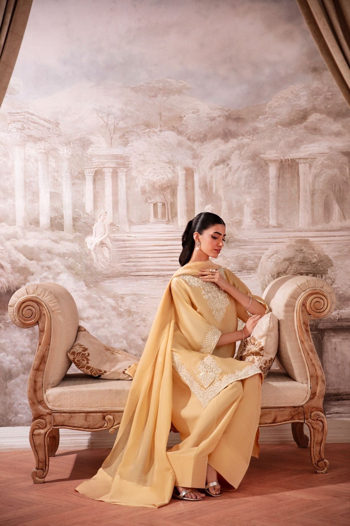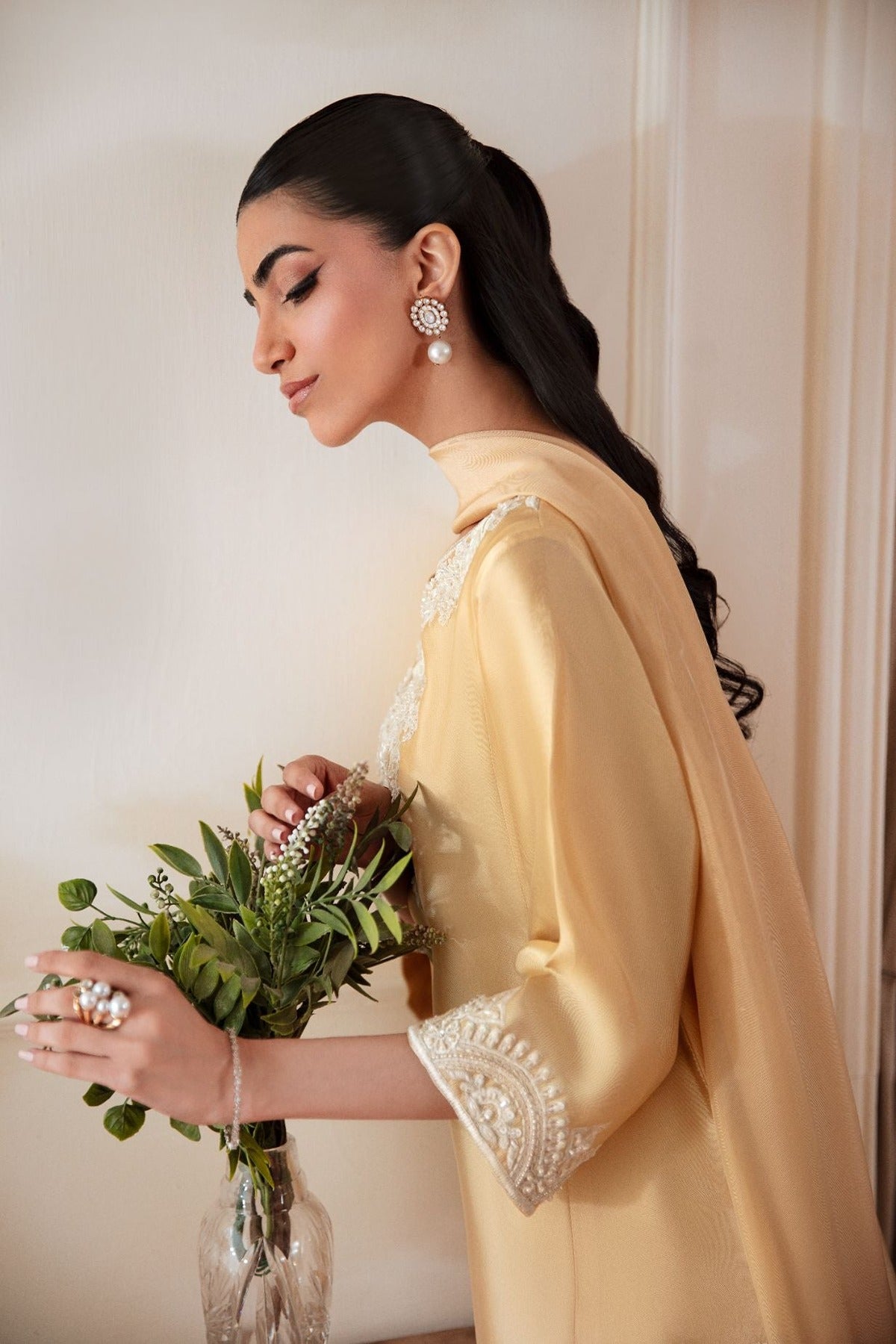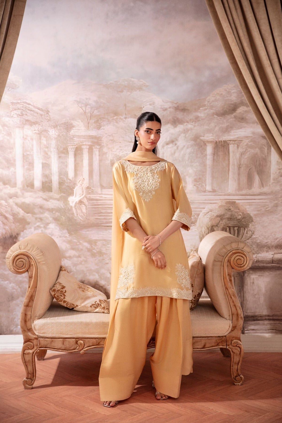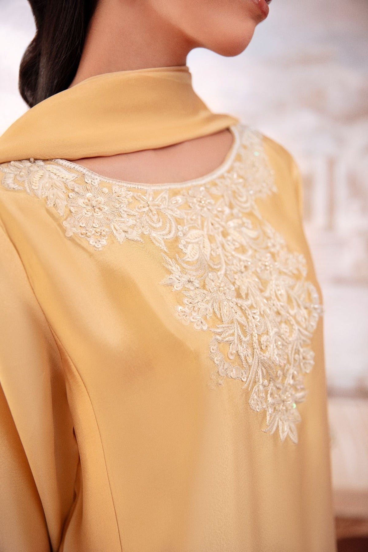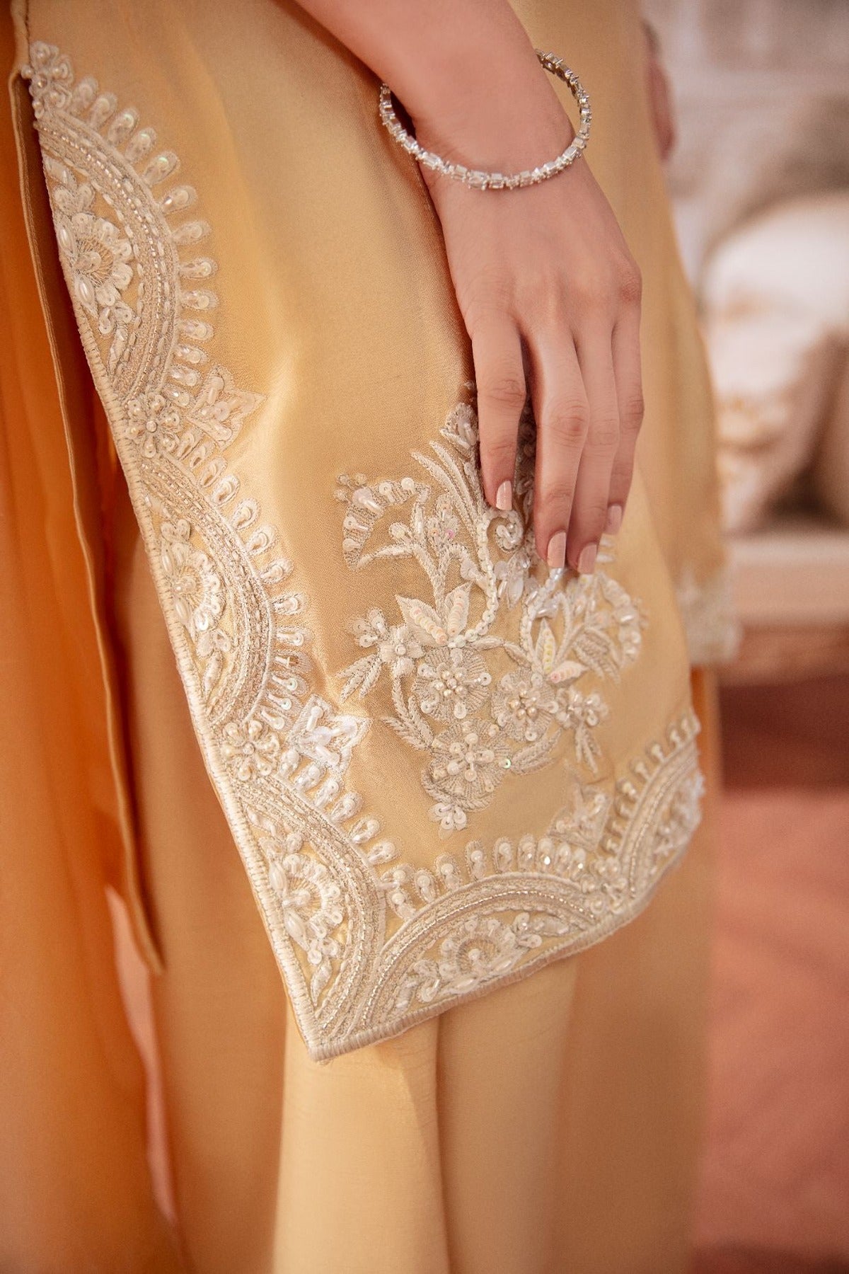 A 3pc set on sheesha Silk, embellished in cream pearls, sequins and katdana. It comes with a medium silk duppata and a farshi shalwar.