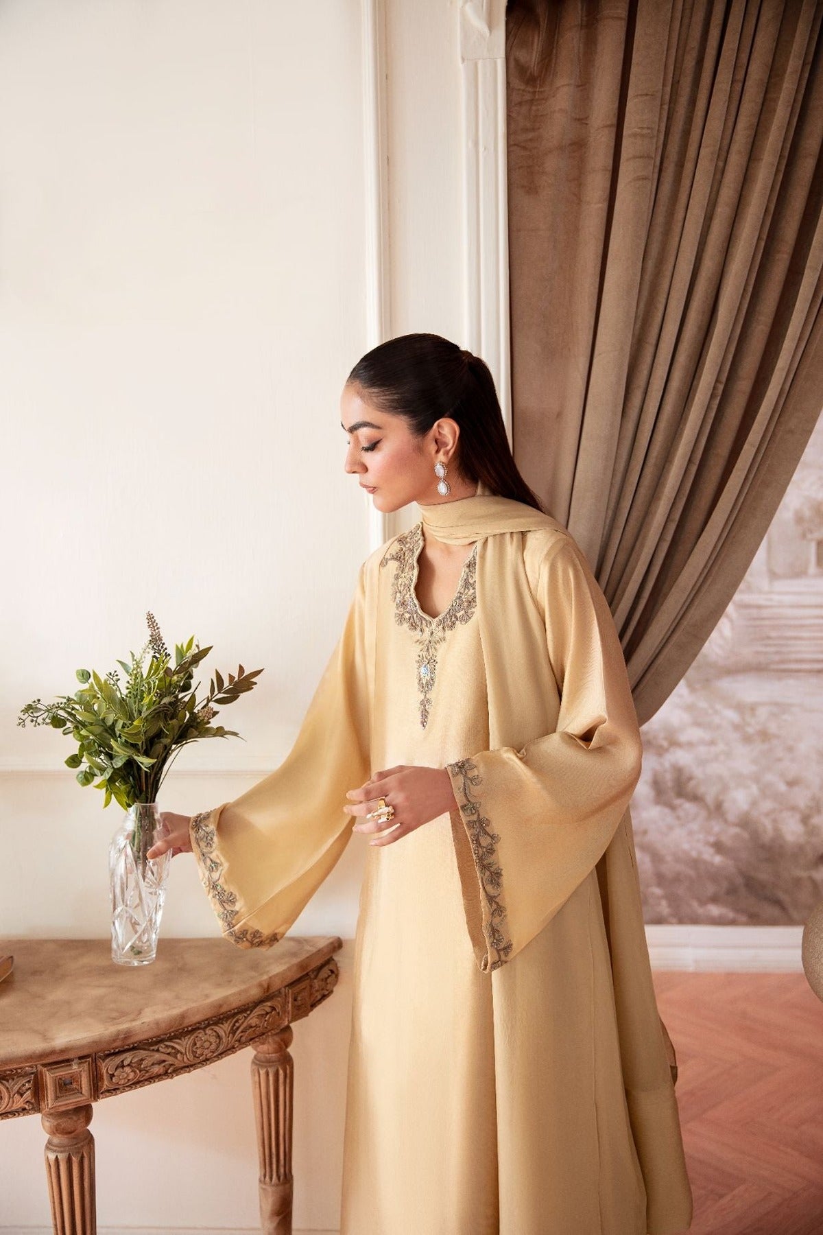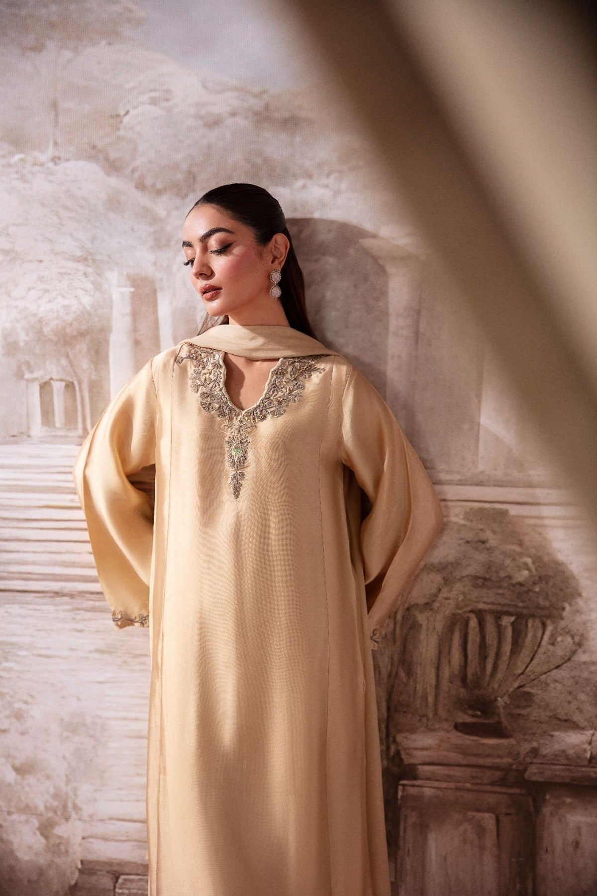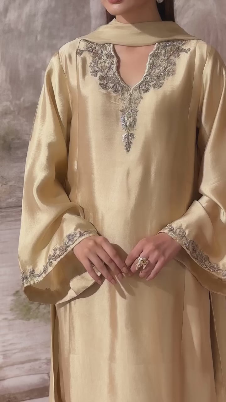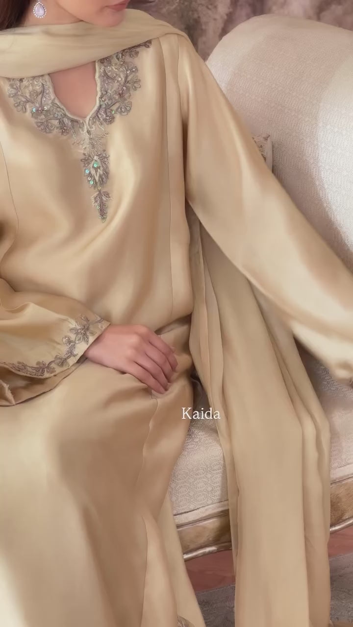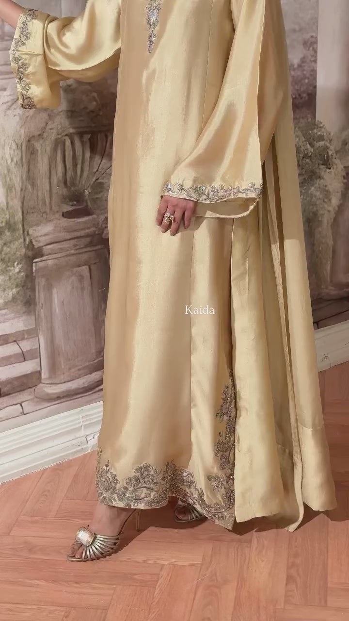 Hand embroidered base with embellishment of crystals, Katdana and sequins in monotones of Base color.