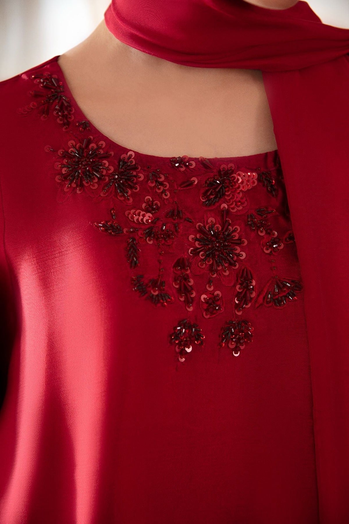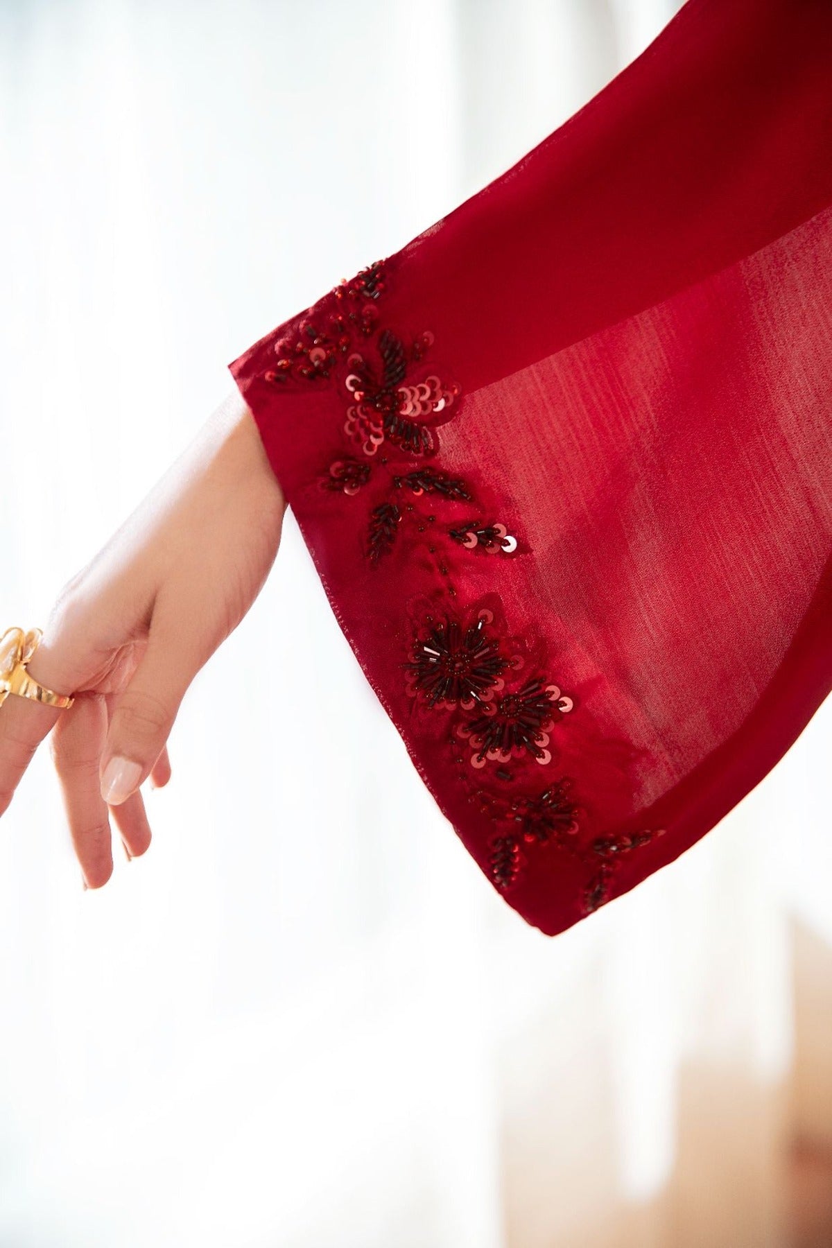 Hand embroidered base with embellishment of crystals, Katdana and sequins in monotones of Base color.