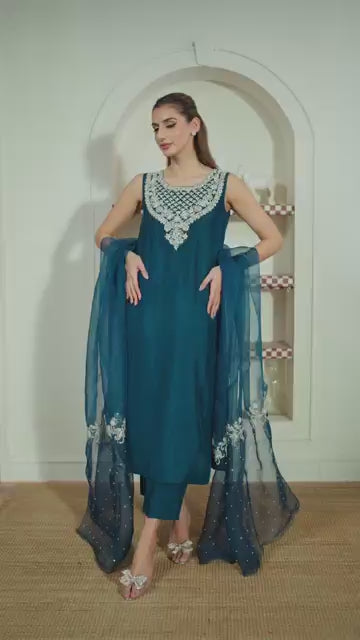 Embellishment: Purely Hand crafted embellished front and back neckline with pearls, sequins, crystals, katdana, dabka, Paired with embellished duppata.