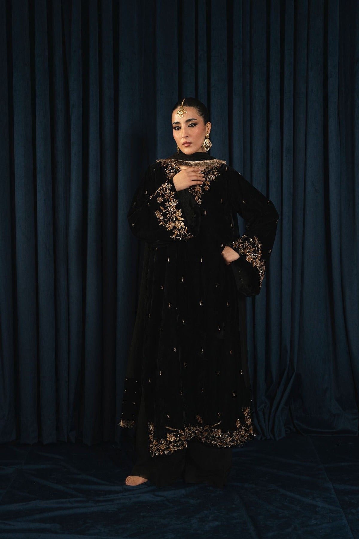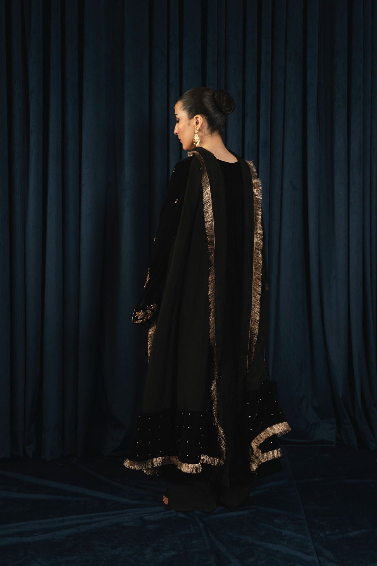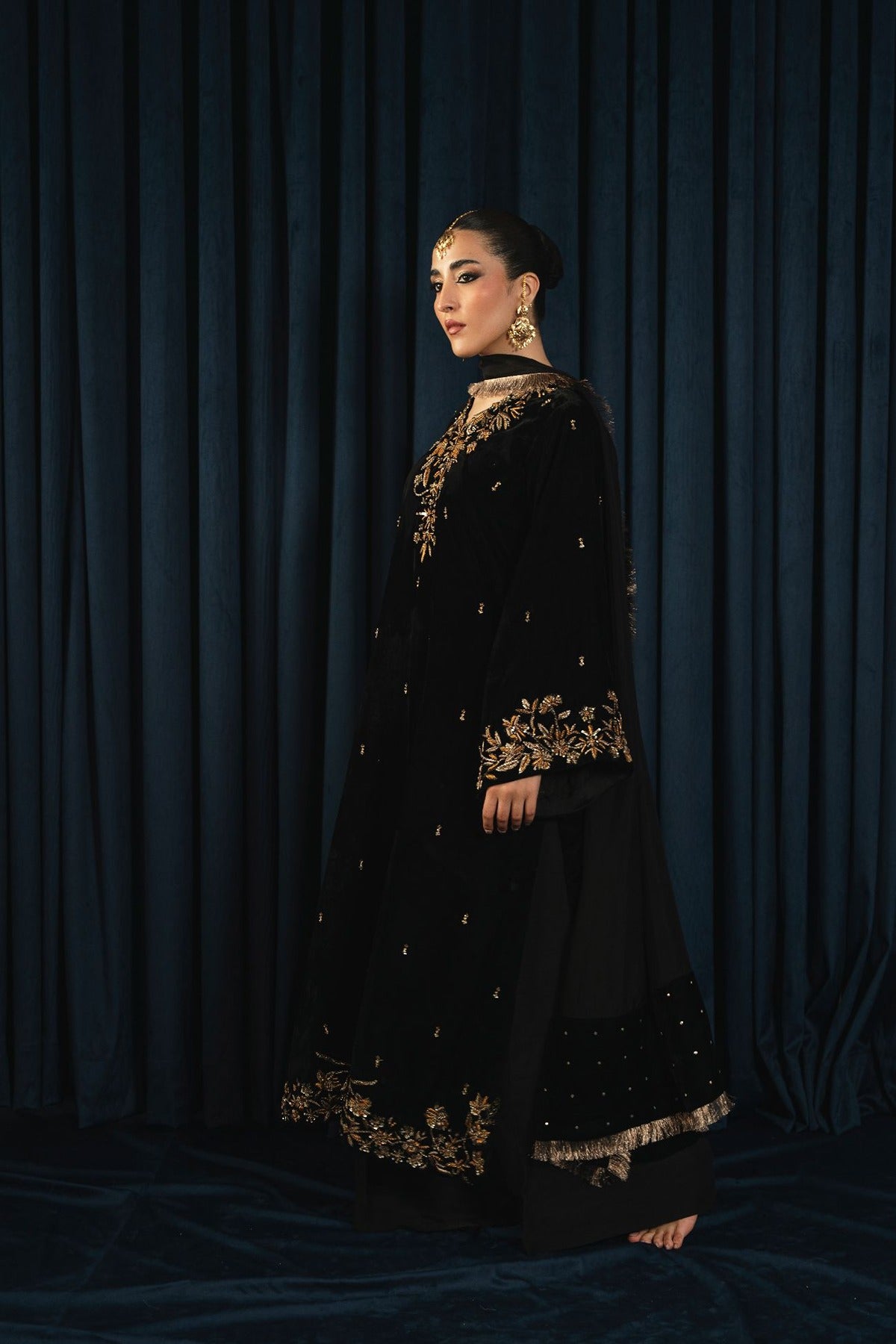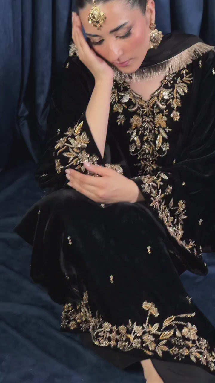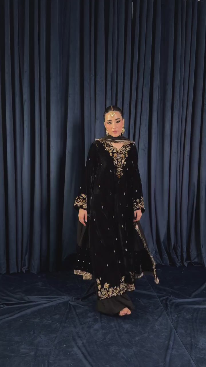 Crafted on a velvet shirt, it is adorned with intricate kora, dabka, thread work, sequins, and nakshi featuring along neckline, sleeves, and complete shirt front , enhanced with embellished scallop details. It is paired with culottes and a medium silk dupatta, finished with luxurious velvet trims for a refined, statement-making look for every occasion.