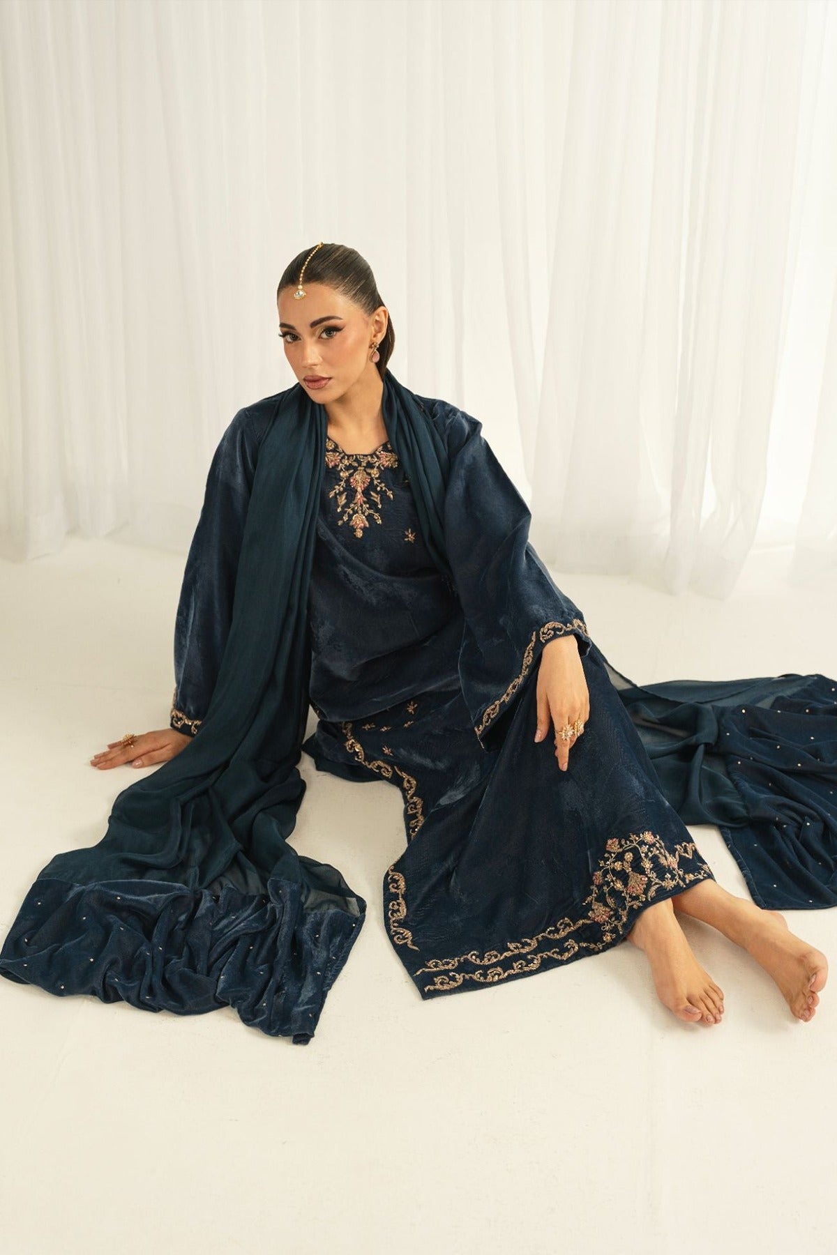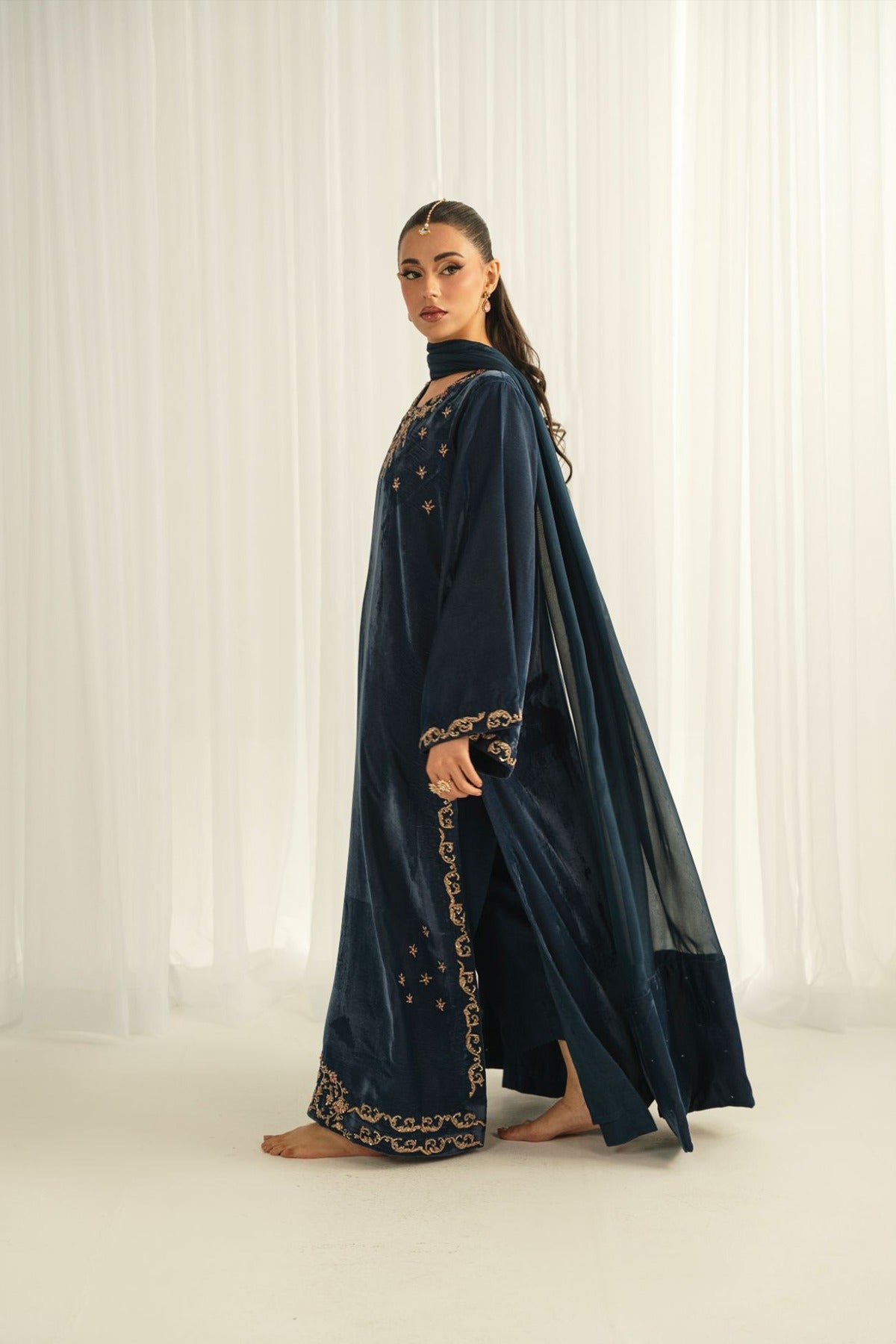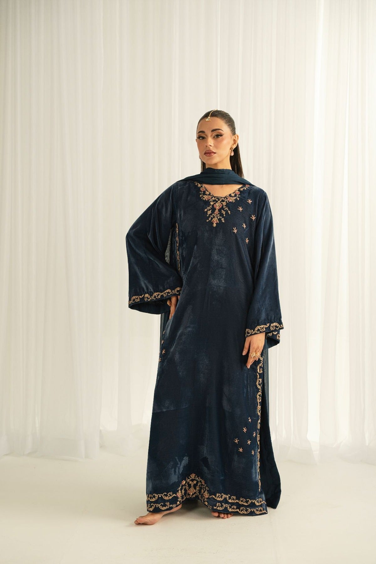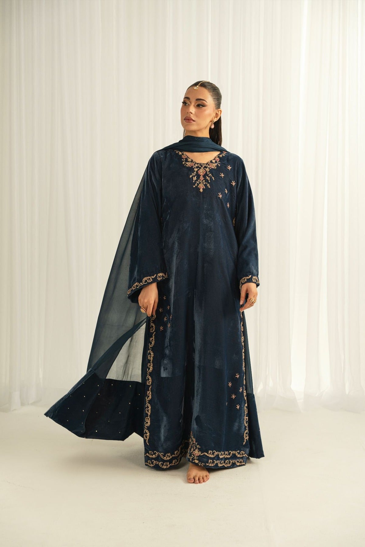 Crafted on a velvet shirt, it is adorned with intricate kora, dabka, thread work, sequins, and nakshi featuring along neckline, sleeves, and complete shirt front , enhanced with embellished scallop details. It is paired with plain pants and a medium silk dupatta, finished with luxurious velvet trims for a refined, statement-making look.