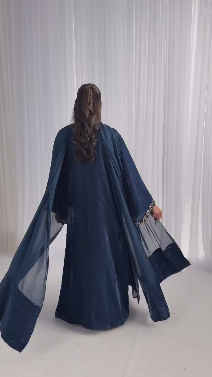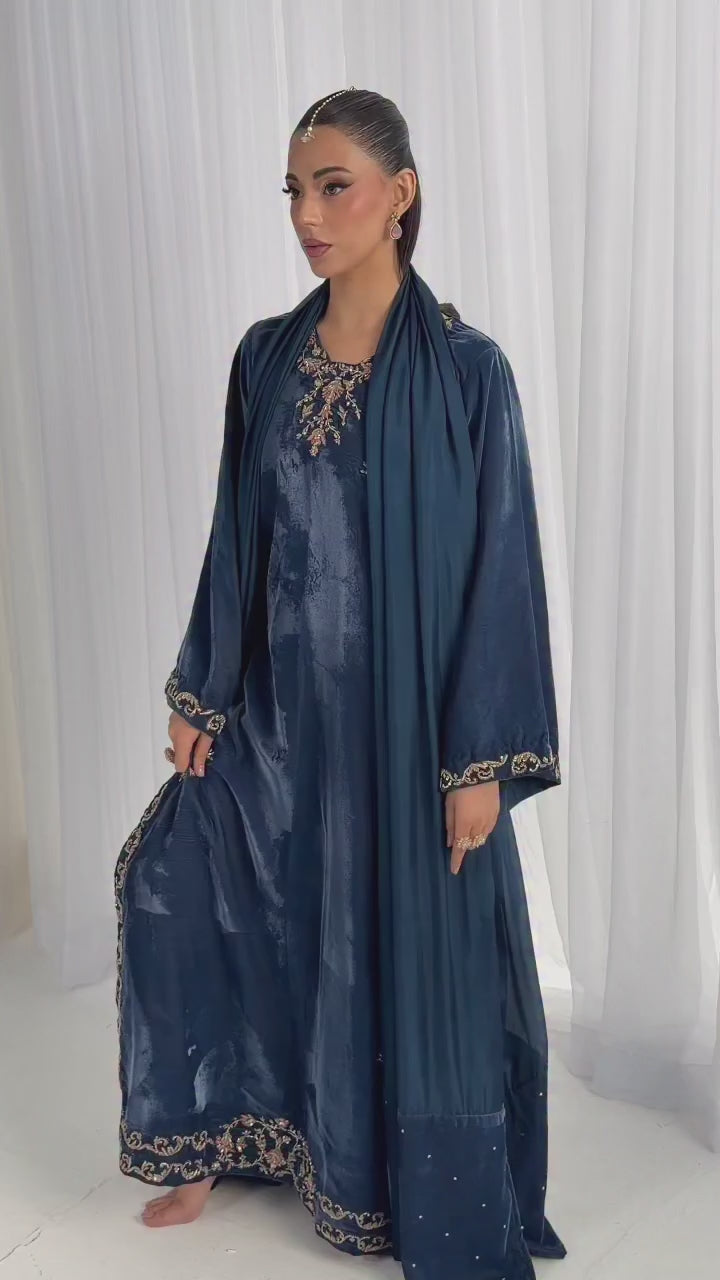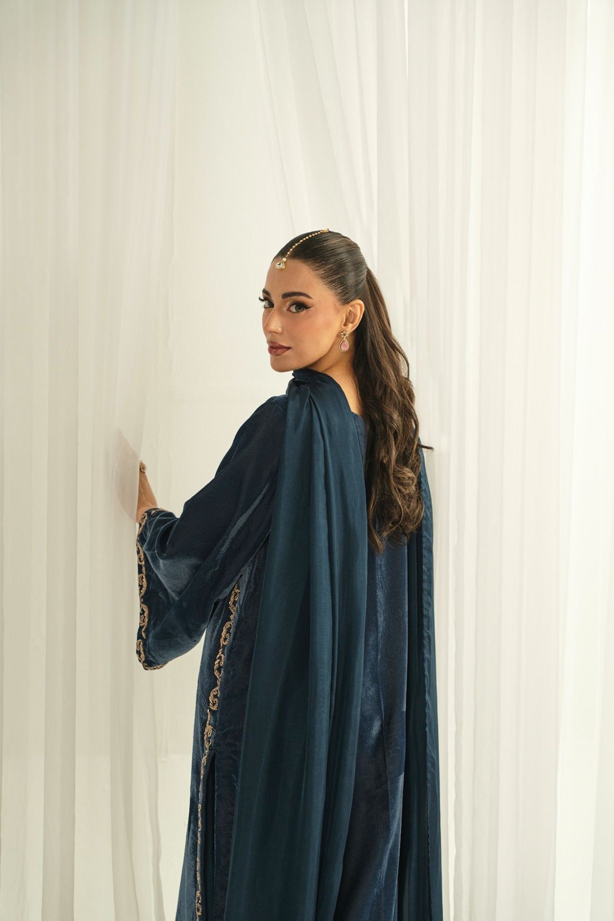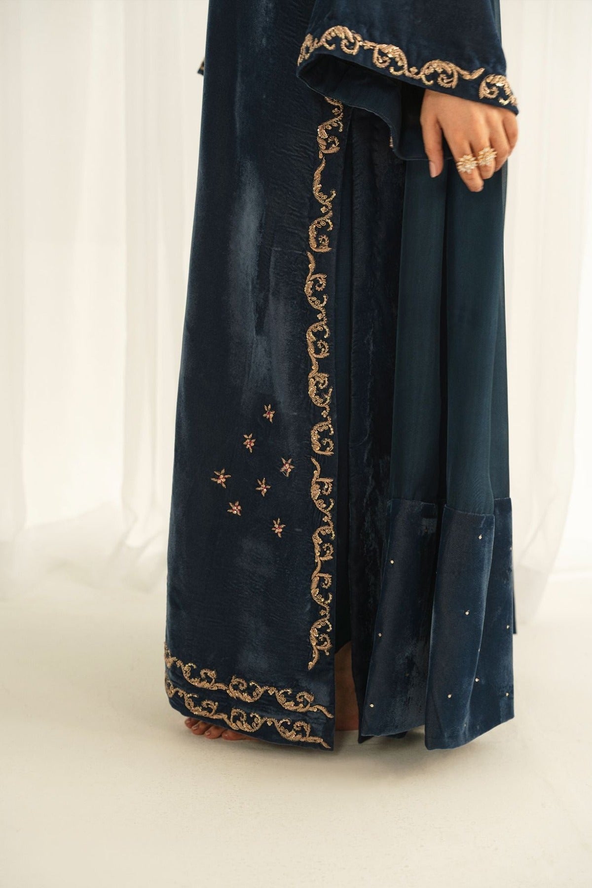 Crafted on a velvet shirt, it is adorned with intricate kora, dabka, thread work, sequins, and nakshi featuring along neckline, sleeves, and complete shirt front , enhanced with embellished scallop details. It is paired with plain pants and a medium silk dupatta, finished with luxurious velvet trims for a refined, statement-making look.
