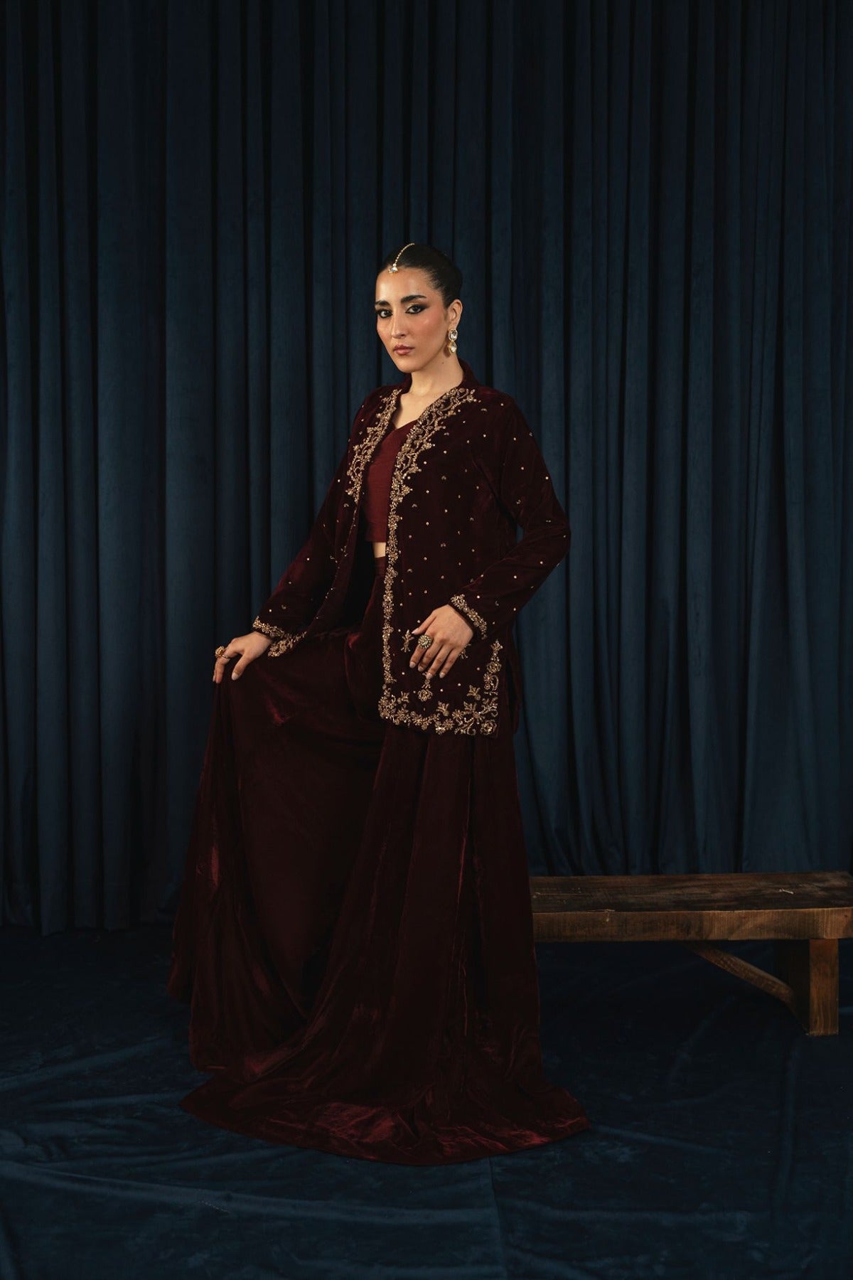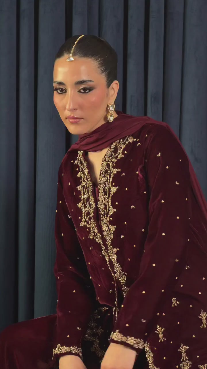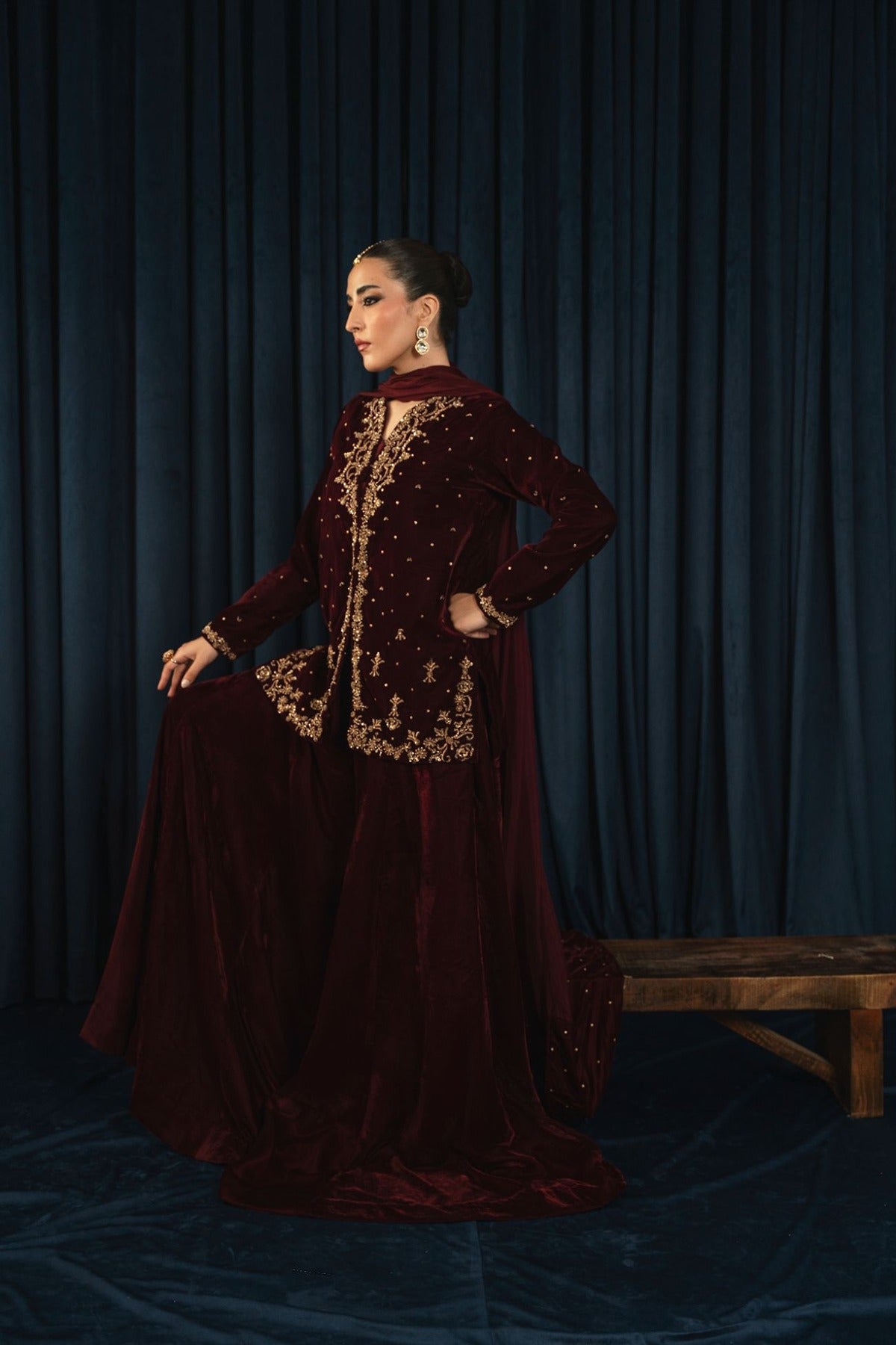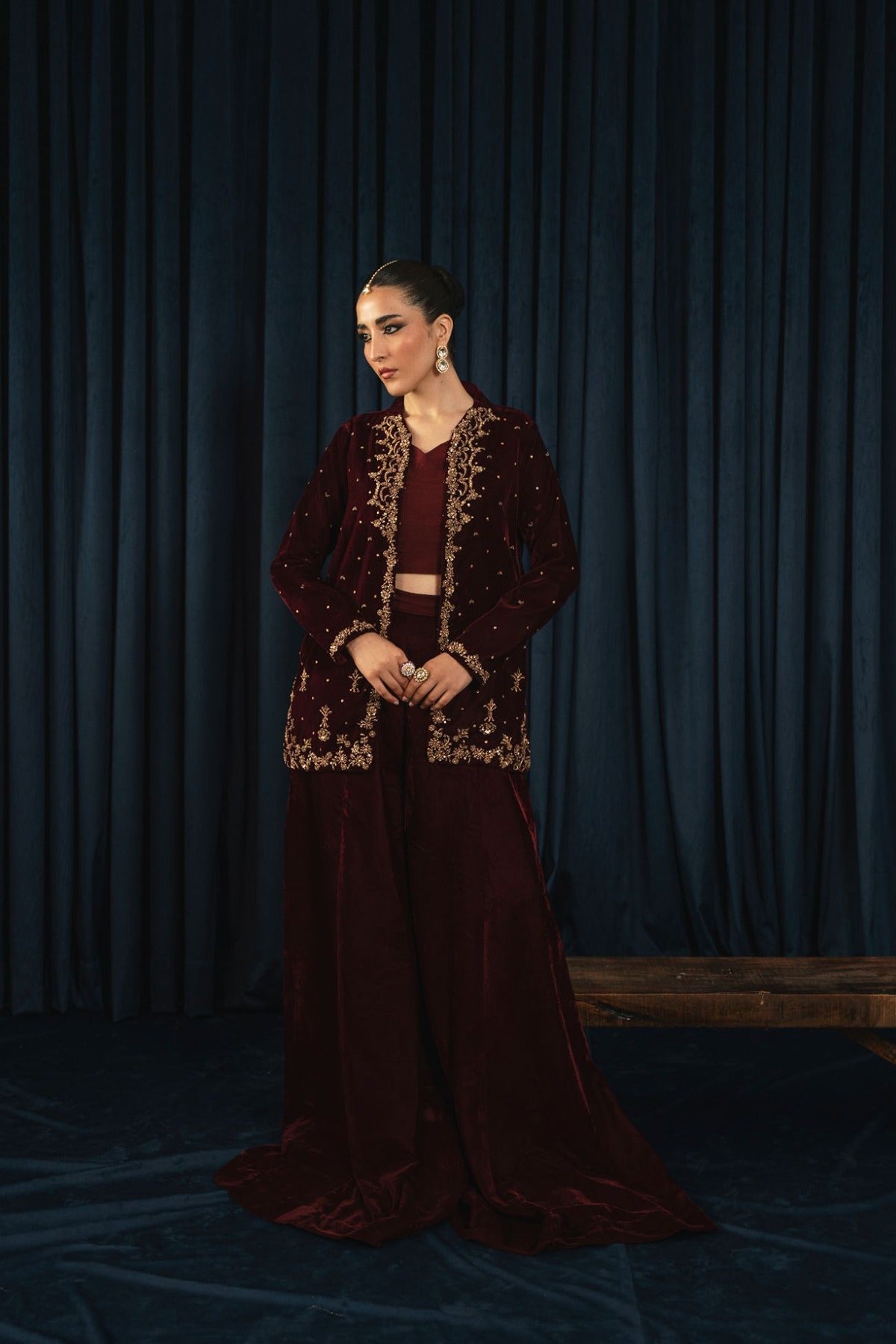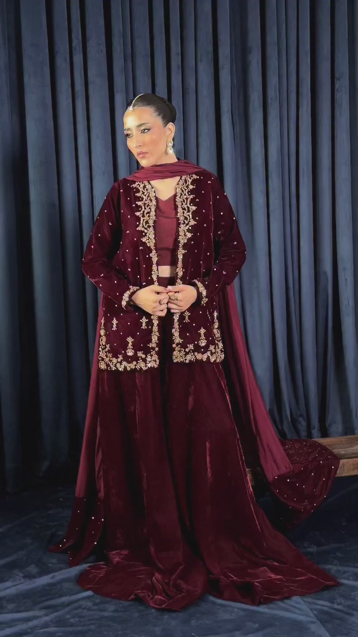 This velvet jacket is beautifully embellished with intricate kora, dabka, sequins, and nakshi, adding a touch of opulence. It is paired with a velvet culottes, creating a stylish and modern ensemble that's both chic and sophisticated.