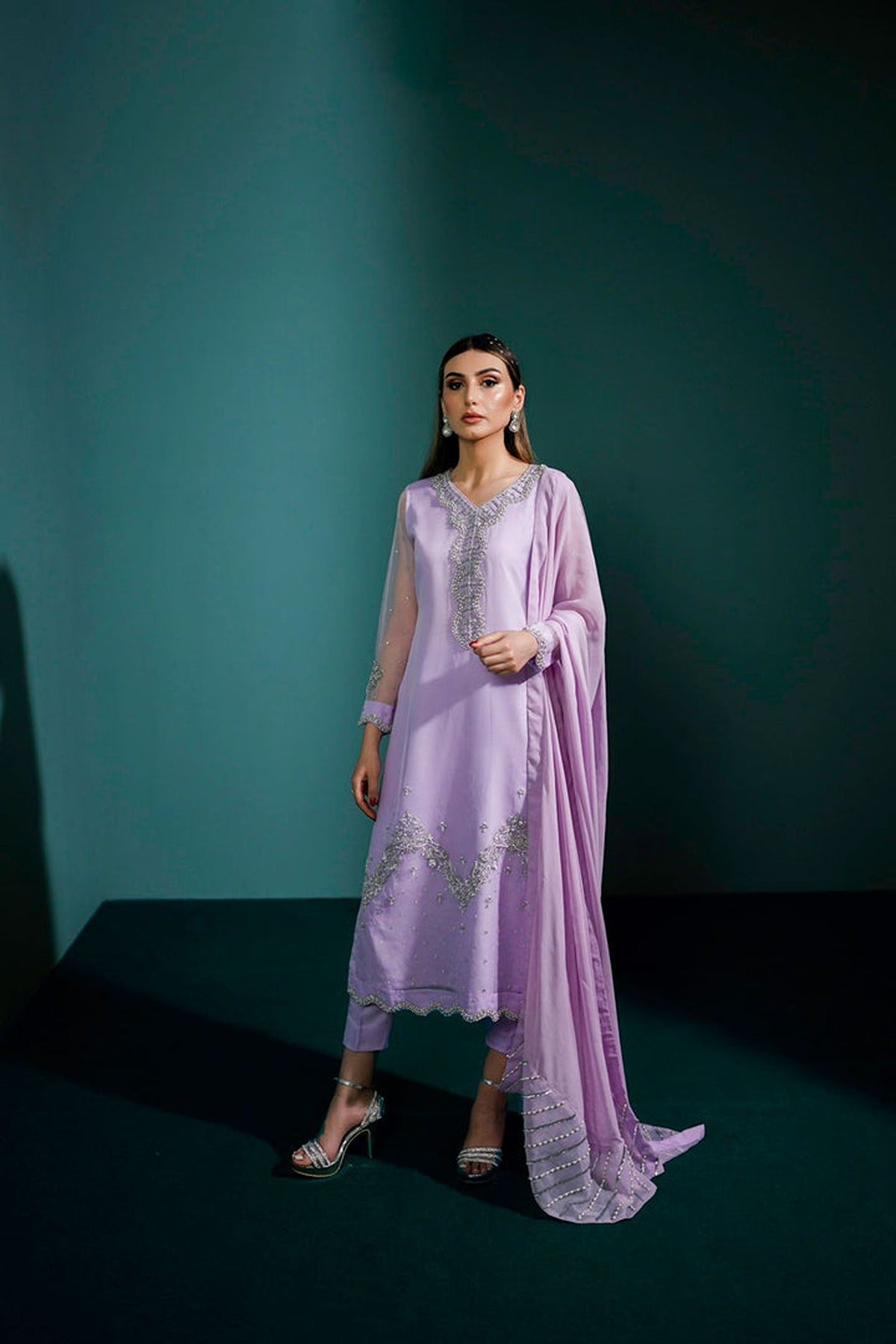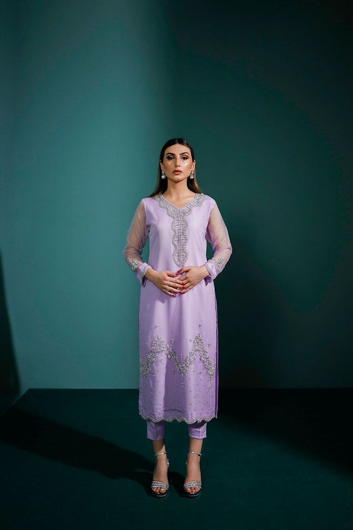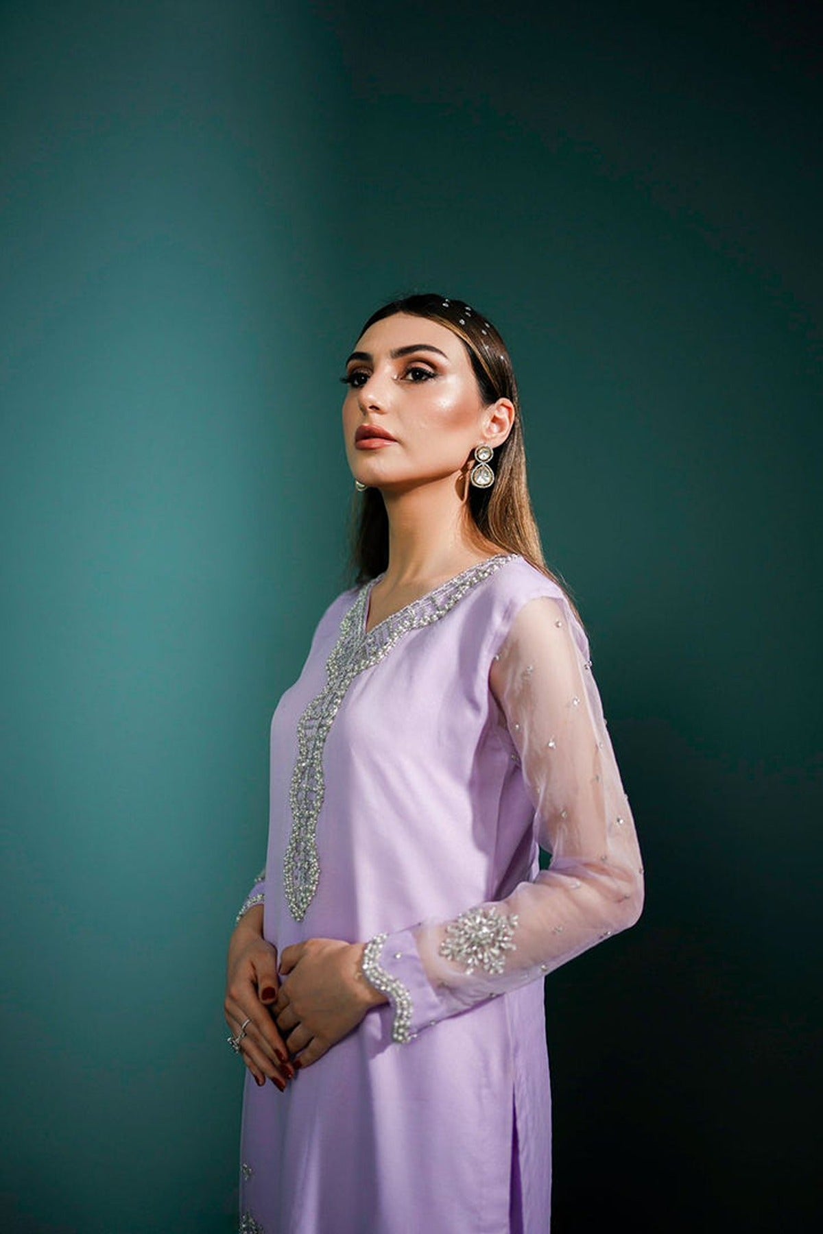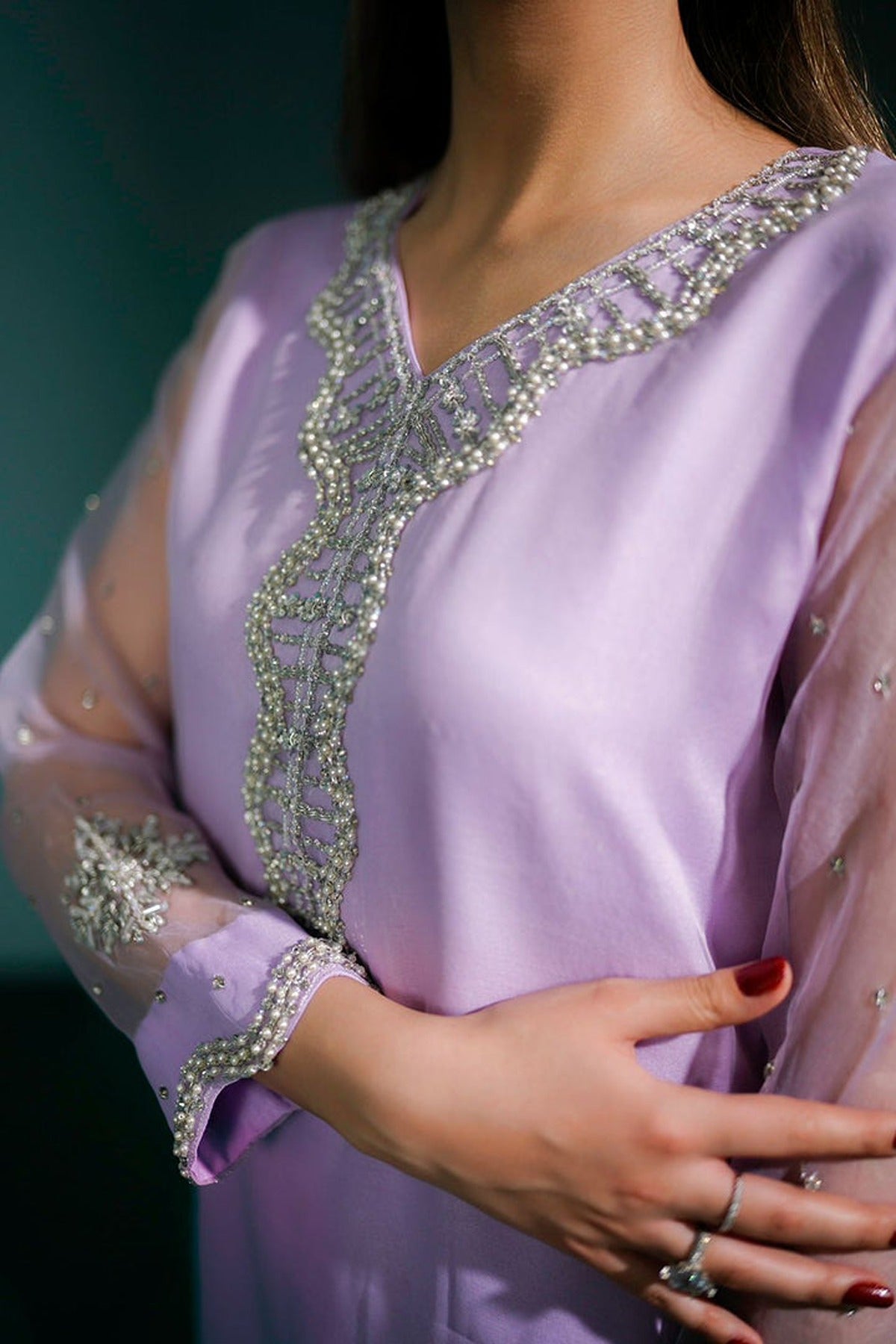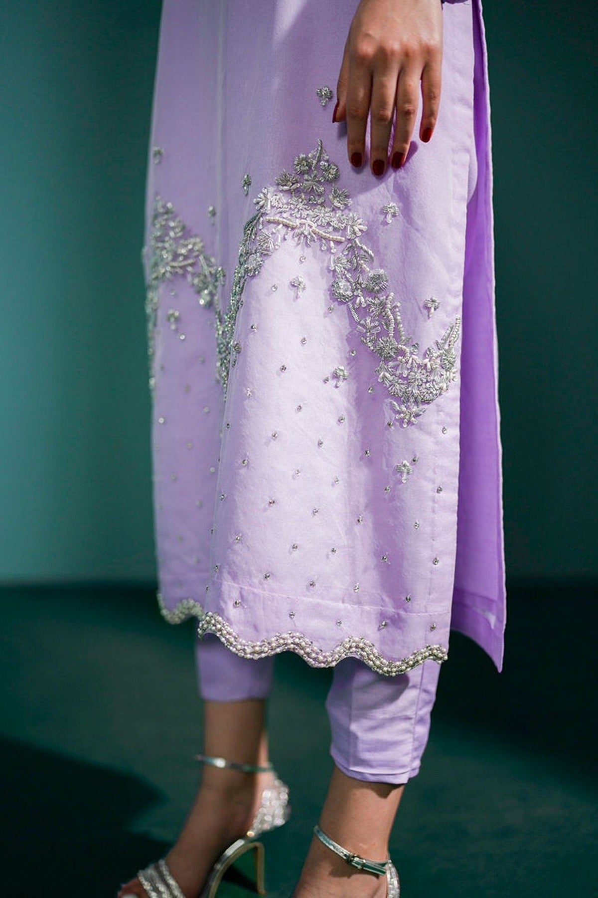 This organza long shirt is the unique blend of traditional and modern elements. It is detailed with handcrafted in silver zardoze along the neckline , sleeves and daaman. The dupatta with 2 side heavy border makes for a beautiful drape to complete the look. It is paired with tonal pants.