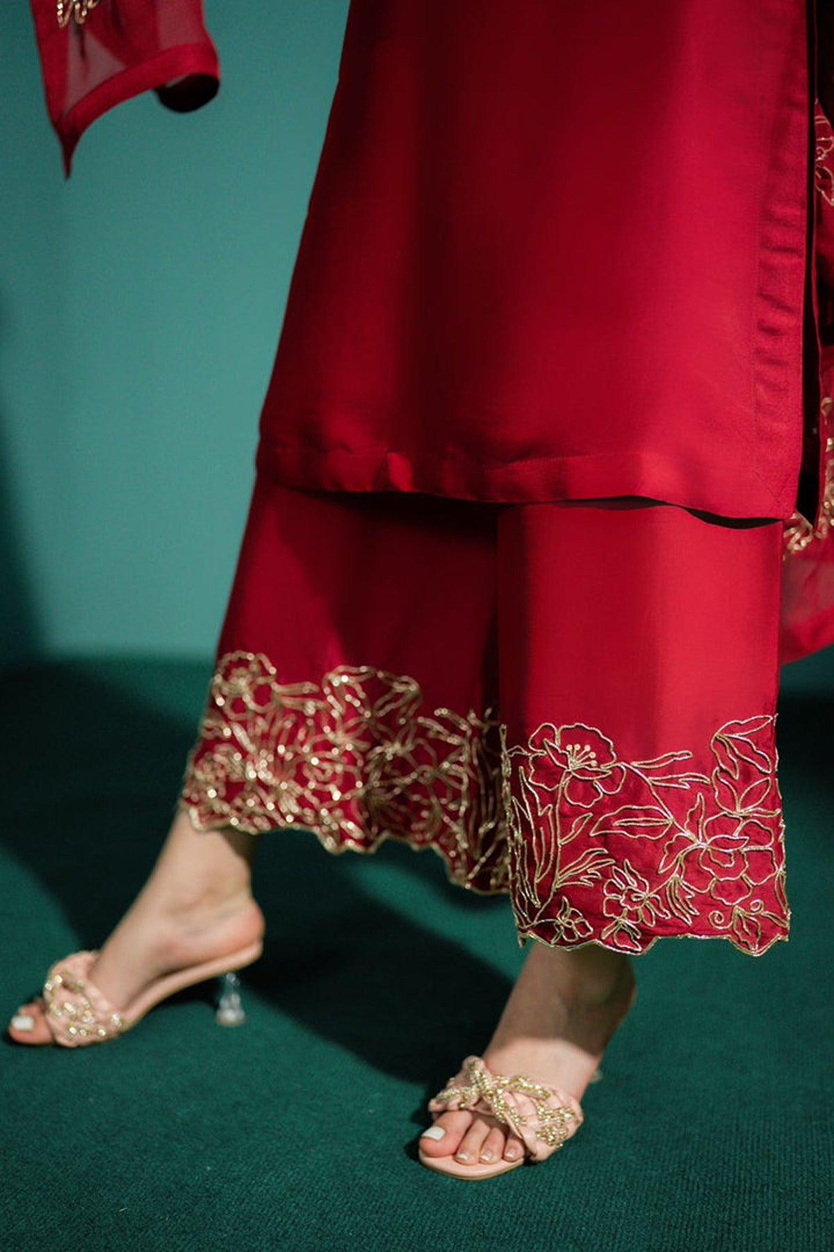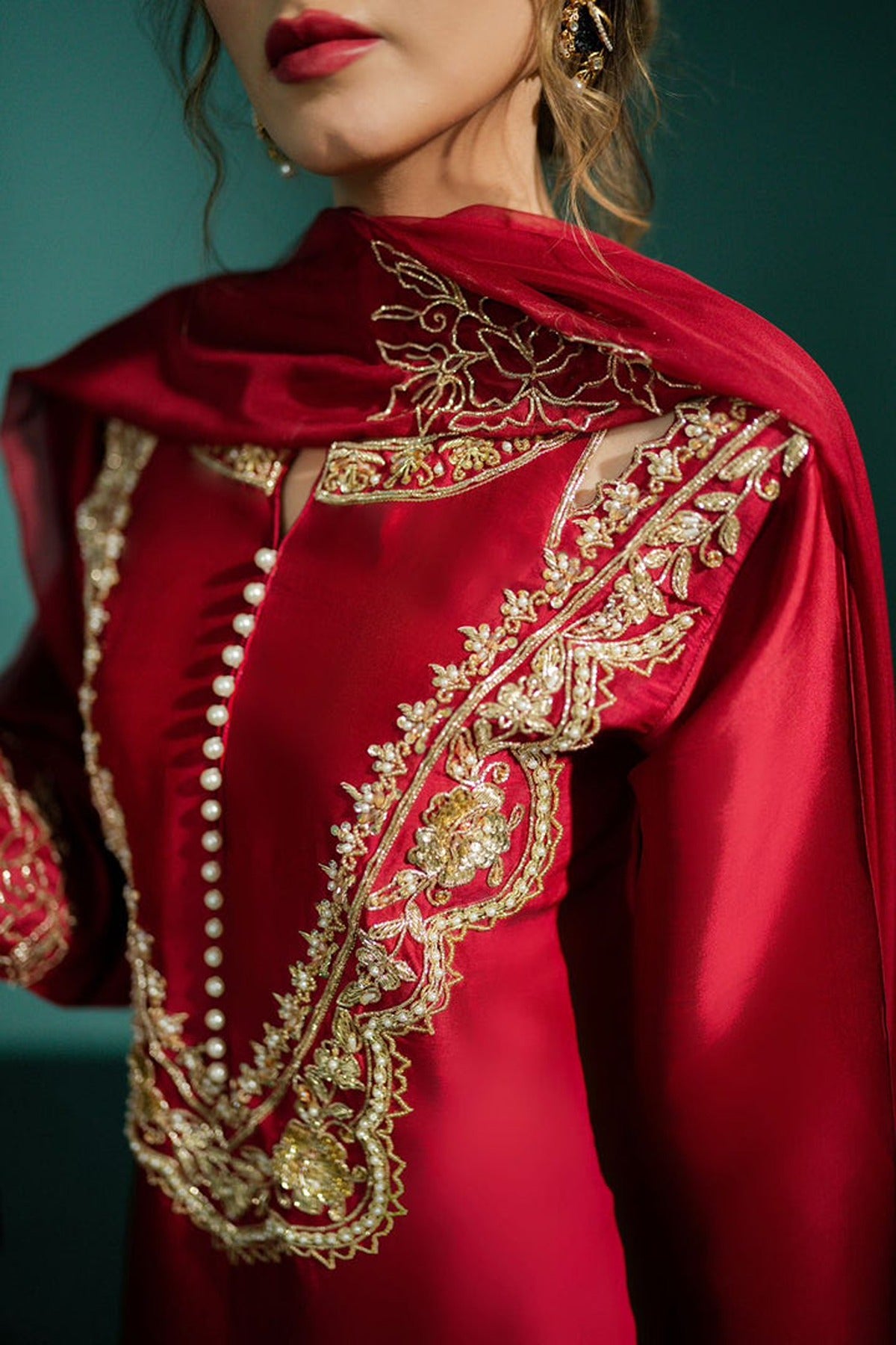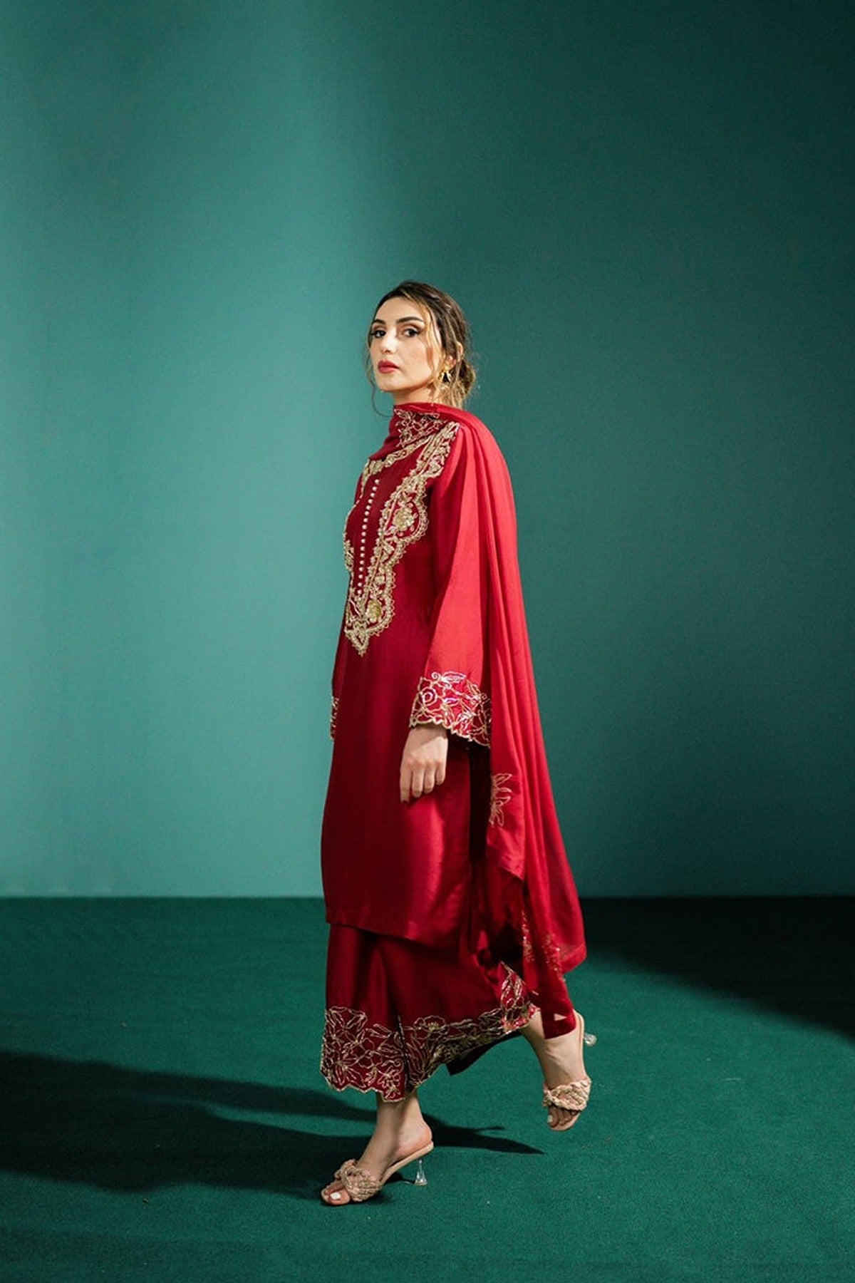 This eye catching shade of Cherry Red in Pure Sheesha silk ensemble includes a straight shirt with bell sleeves paired plazzo pants. The intricating Golden neckline with shoulder cut & the Gorgeous embellished dupatta is taking the outfit to another level.