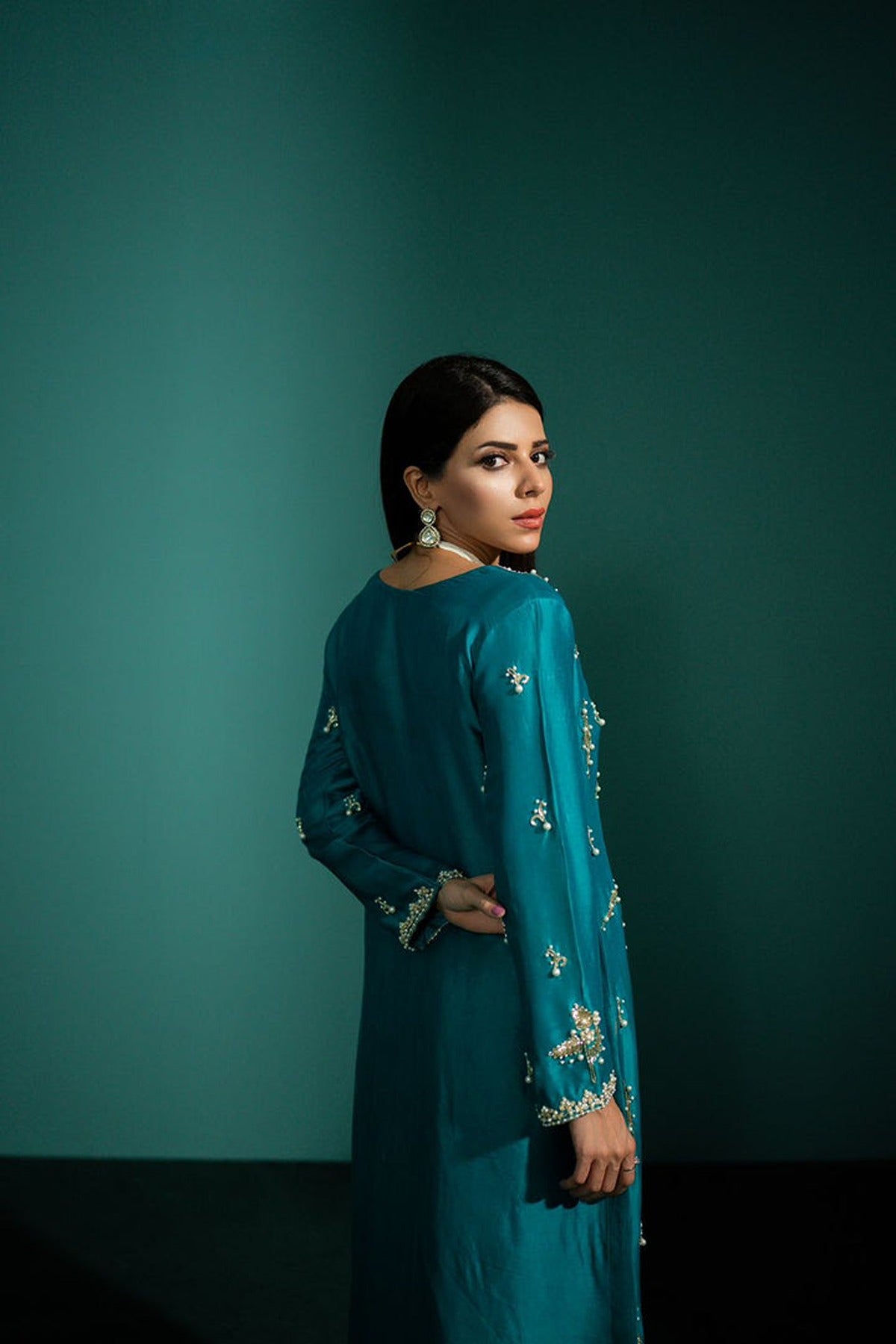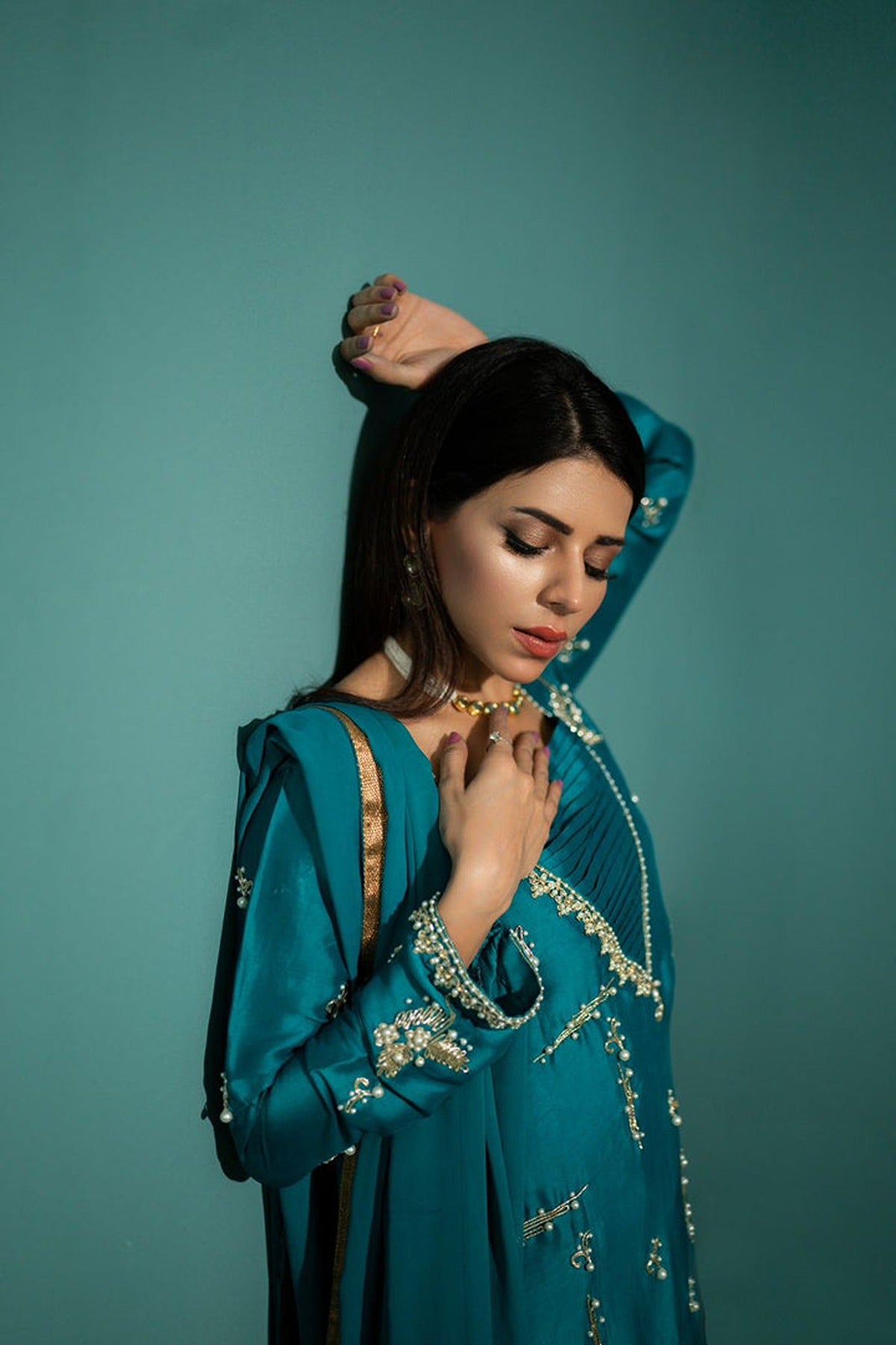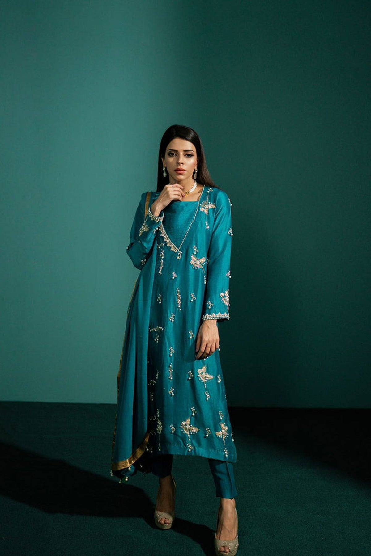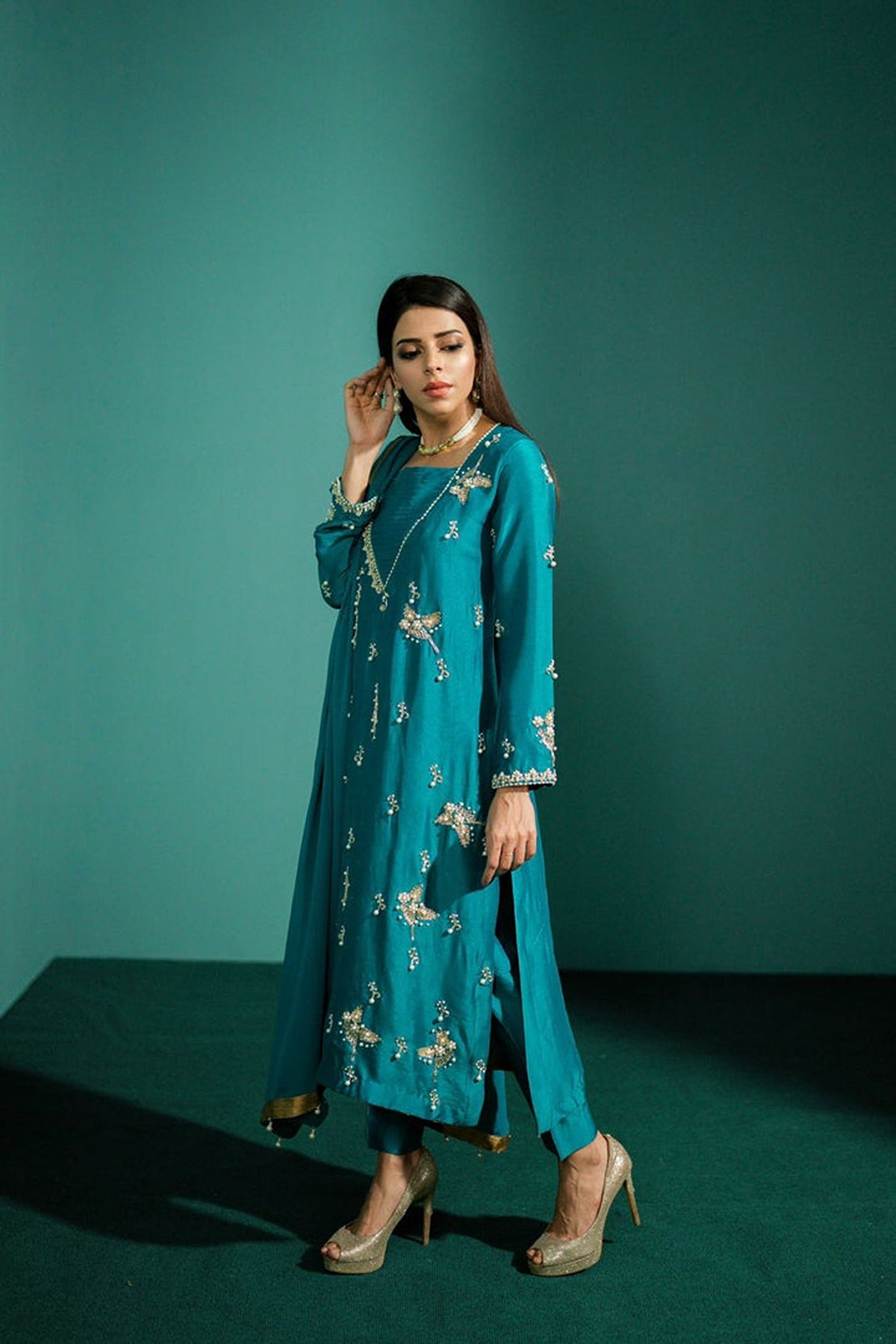 Turquoise Pure Silk tunic has a V neck adorned with naqshi & pearl. It is paired with tonal cigarette pants & dupatta, the Dupatta is finished of with golden lace & pearl tassels.