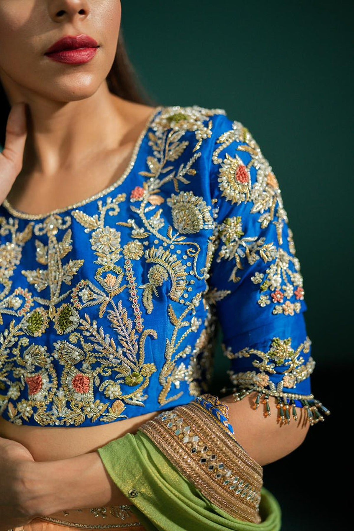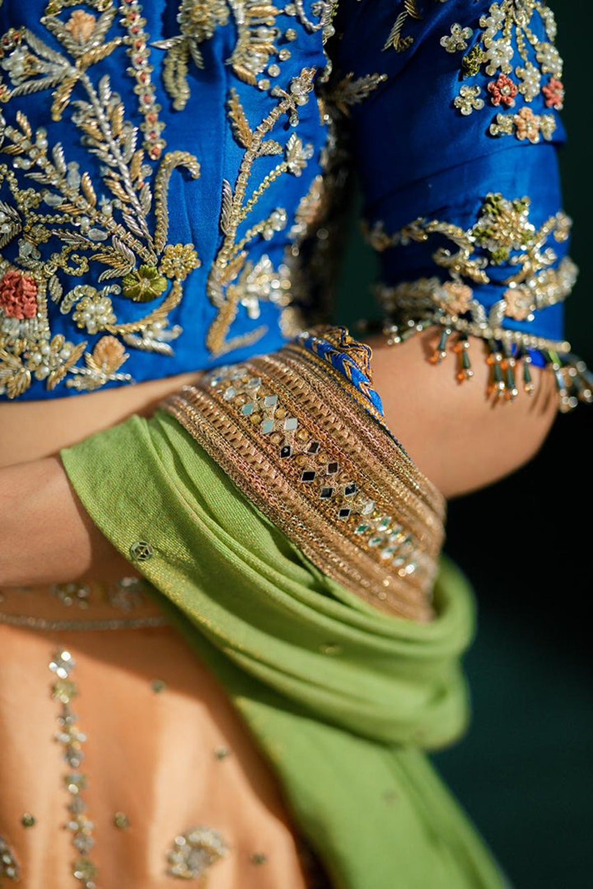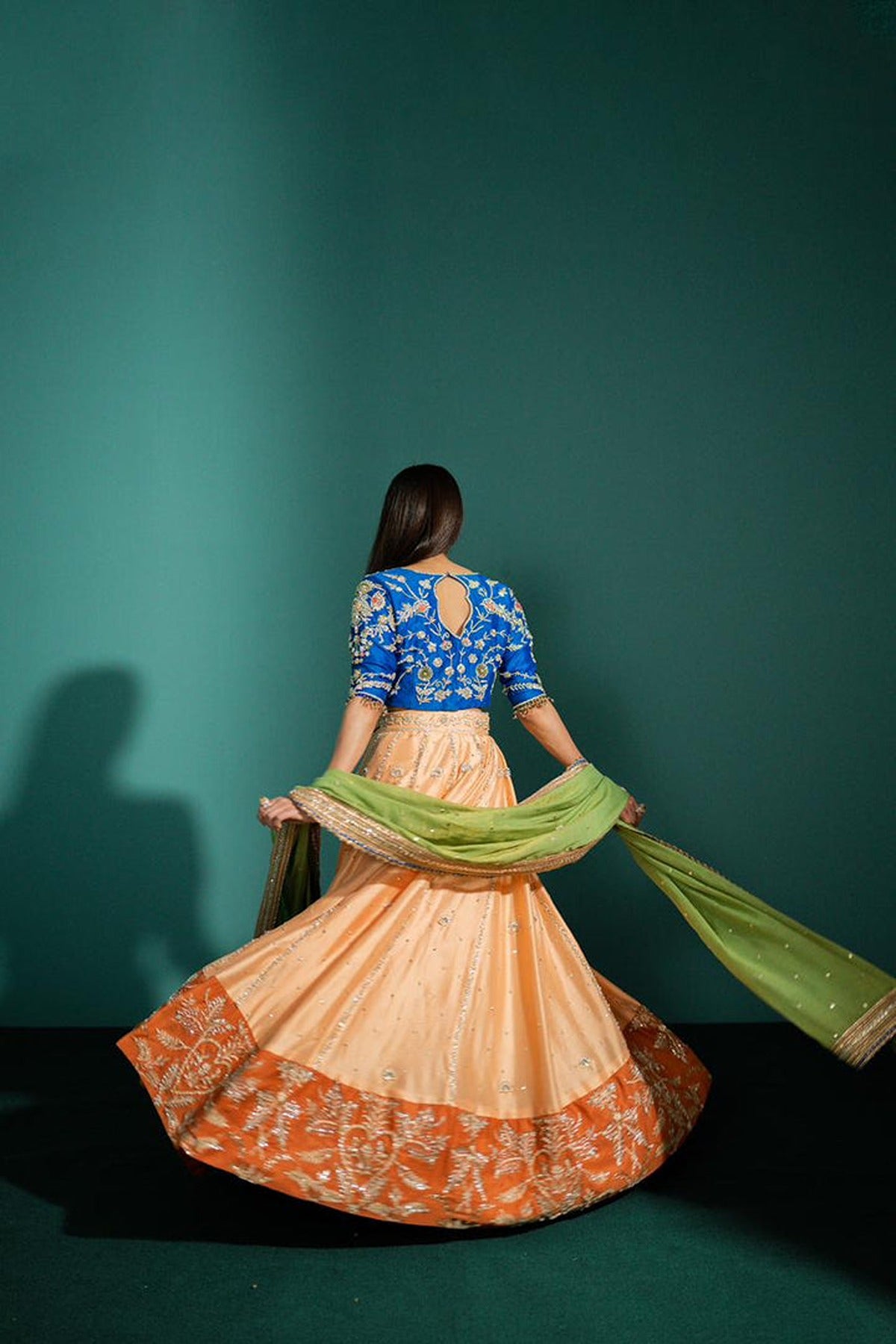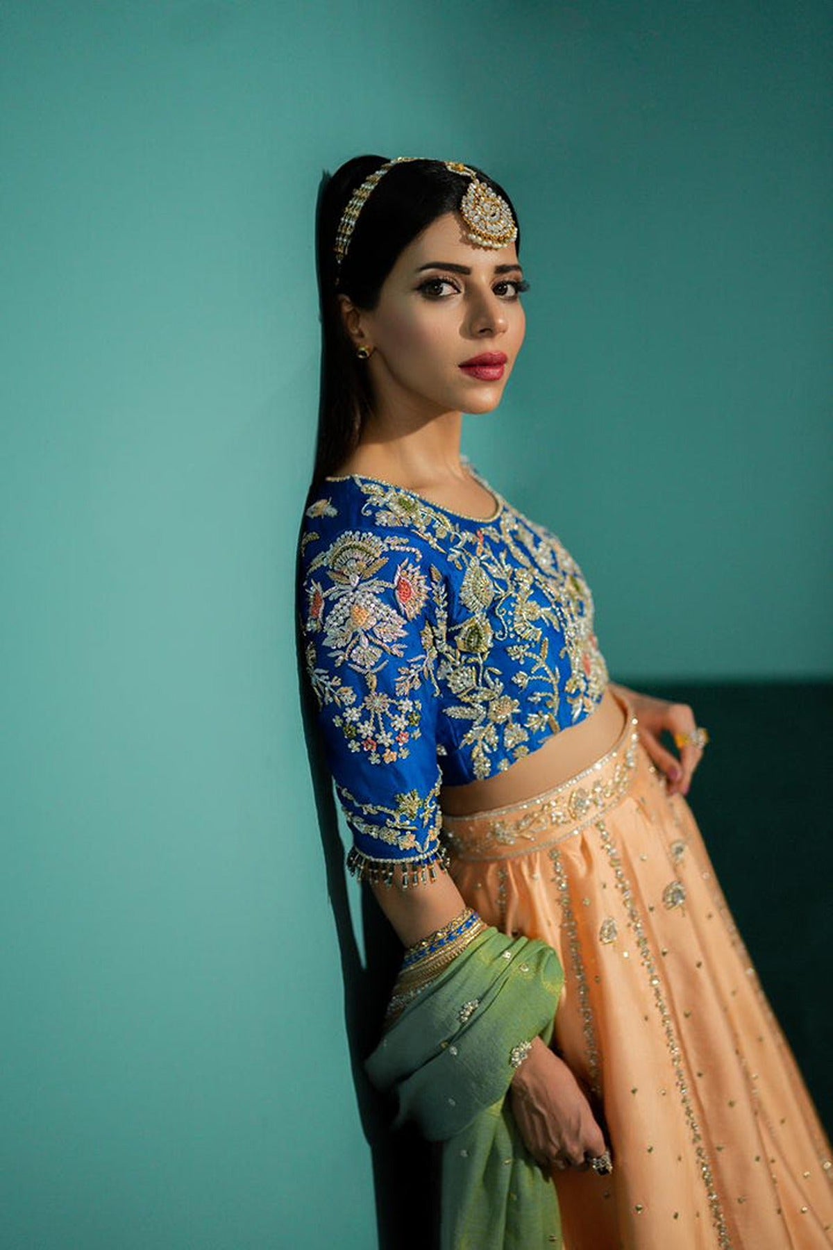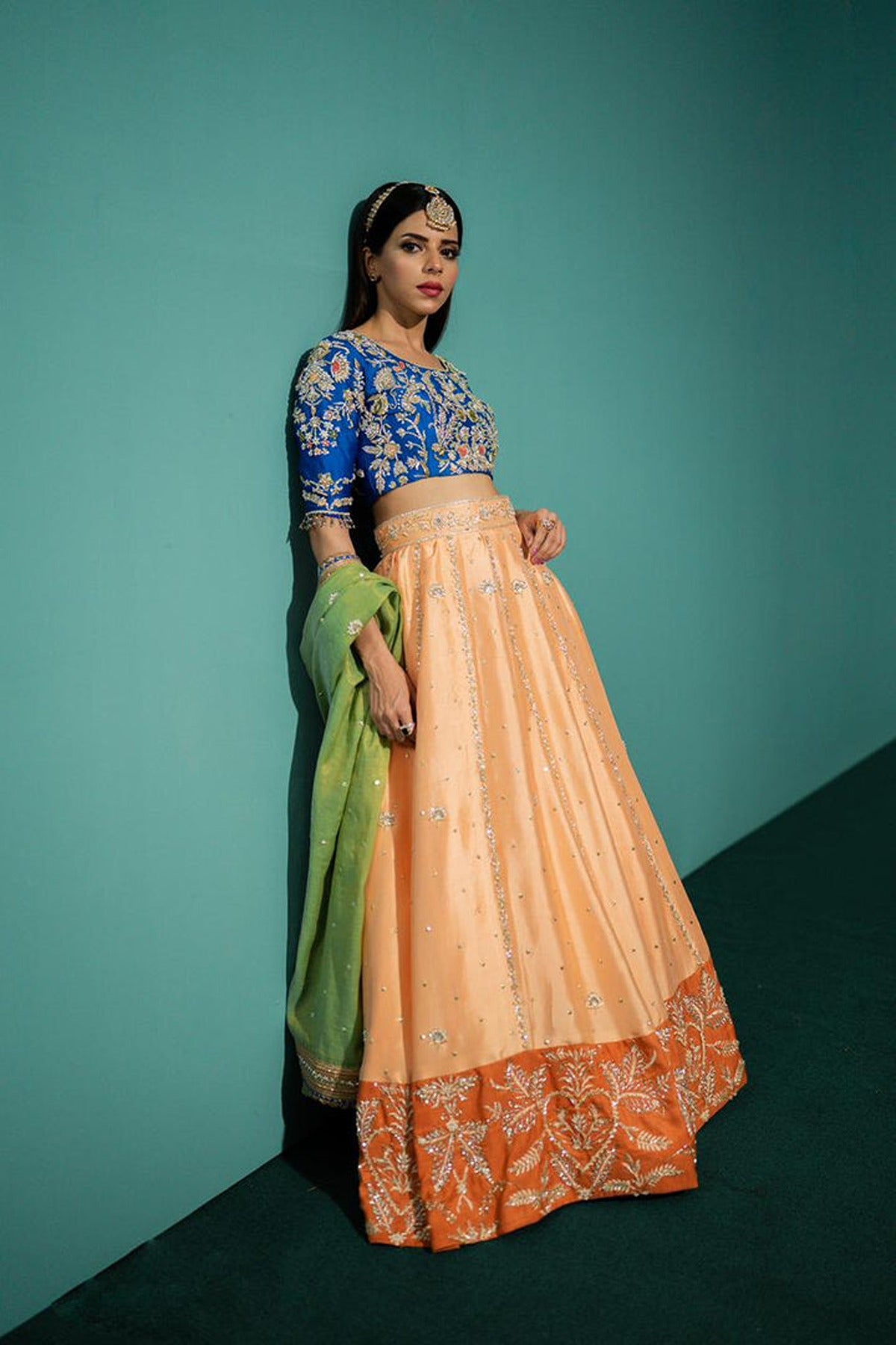 This Lehnga & Choli is made on Pure sheesha silk canvas with handwork all over the blouse & Lehnga. Masuri Dupatta with lace borders along with Chan and booti all over it. Three contrasting colors are making this outfit perfect for a mehndi look.