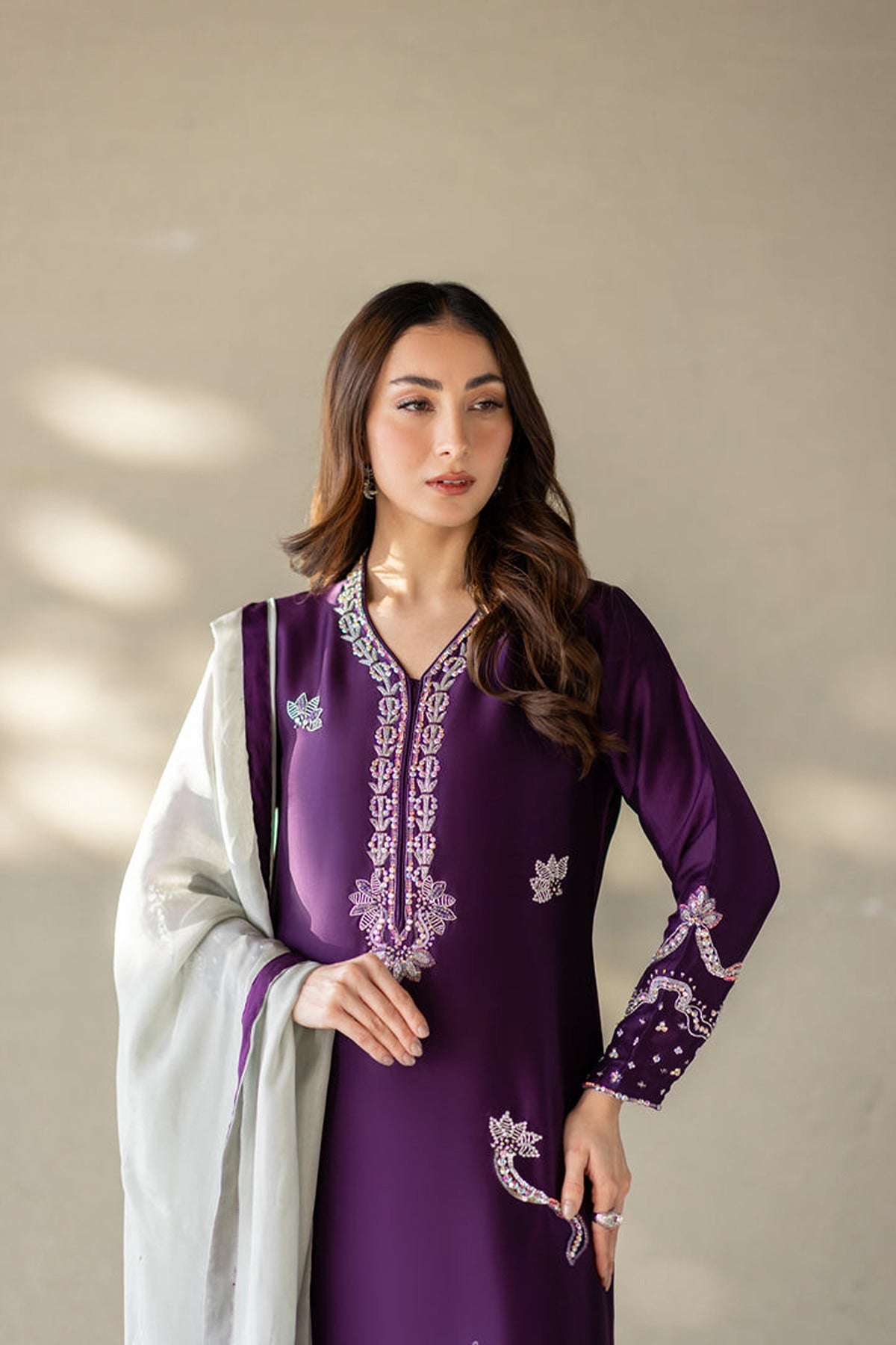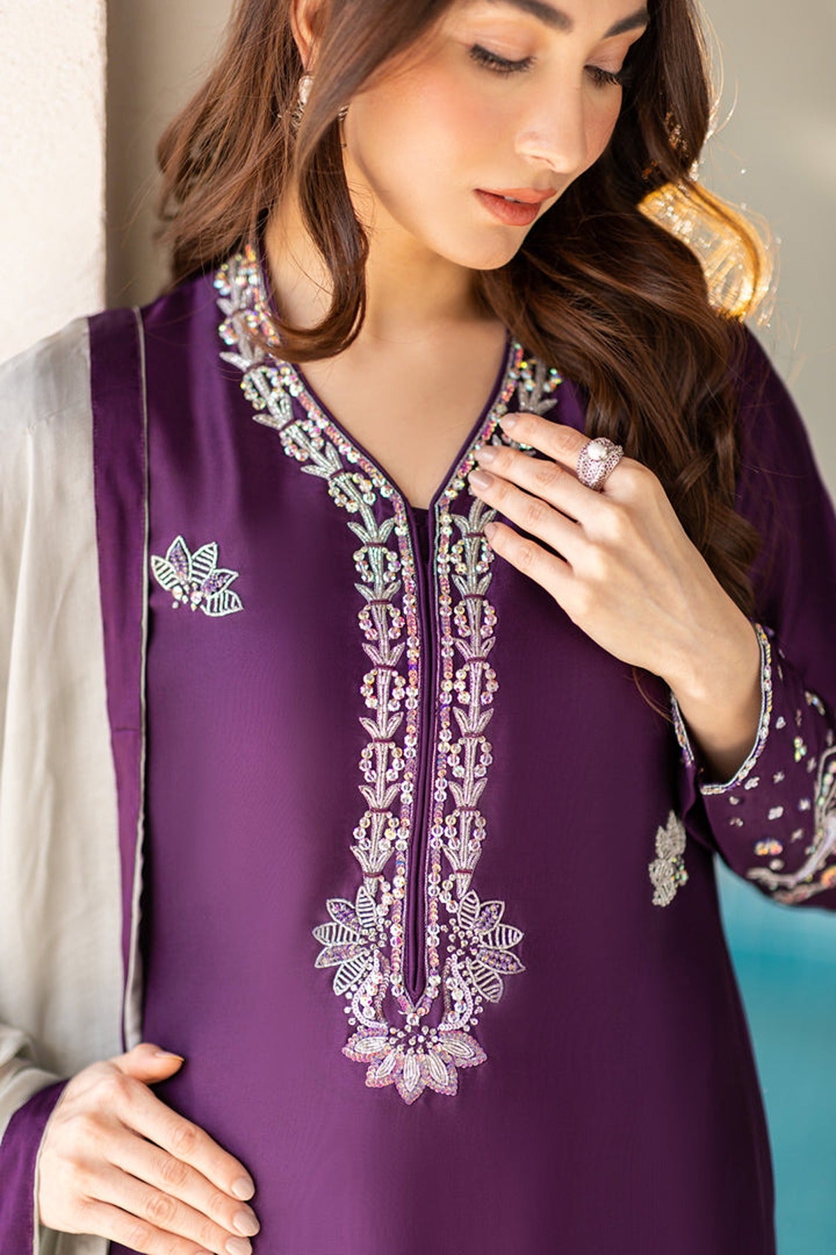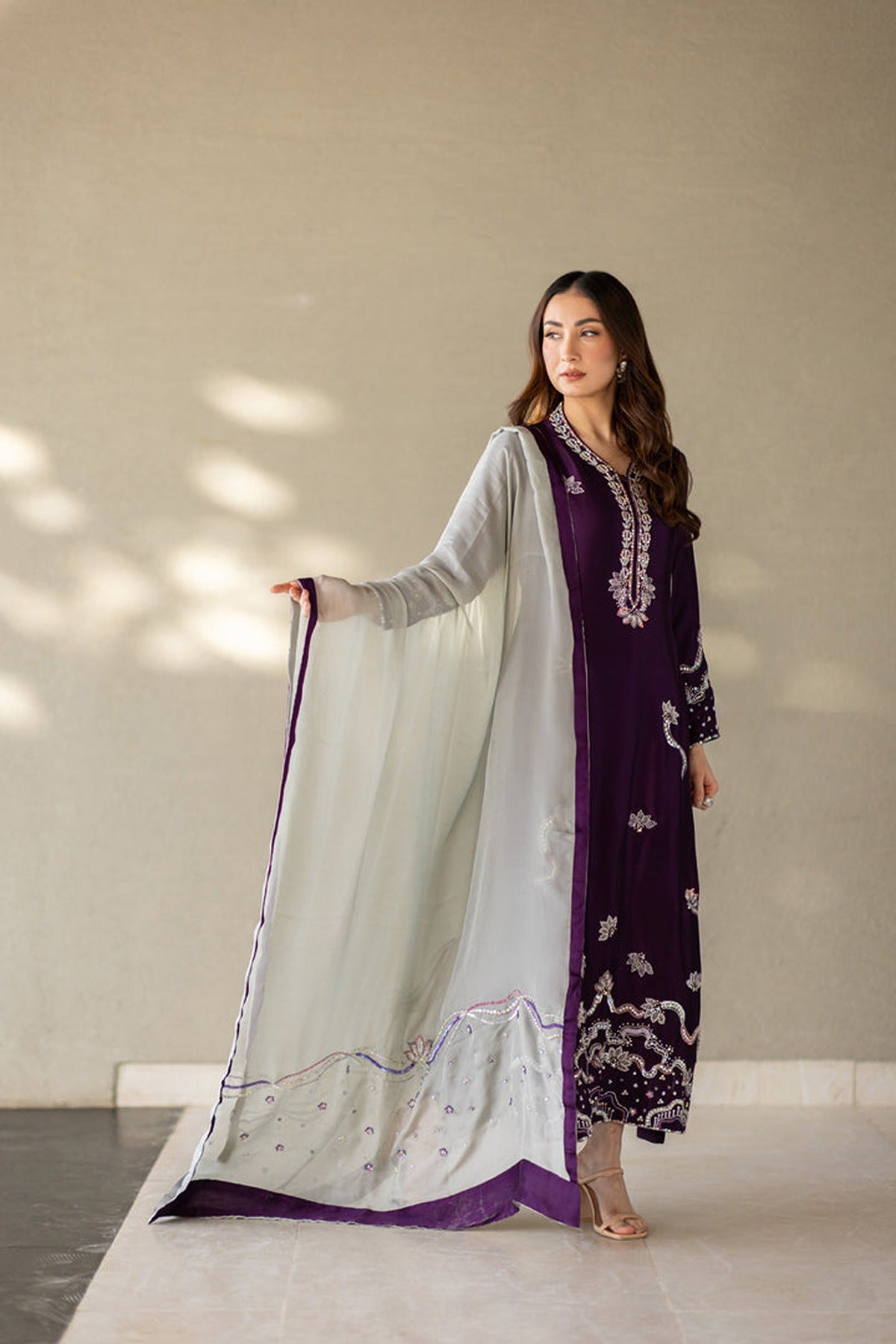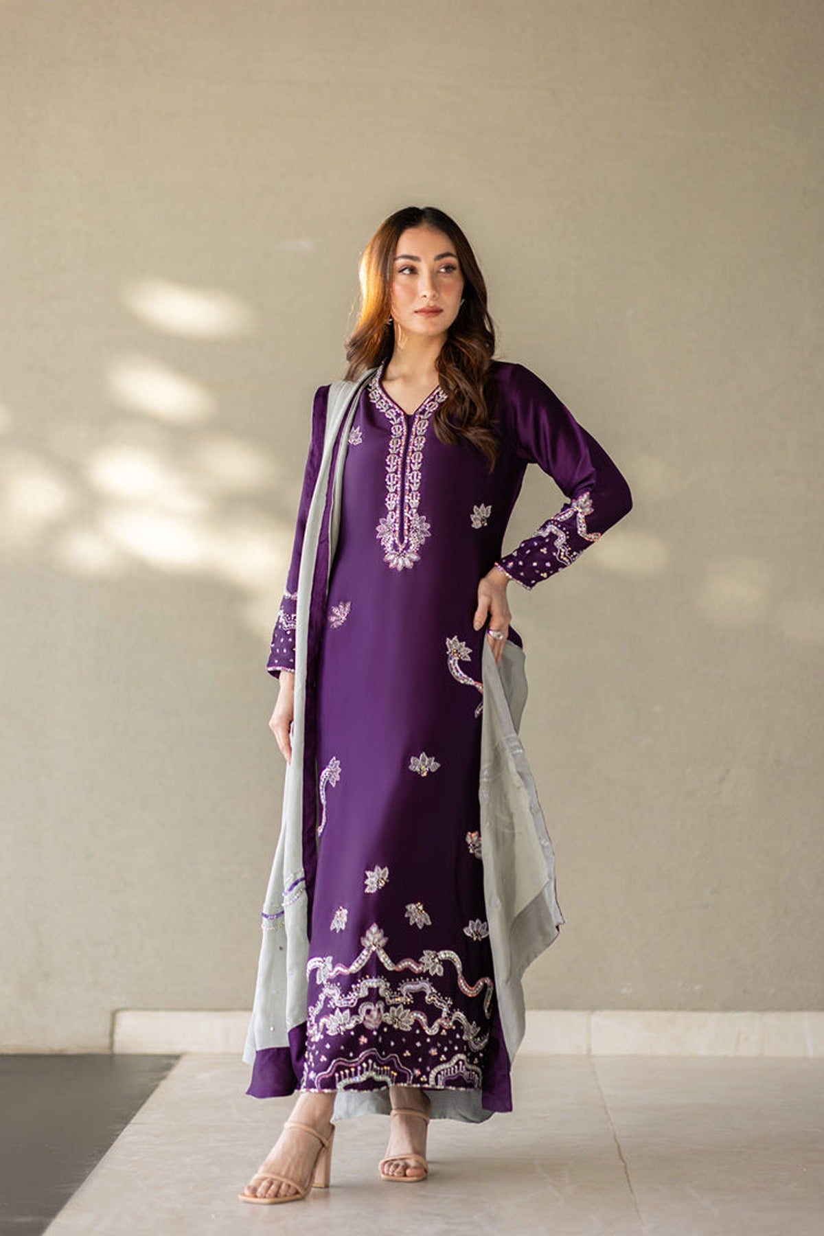 This is a captivating ensemble crafted from premium pure silk. Featuring a brinjal purple long-cut shirt adorned with exquisite Swarovski, colored sequins, kora dabka & naqshi work, the neckline & daman adds a touch of opulence and glamour to the ensemble, ensuring you stand out with effortless grace and charm. Paired with straight pants and an grey Pure silk handwork dupatta with purple facing. A stunning blend of bold hues and delicate craftsmanship, perfect for a sophisticated statement.