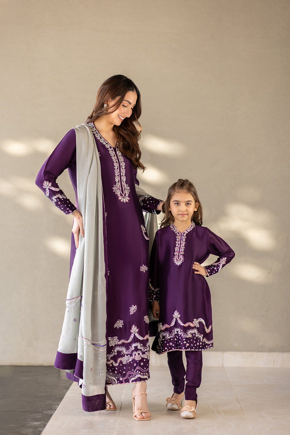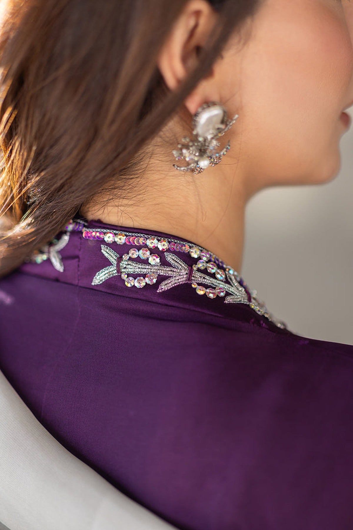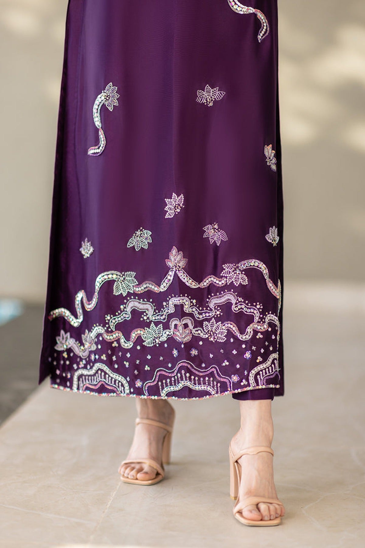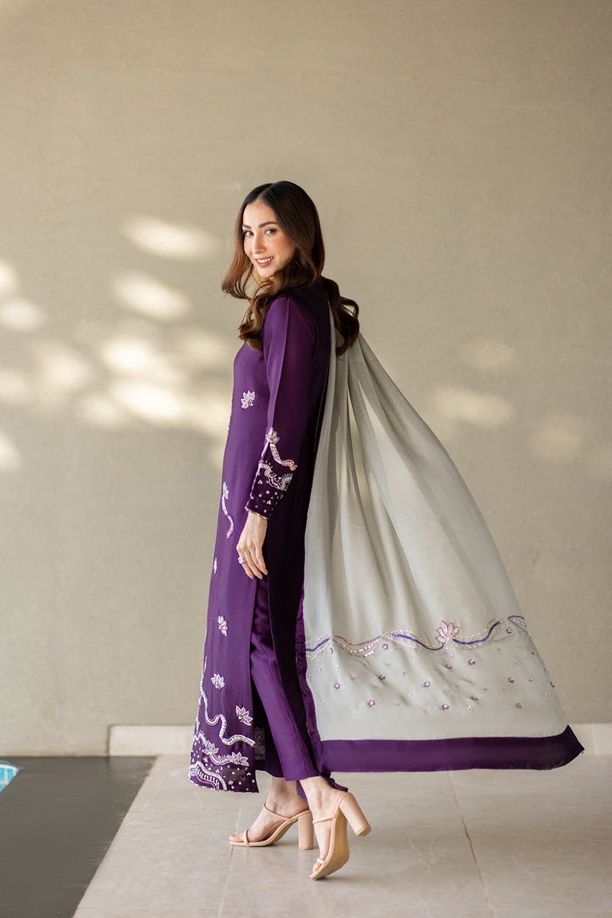 This is a captivating ensemble crafted from premium pure silk. Featuring a brinjal purple long-cut shirt adorned with exquisite Swarovski, colored sequins, kora dabka & naqshi work, the neckline & daman adds a touch of opulence and glamour to the ensemble, ensuring you stand out with effortless grace and charm. Paired with straight pants and an grey Pure silk handwork dupatta with purple facing. A stunning blend of bold hues and delicate craftsmanship, perfect for a sophisticated statement.