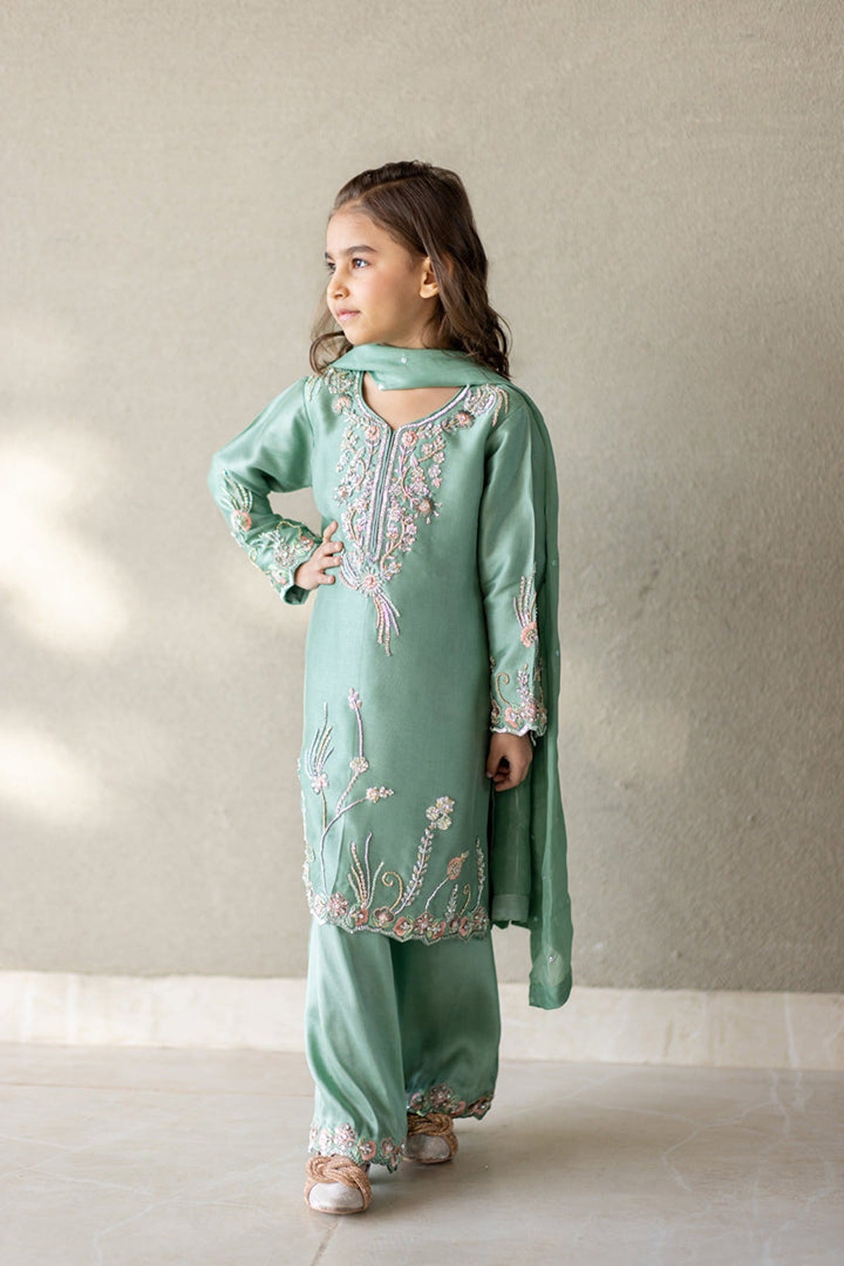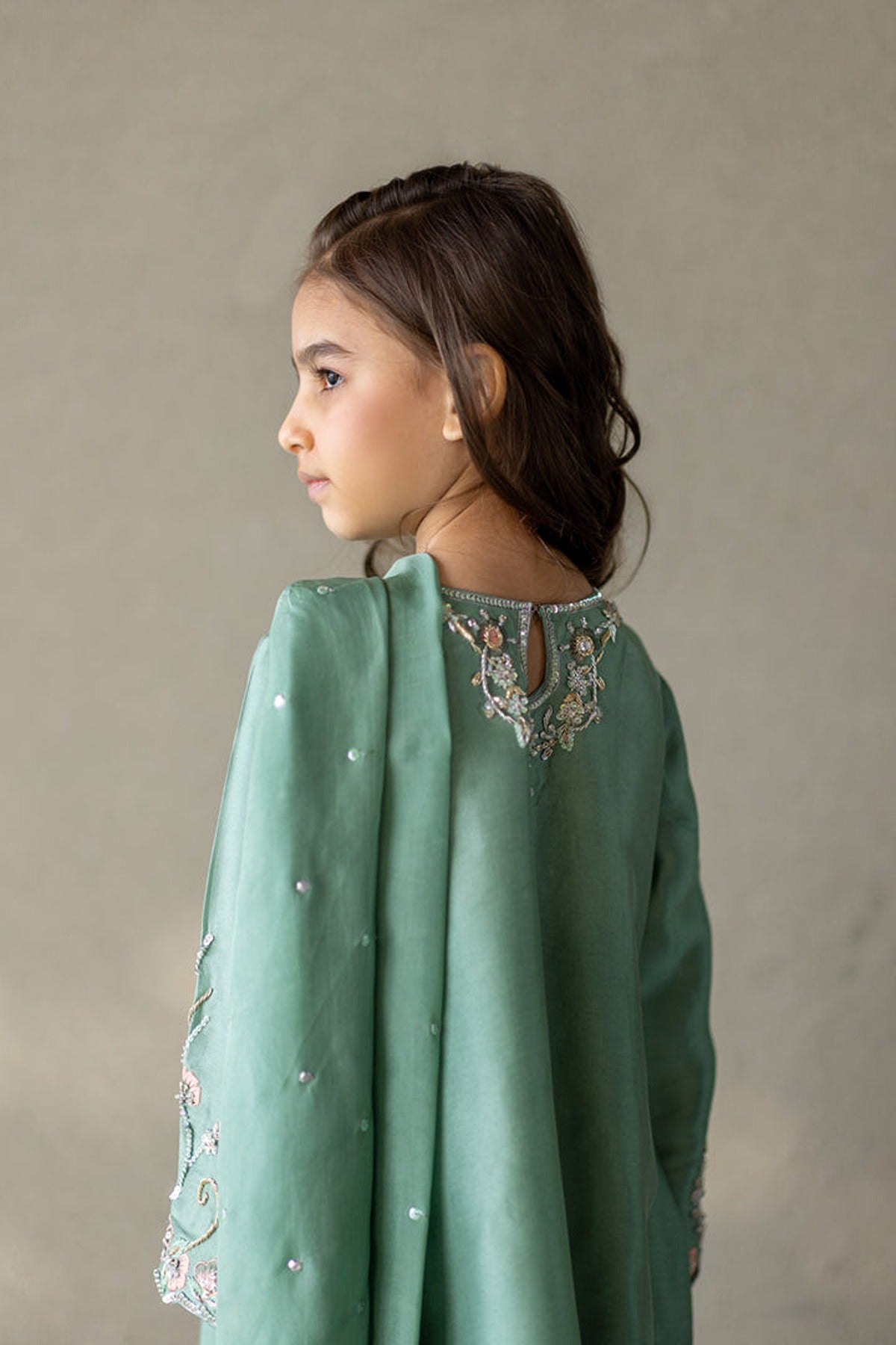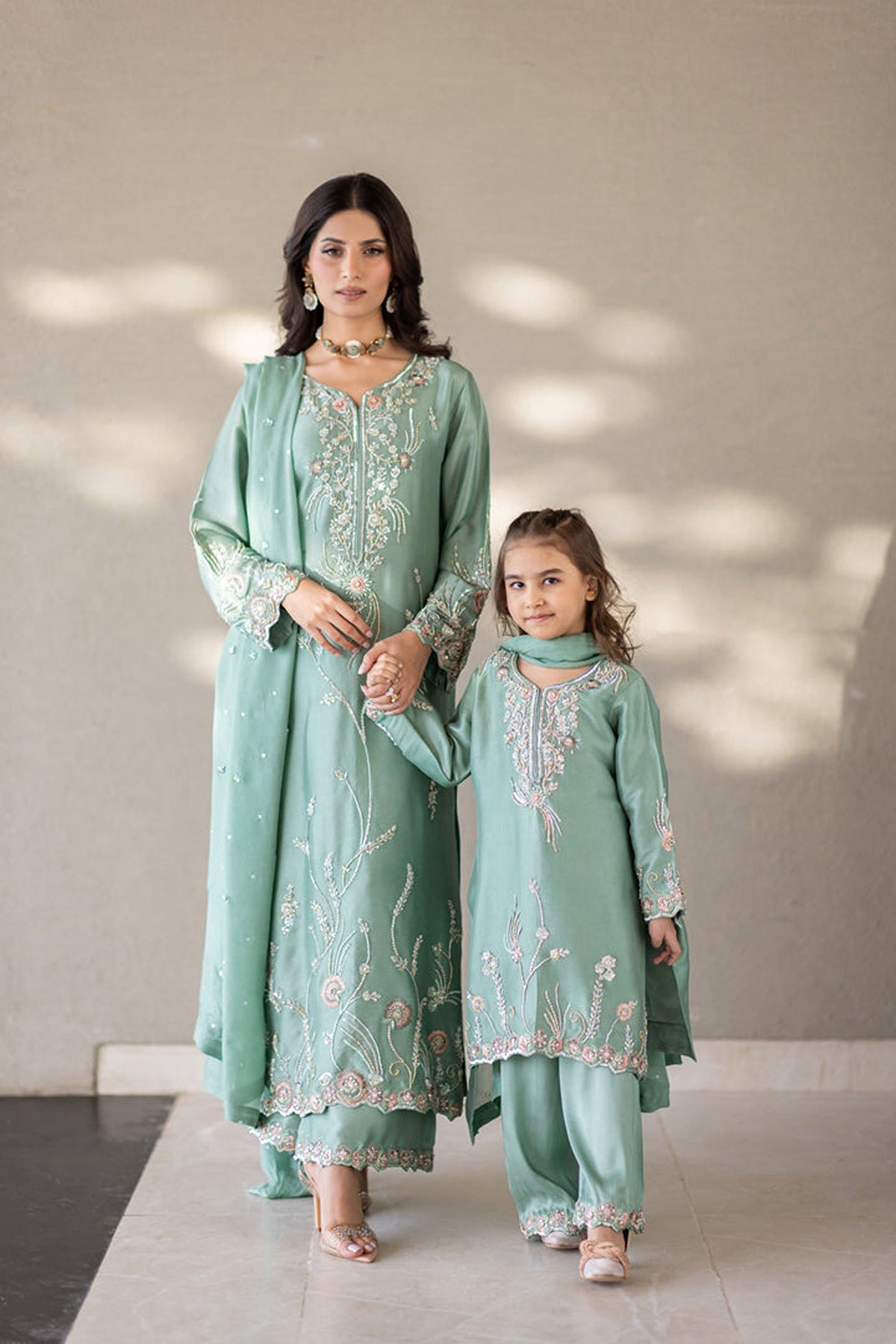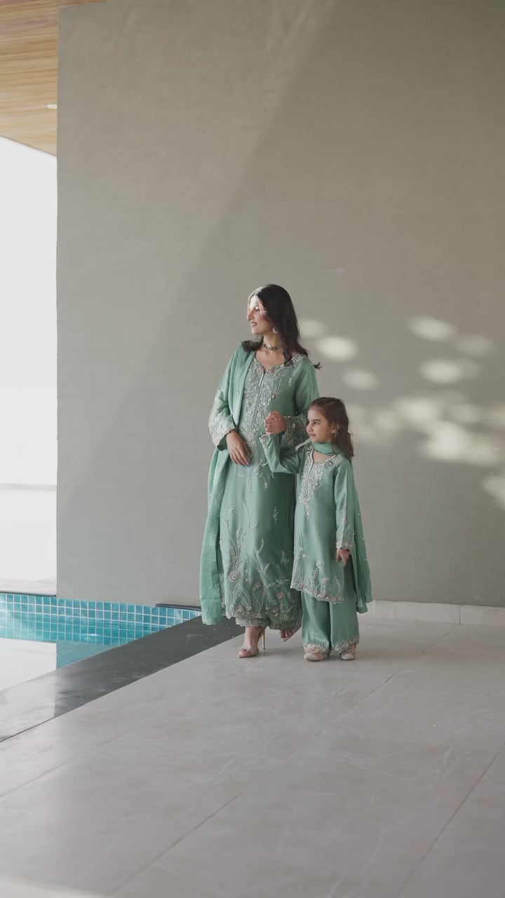 To Complete the look of the outfit it is paired with embroidered Izaar Pants. The dupatta of this timeless piece is made on Medium Silk with sequins spray.