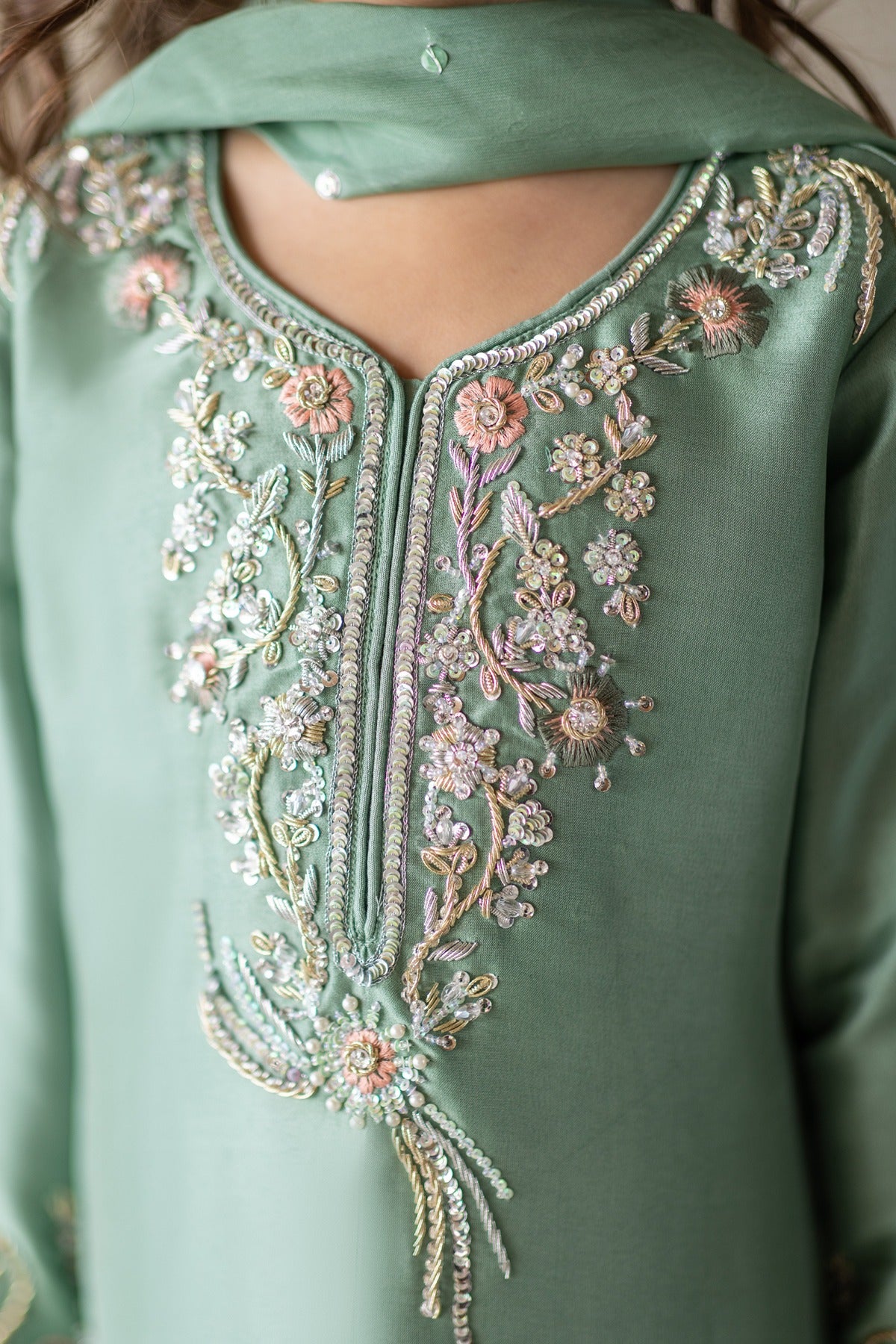This outfit is made on a Radiant Green Pure Silk Canvas which makes it an ideal choice for year around festivities. The gorgeous round neckline, embellished with Glistening Zardozi Handwork of kora,dabka,Pearls & embroidered threads of Resham. Delicately Made to help you shine out amongst the crowd.