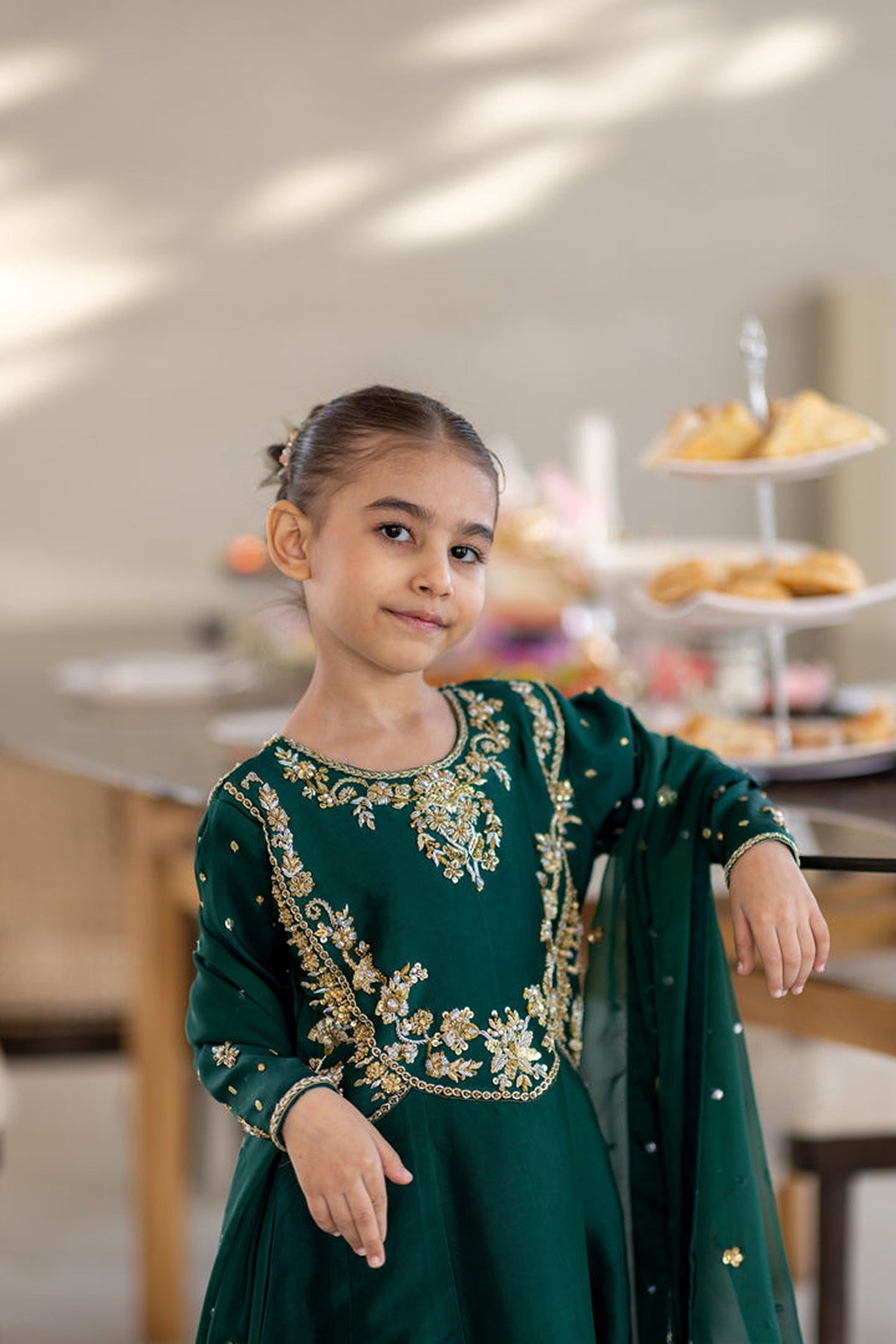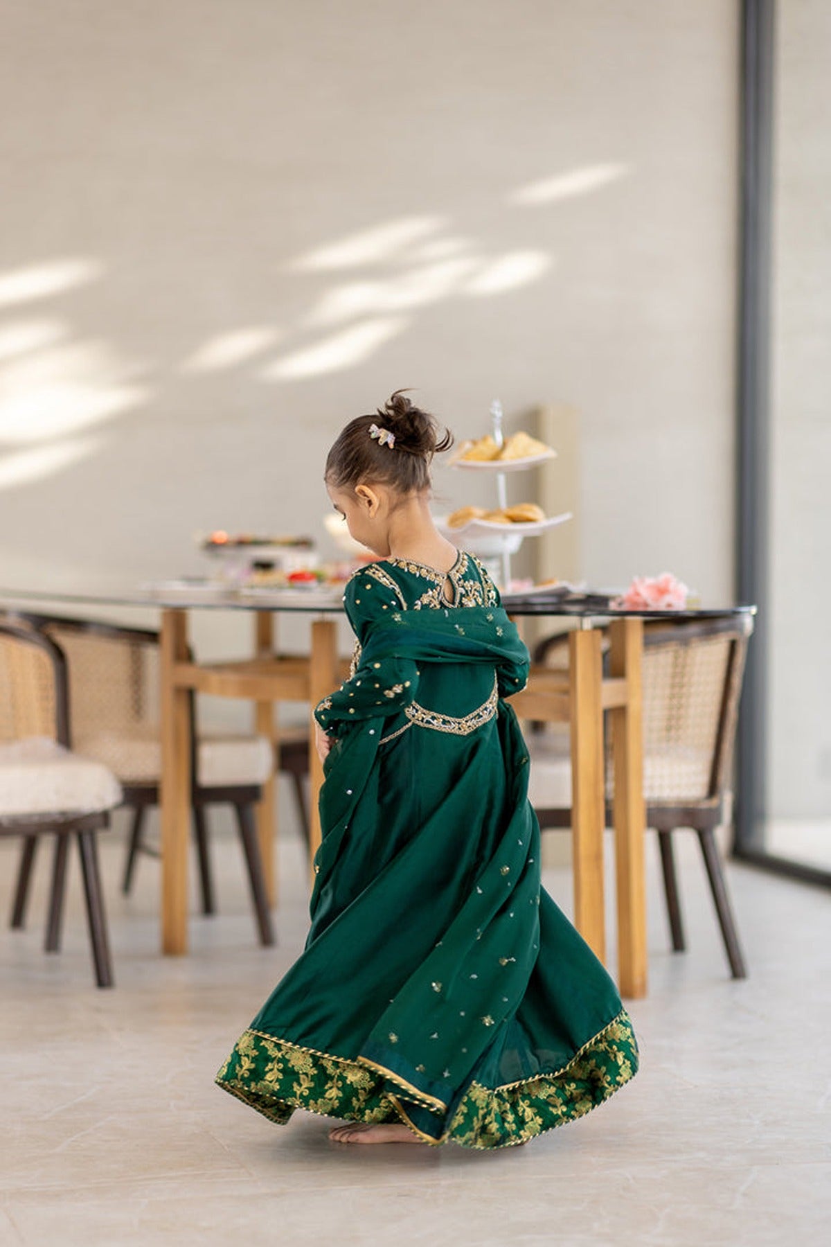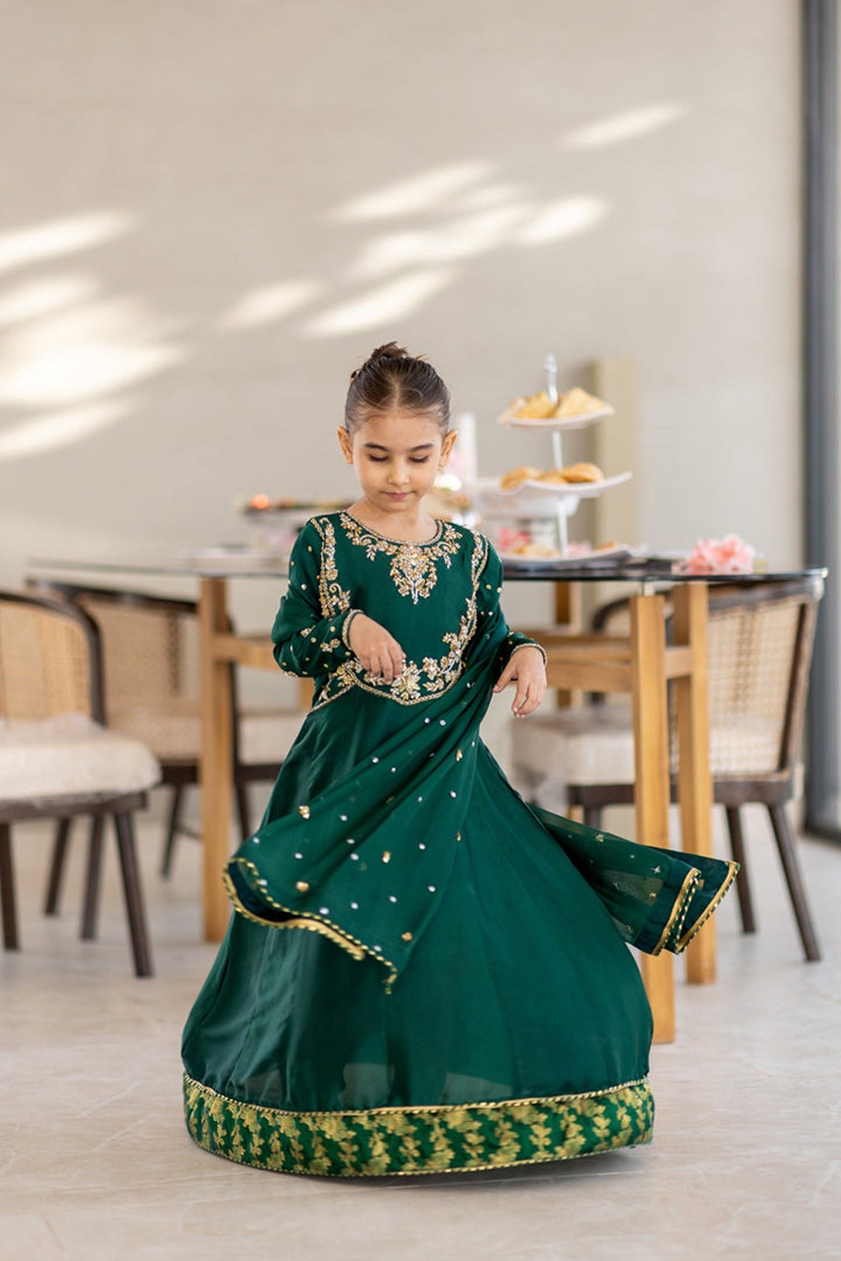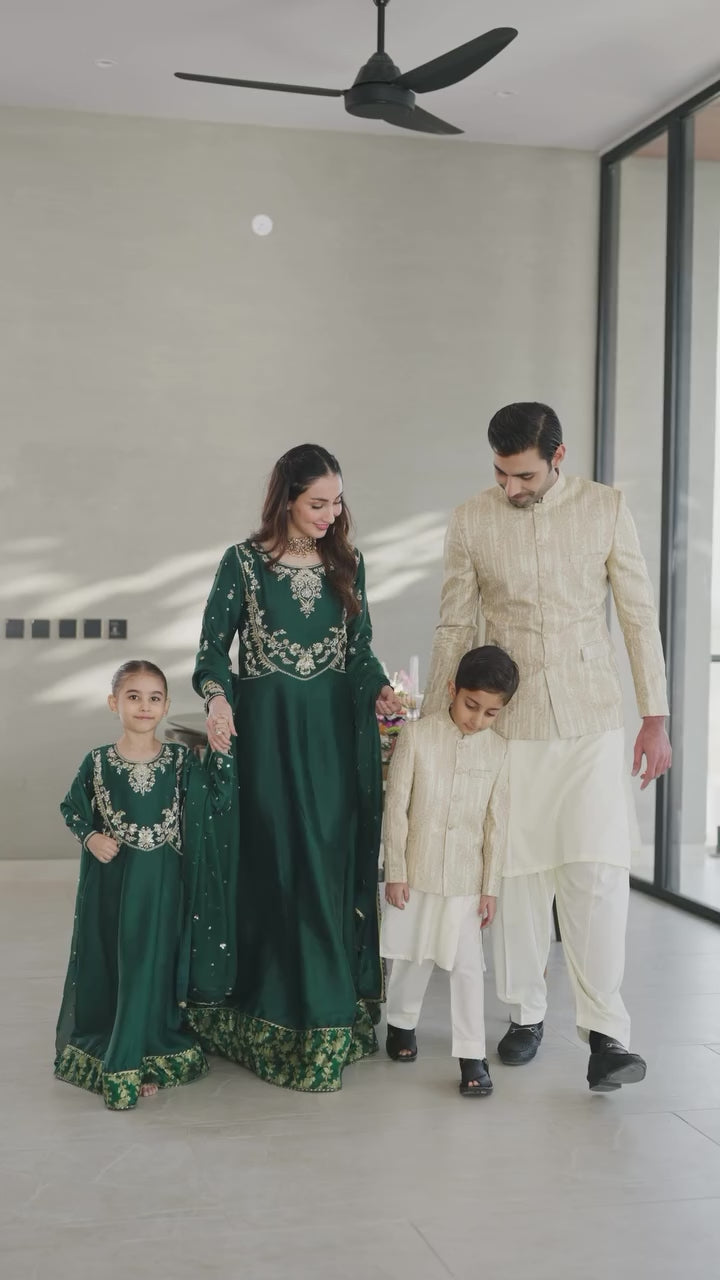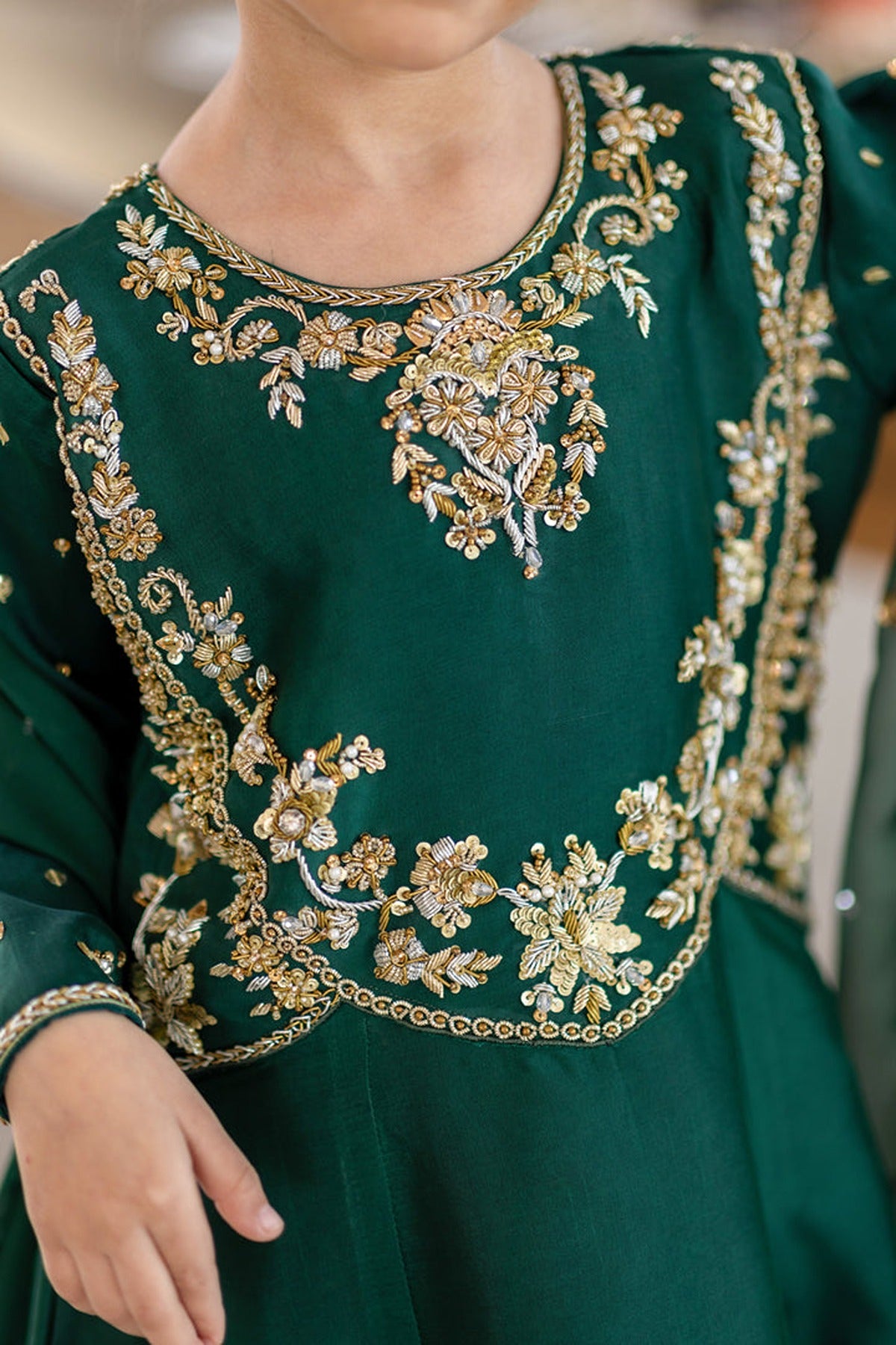 This Emerald green, floor-length ensemble exudes timeless elegance and intricate craftsmanship. The flared Pure silk kalidaar features a beautifully detailed neckline, showcasing true zardozi craftsmanship. The back has a very flattering keyhole neckline.The full-length sleeves are adorned with sequins spray, booti & border , adding to the ensemble's refined beauty. The hemline of the kalidaar is beautifully highlighted with patterned border creating a graceful finish. A matching dupatta with sequins spray & booti, completes the look with an ethereal touch.