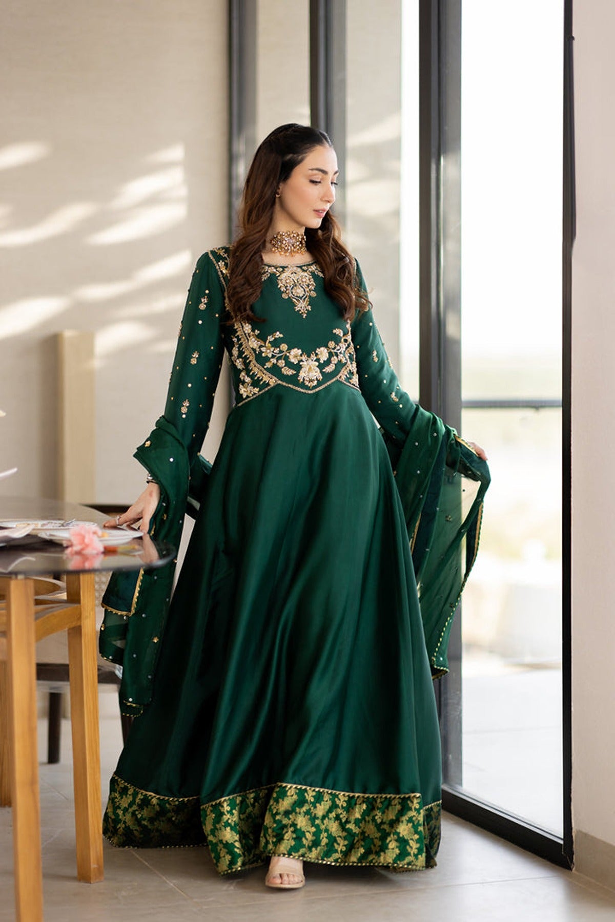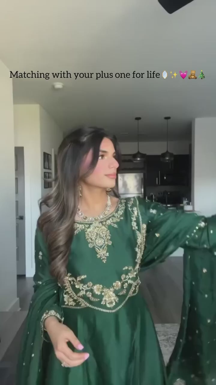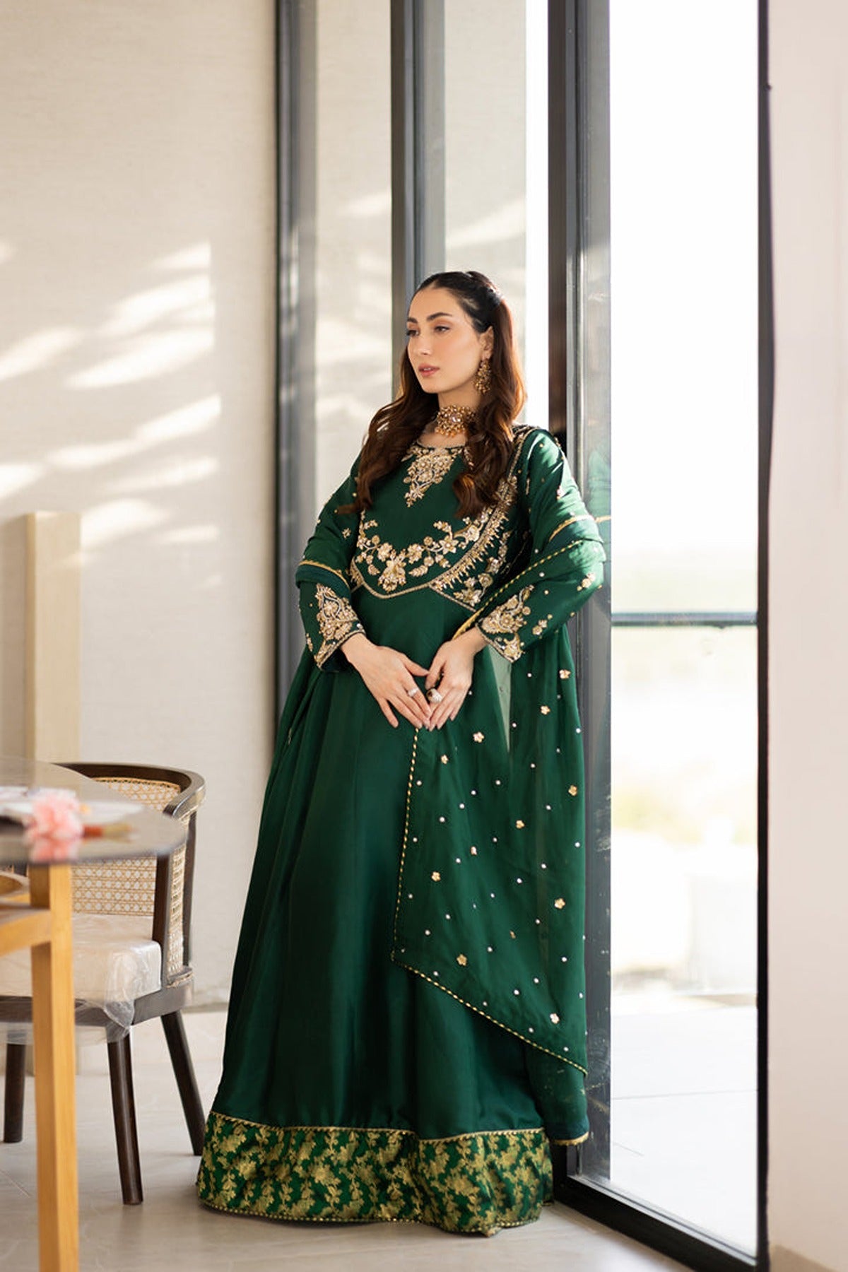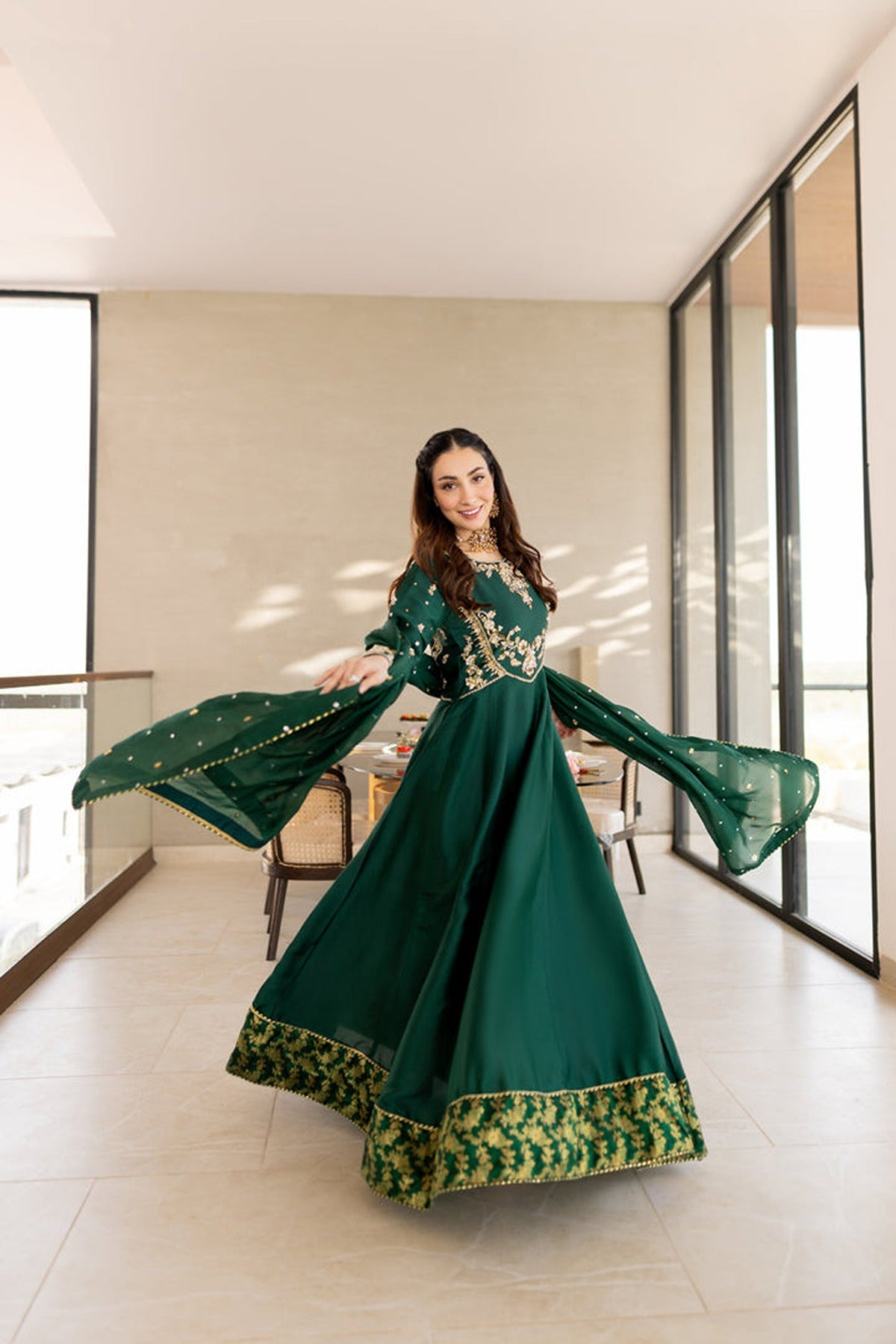 This Emerald green, floor-length ensemble exudes timeless elegance and intricate craftsmanship. The flared Pure silk kalidaar features a beautifully detailed neckline, showcasing true zardozi craftsmanship. The back has a very flattering keyhole neckline.The full-length sleeves are adorned with sequins spray, booti & border , adding to the ensemble's refined beauty. The hemline of the kalidaar is beautifully highlighted with patterned border creating a graceful finish. A matching dupatta with sequins spray & booti, completes the look with an ethereal touch.
