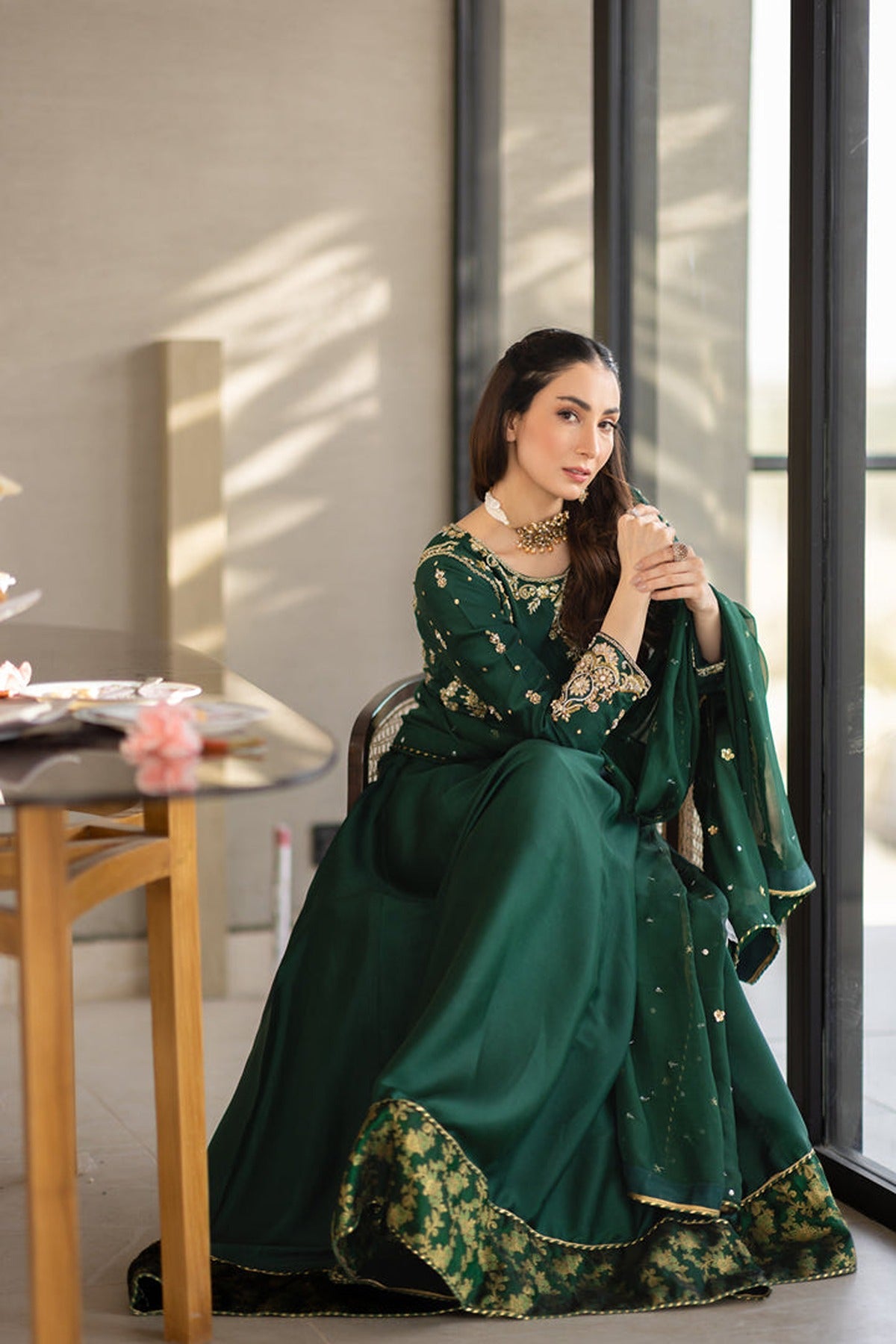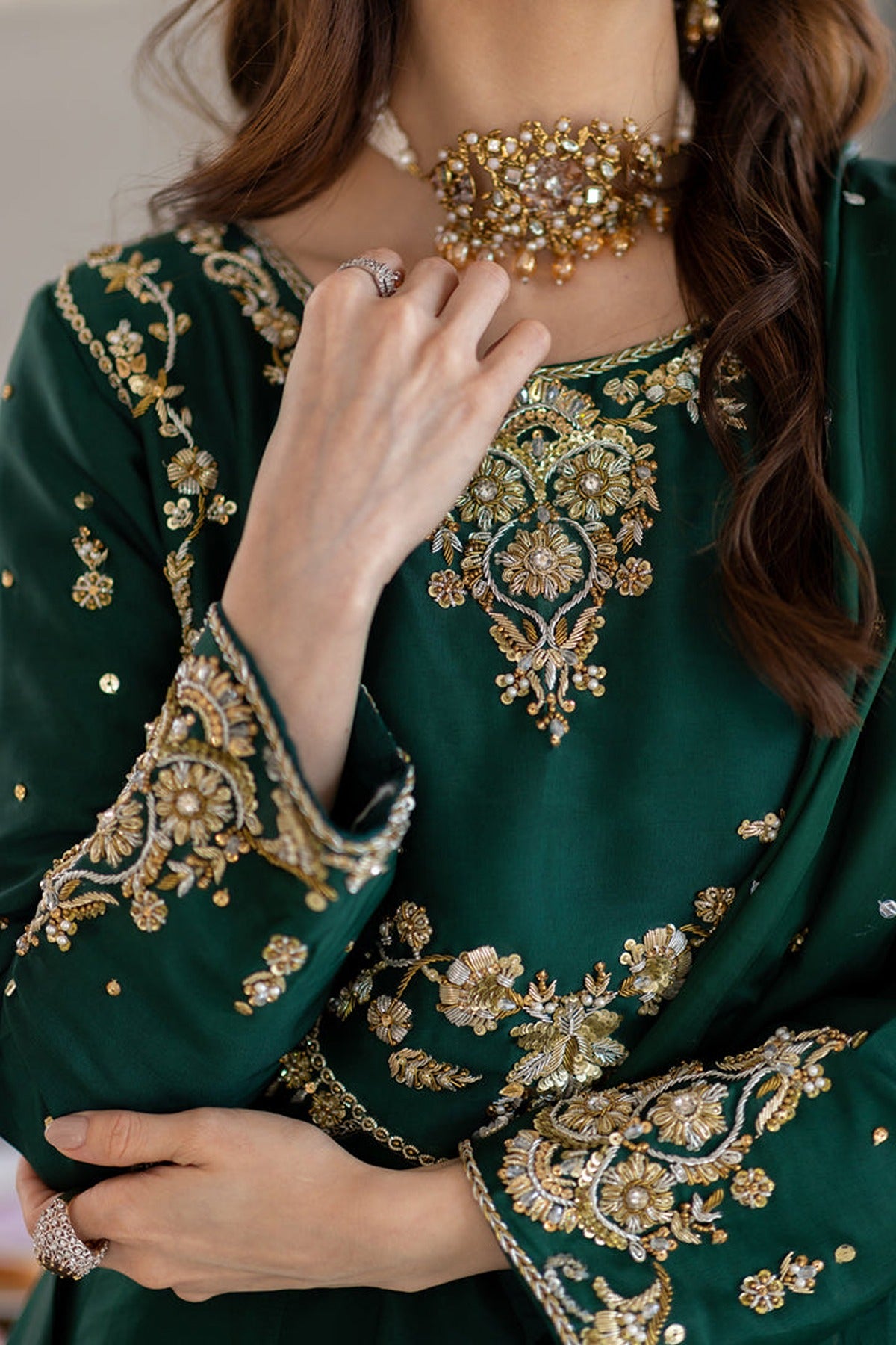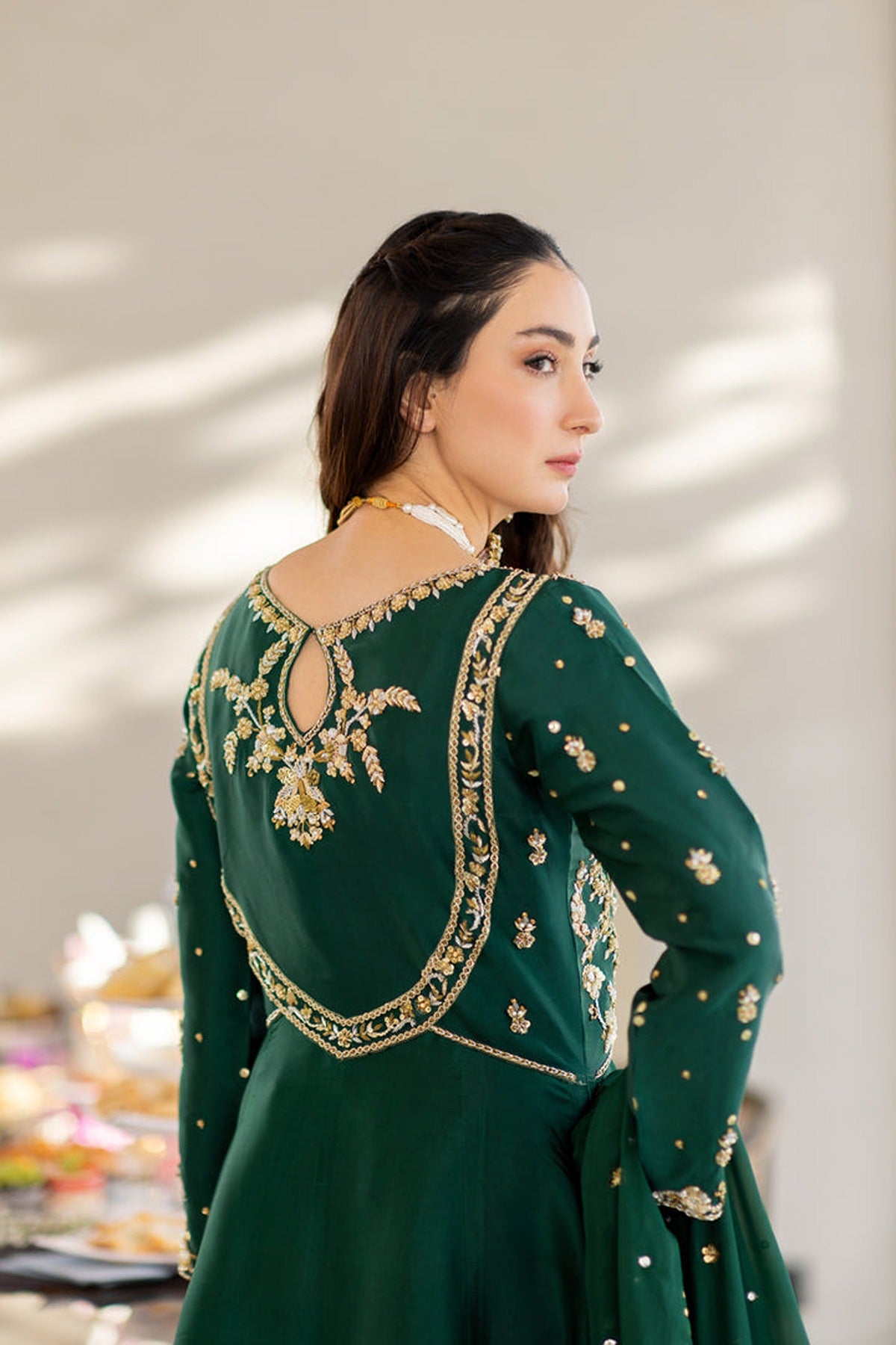 This Emerald green, floor-length ensemble exudes timeless elegance and intricate craftsmanship. The flared Pure silk kalidaar features a beautifully detailed neckline, showcasing true zardozi craftsmanship. The back has a very flattering keyhole neckline.The full-length sleeves are adorned with sequins spray, booti & border , adding to the ensemble's refined beauty. The hemline of the kalidaar is beautifully highlighted with patterned border creating a graceful finish. A matching dupatta with sequins spray & booti, completes the look with an ethereal touch.