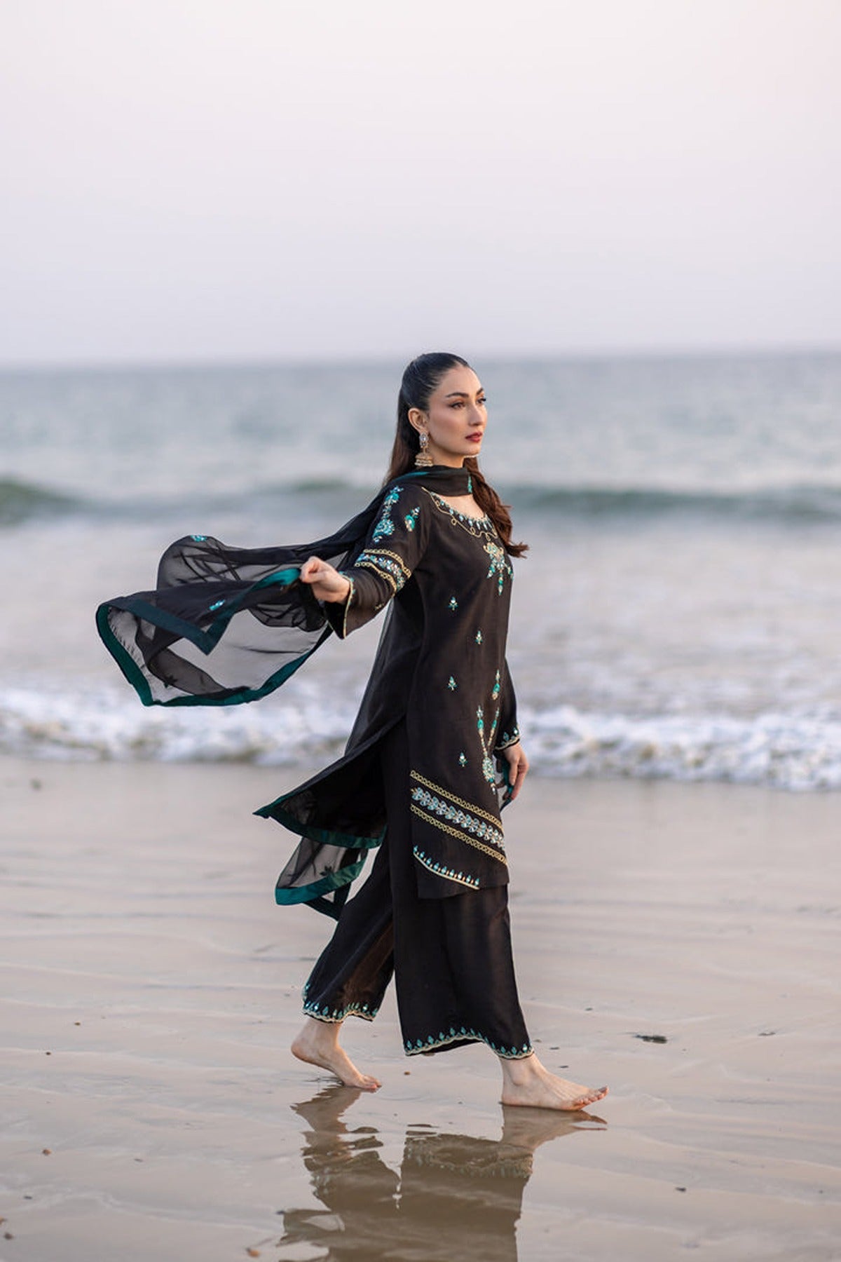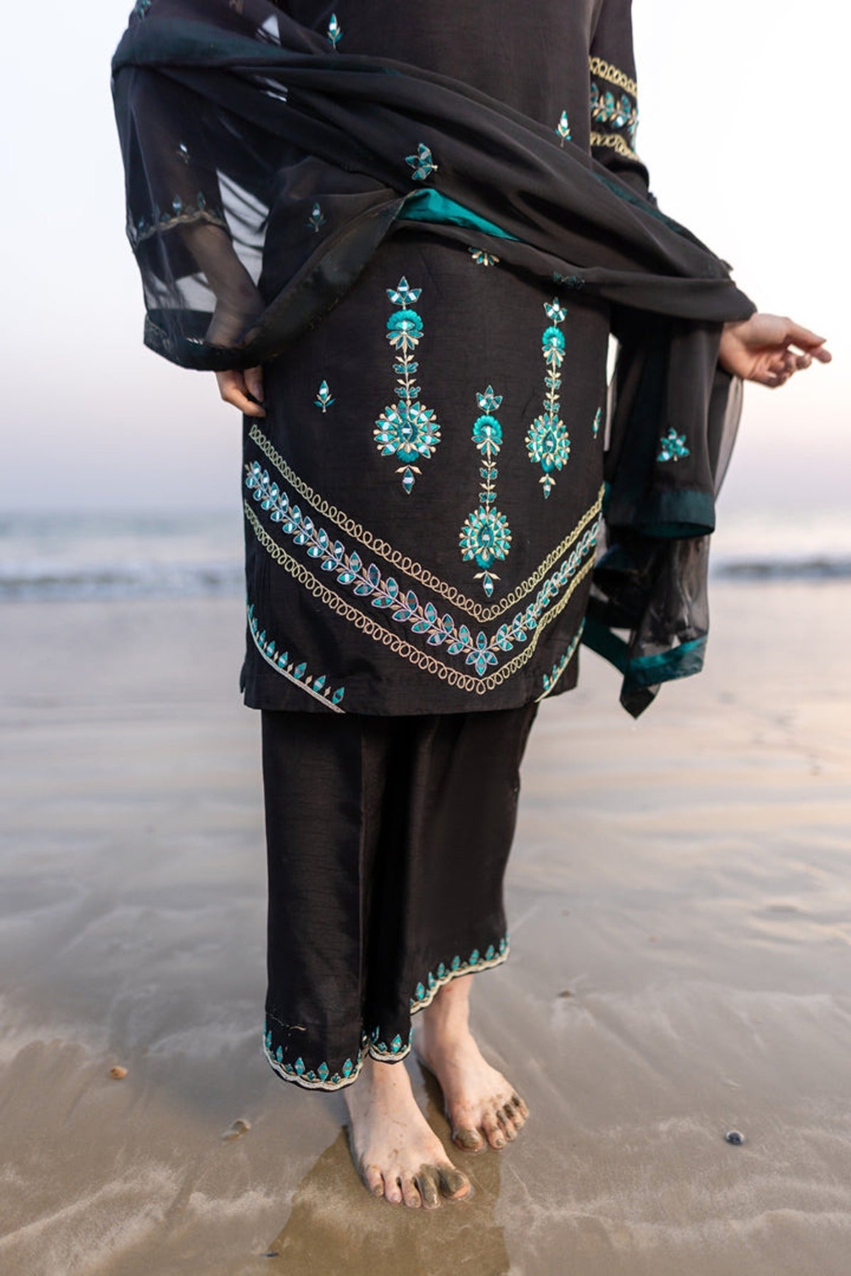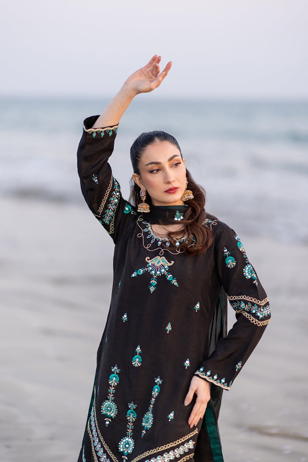 This black raw silk mirror worked embroidered shirt is a modern take on a traditional silhouette with its green colored embroidery all over. The piece is paired with a tonal izaar embroidered pants & dupatta with over all booti and mirror work.