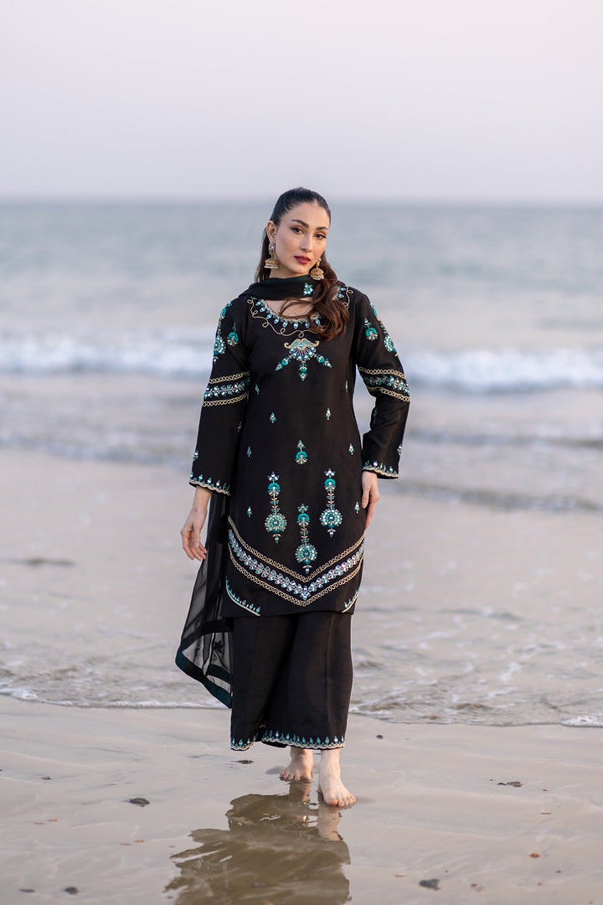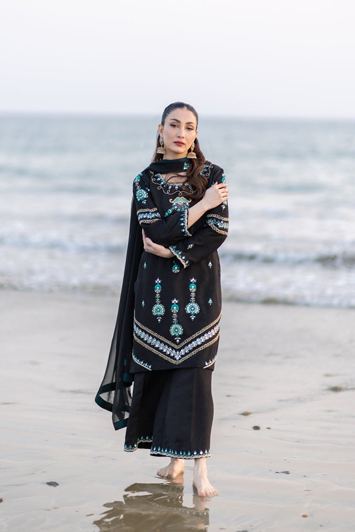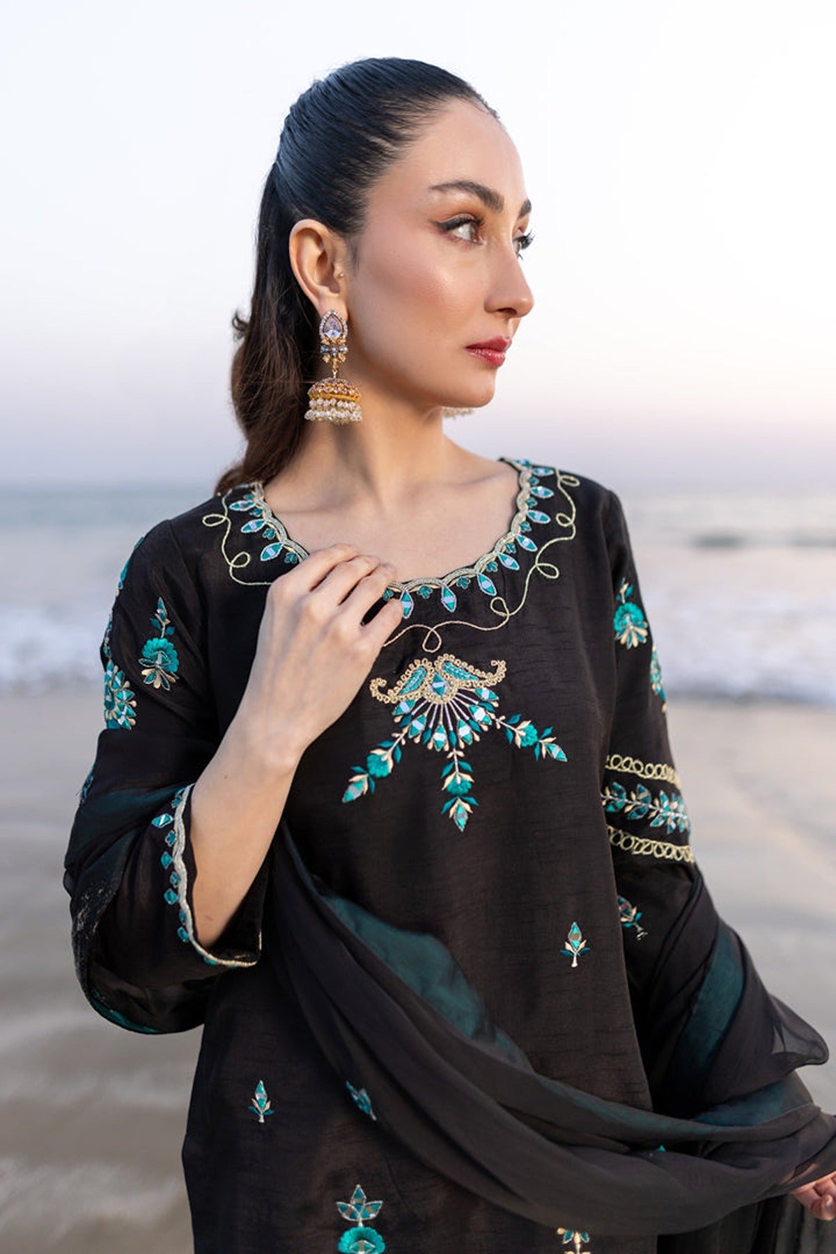 This black raw silk mirror worked embroidered shirt is a modern take on a traditional silhouette with its green colored embroidery all over. The piece is paired with a tonal izaar embroidered pants & dupatta with over all booti and mirror work.