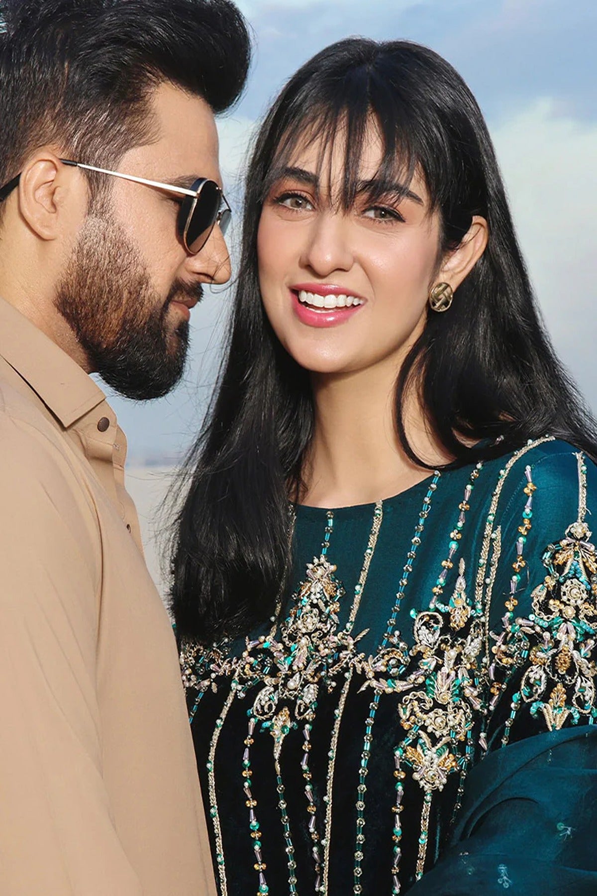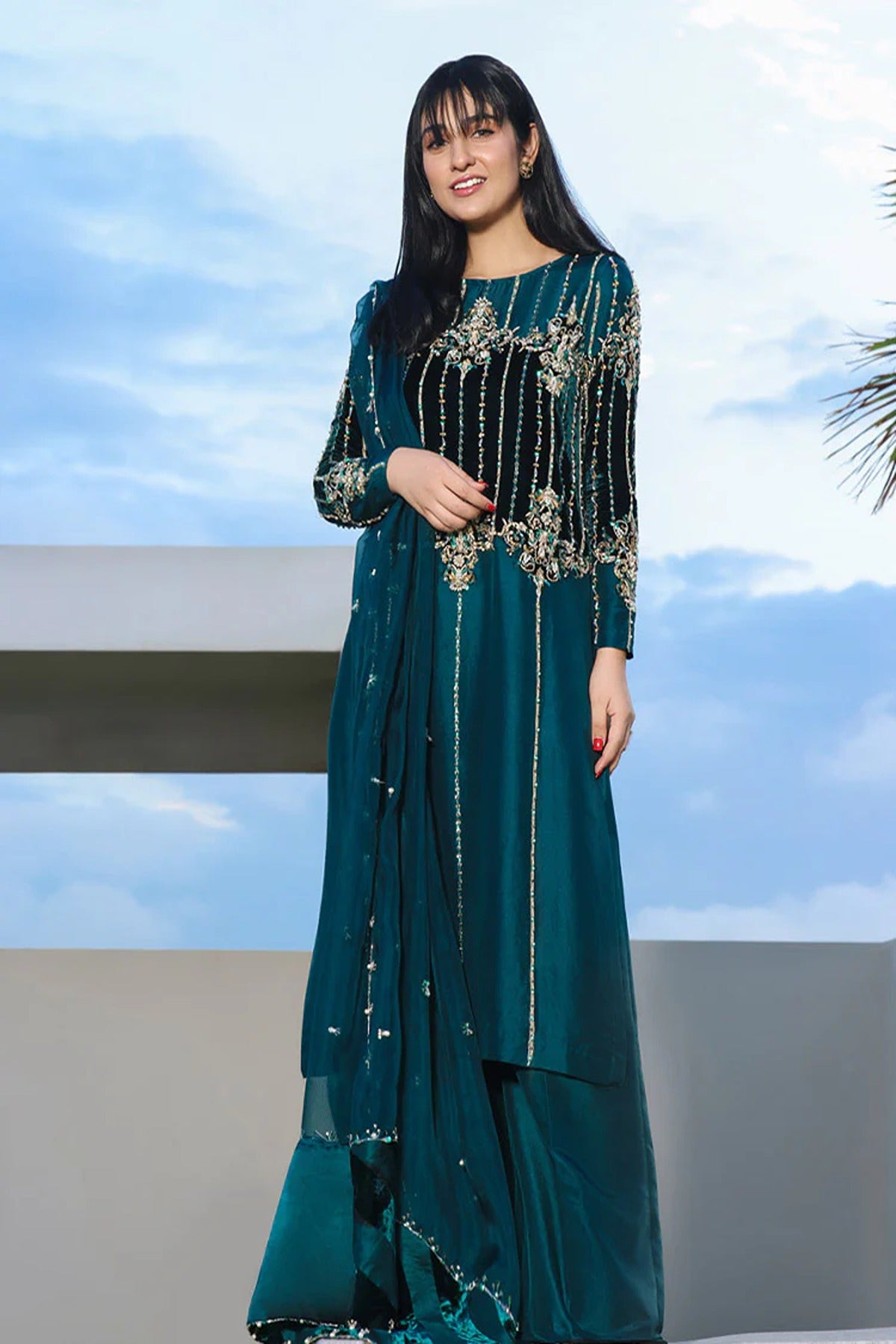 Made in emerald green with raw silk, Lauren is a long flowy shirt featuring splendidly embellished motifs on the front and sleeves which elevate the beauty of the outfit. The shirt has patching of rich velvet on the front and sleeves adding to its allure. Its dupatta is of organza and includes a chatta pati of raw silk and velvet on the palu and is ornamented with handwork and gleaming pearl spray on all four sides.
