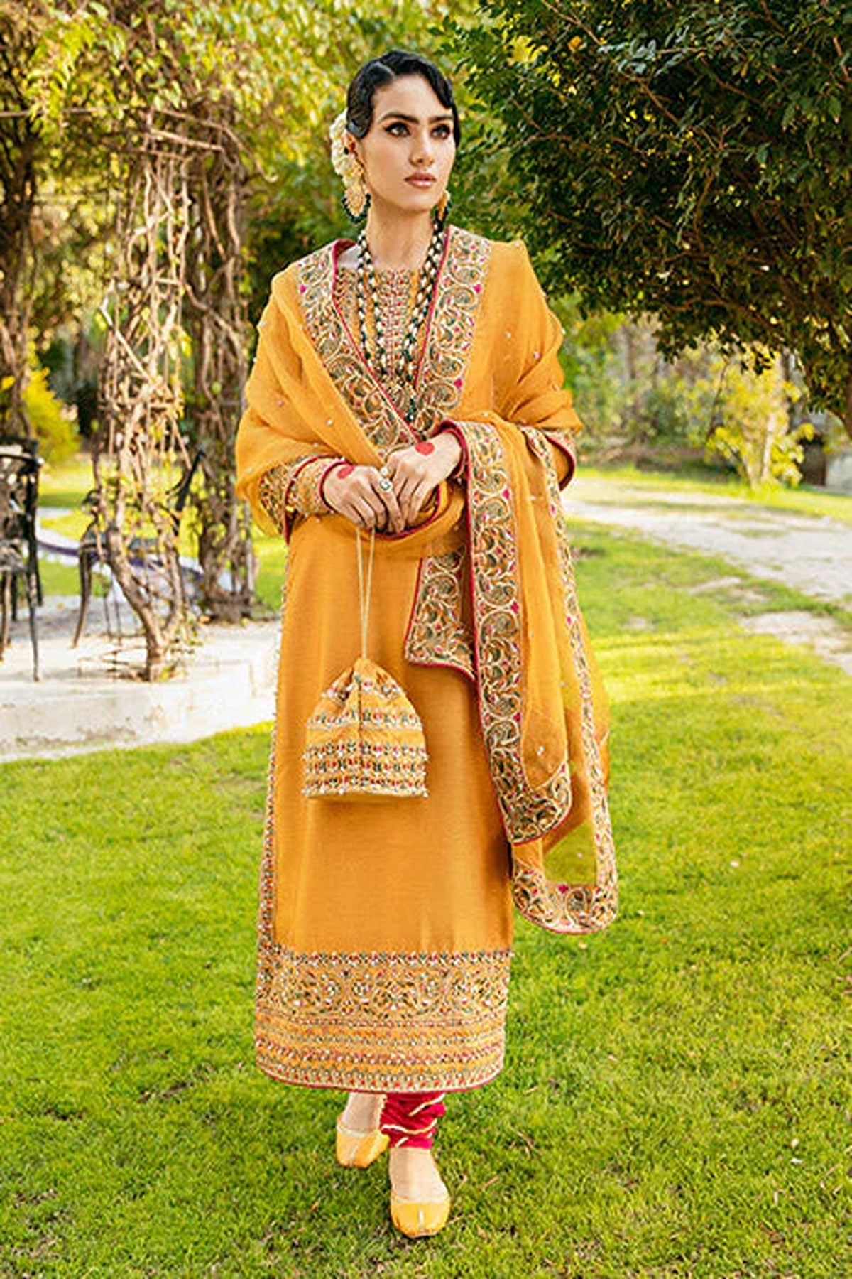 Radiance personified, Aarti is designed in a classic tone of yellow, with exquisite geometrical motifs on its neckline and delicate borders on the sleeves. The breathtaking and detailed embroidery is made on Korean silk. The outfit is further enhanced with sparkling embellishments. To complete the vision of a traditional outfit, it is paired with Korean silk churidar, with timeless gota details, and an organza dupatta with four sided border, gleaming with crystal spray.