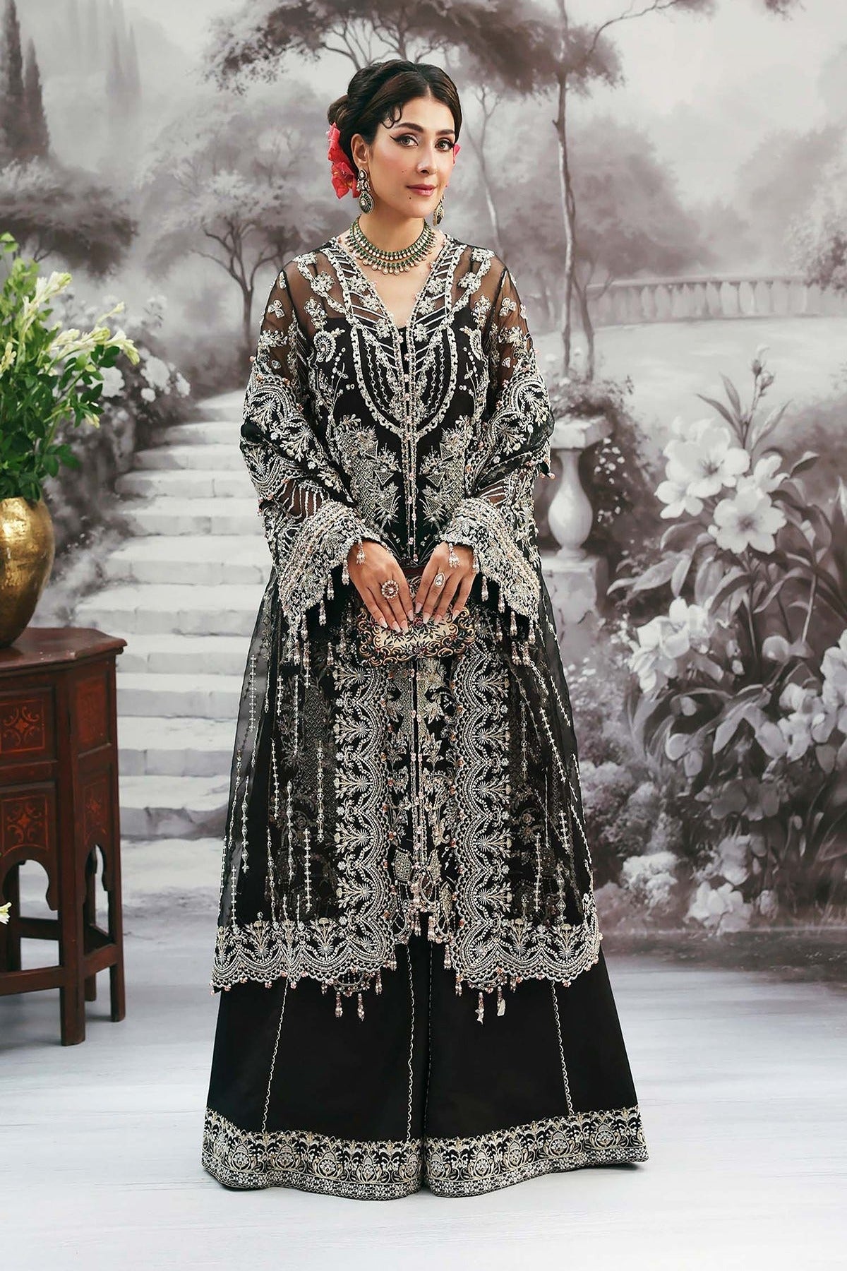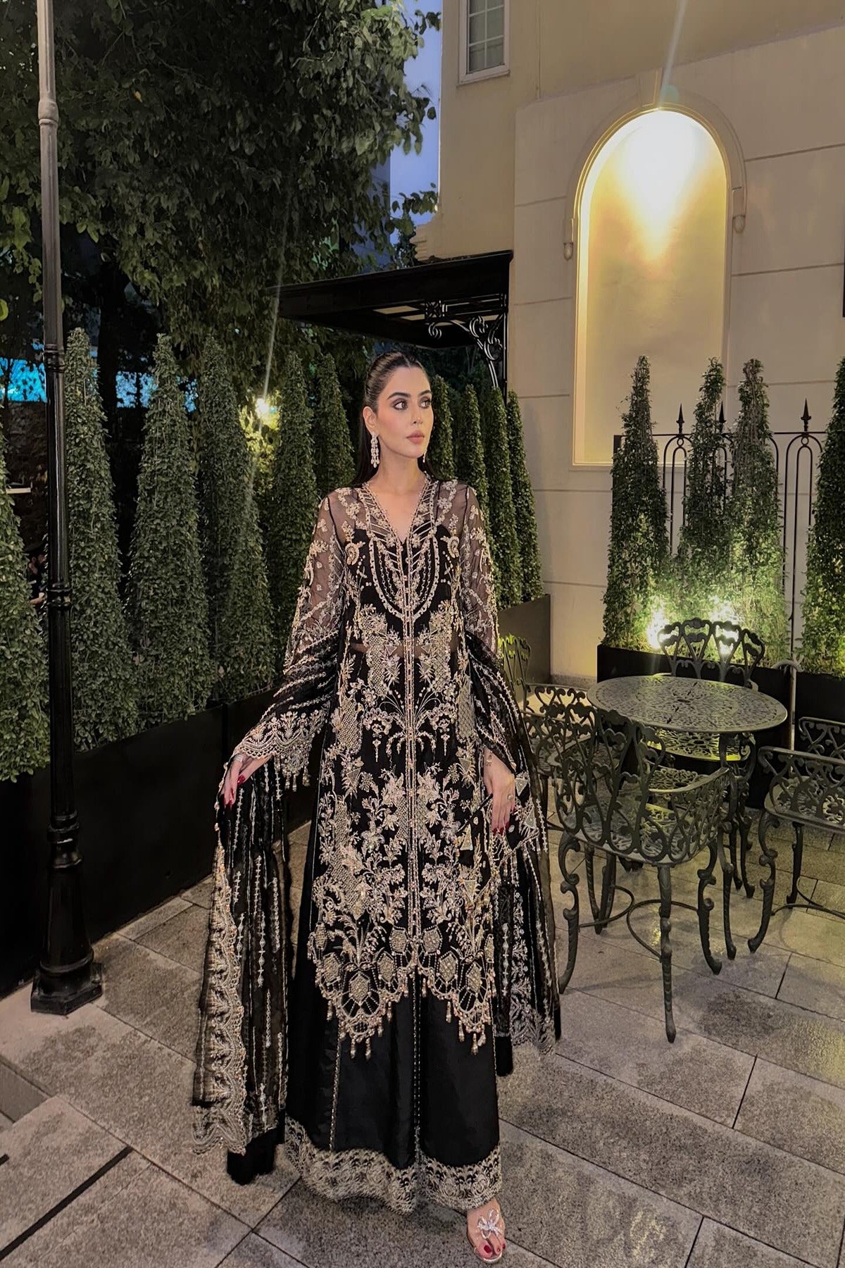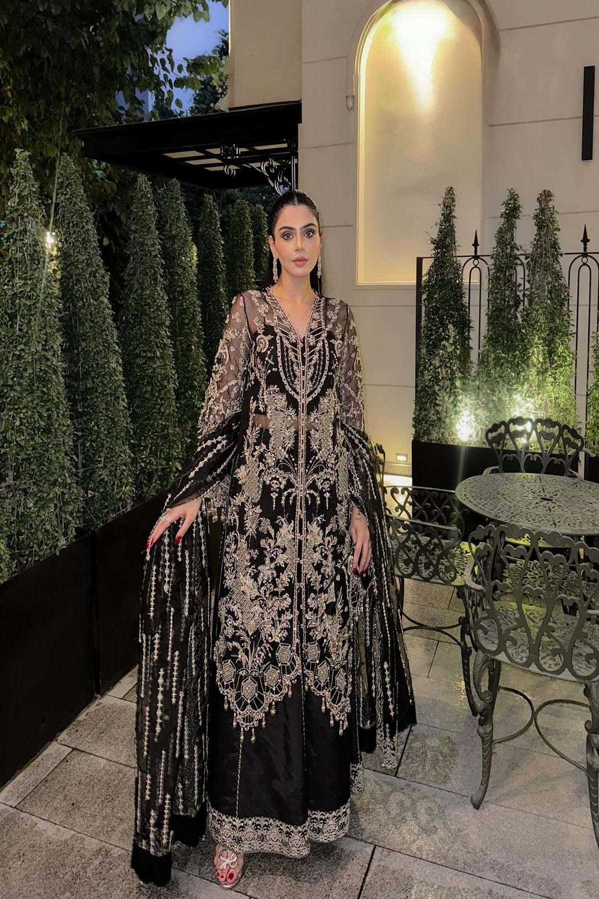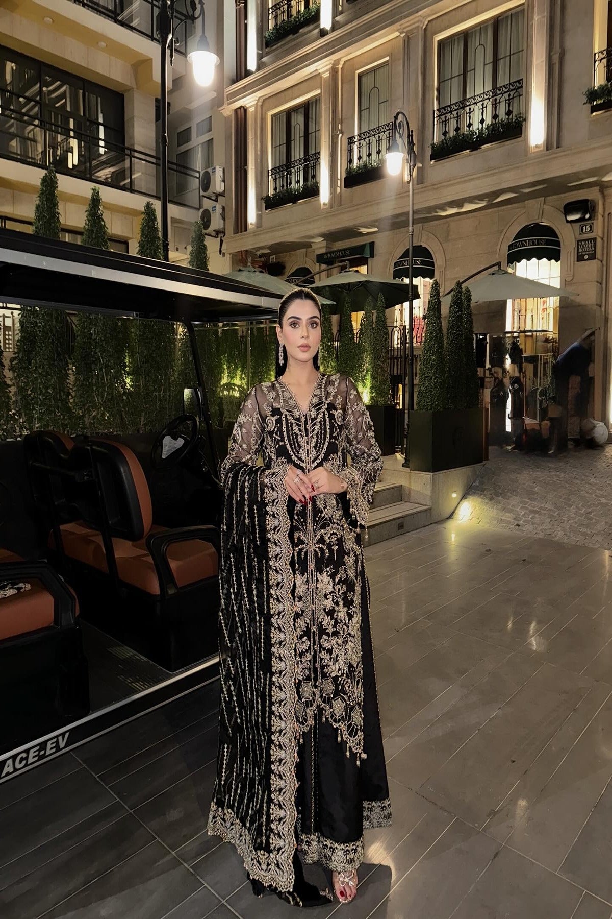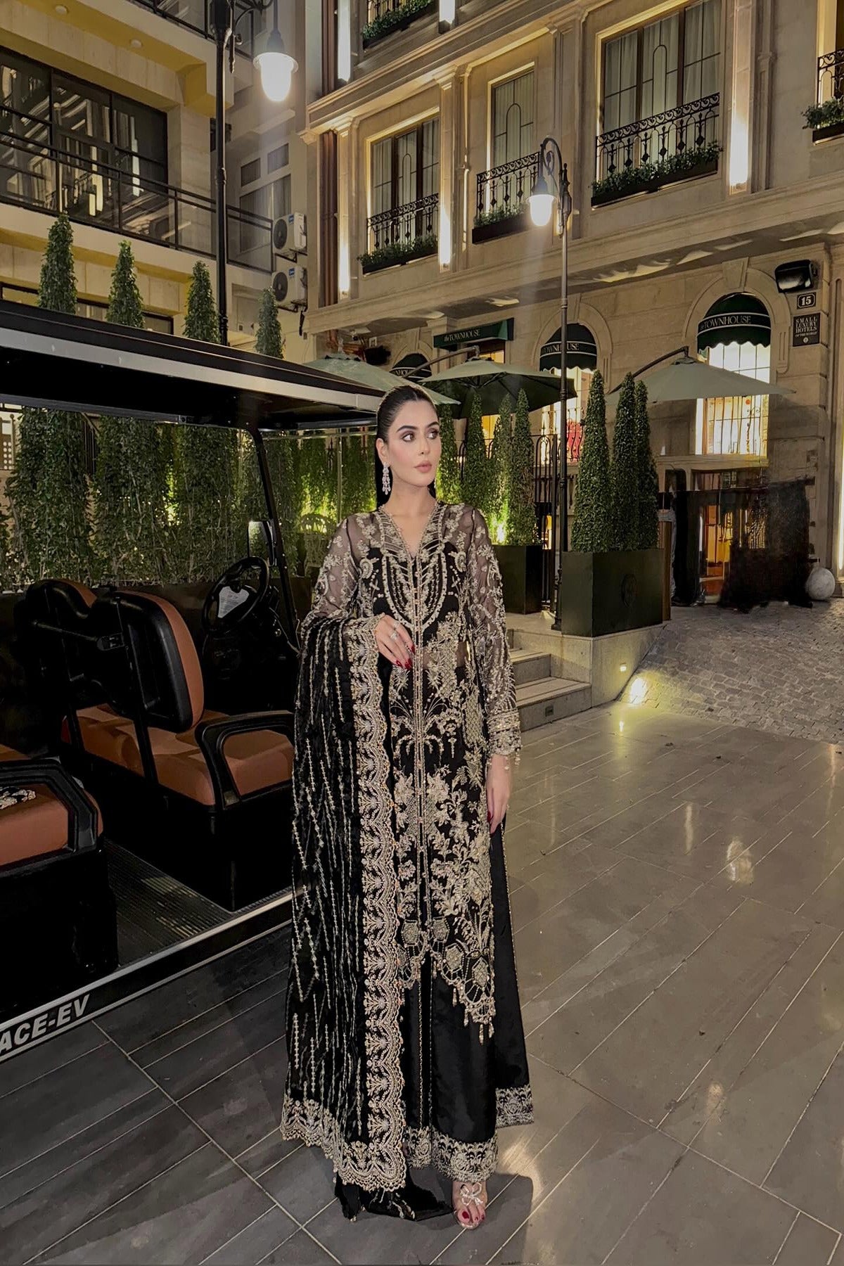 Command attention in this majestic onyx noir ensemble, a celebration of timeless elegance with a dramatic edge. The outfit features hand-embellished organza panels with scalloped detailing, elevated by intricate embroidery and refined borders that exude luxury. An intricately worked dupatta adds grace and sophistication, while the tailored trouser and inner ensure a sleek, refined finish. The design is further accentuated with a delicate silver sequin spray and masterful adda work, creating a luminous statement perfect for evening festivities.