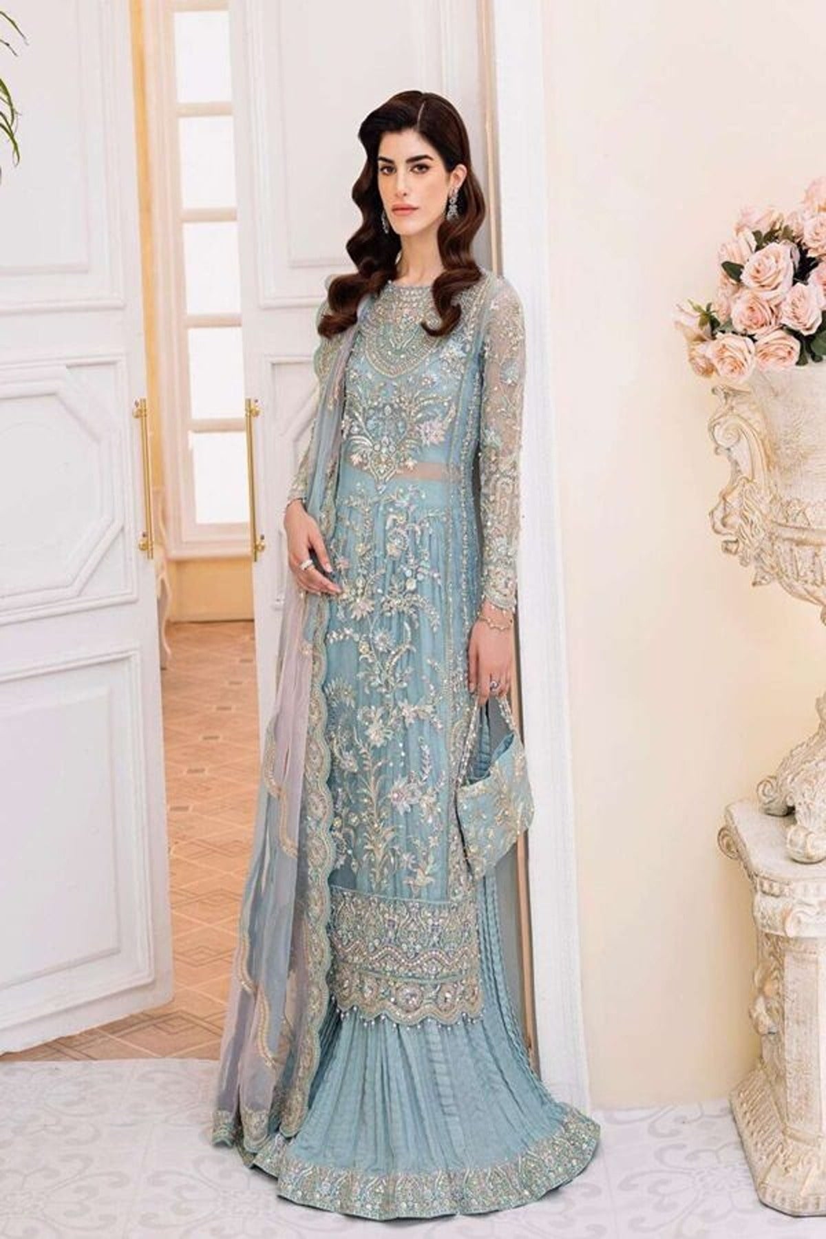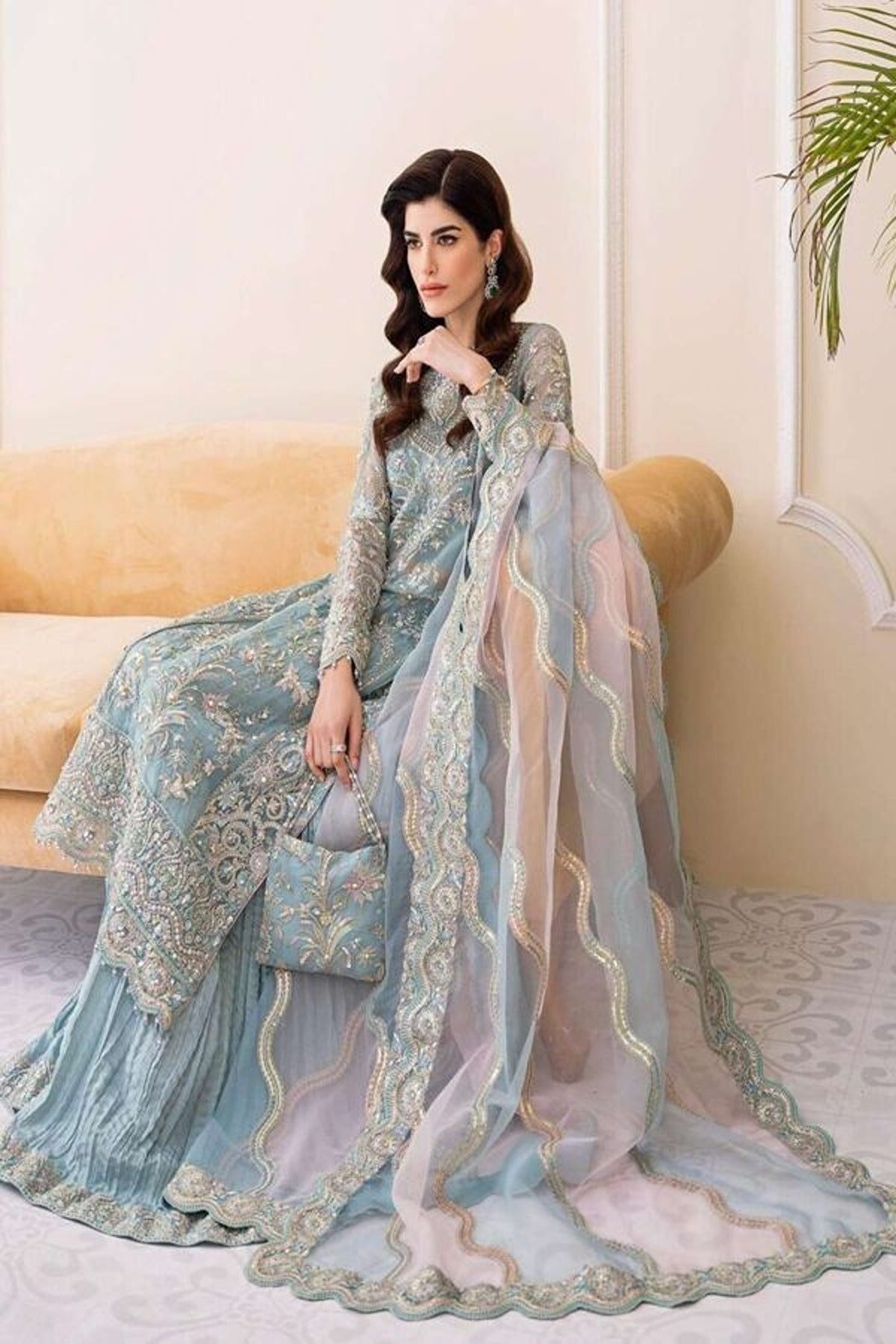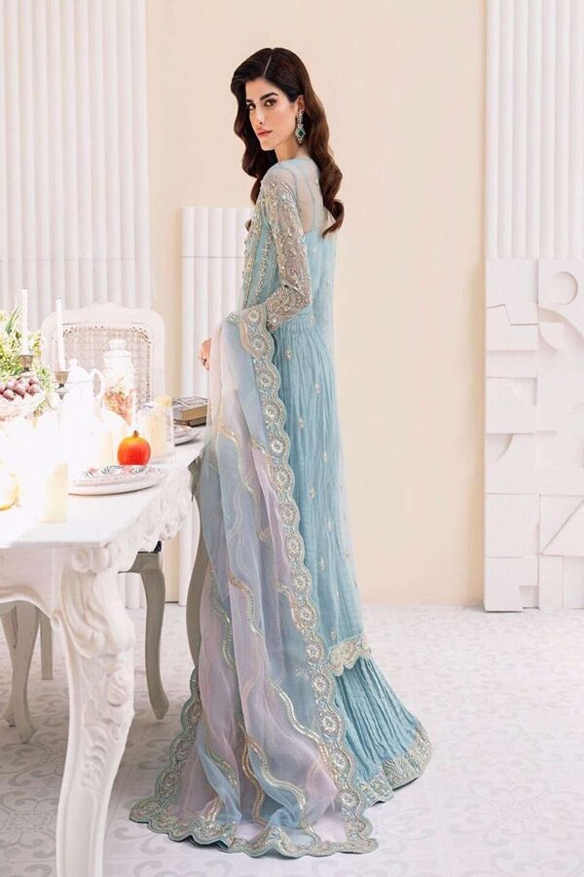 For those who love to wear pastel colours, along with a startle look, “Rimel” is the perfect design for you. This elegant dress features an organza base, delicately rendered floral motifs with jewel like neckline pattern on a hues of ferozi and pink. It is paired with double toned tranquil laser dupatta and crushed pants.