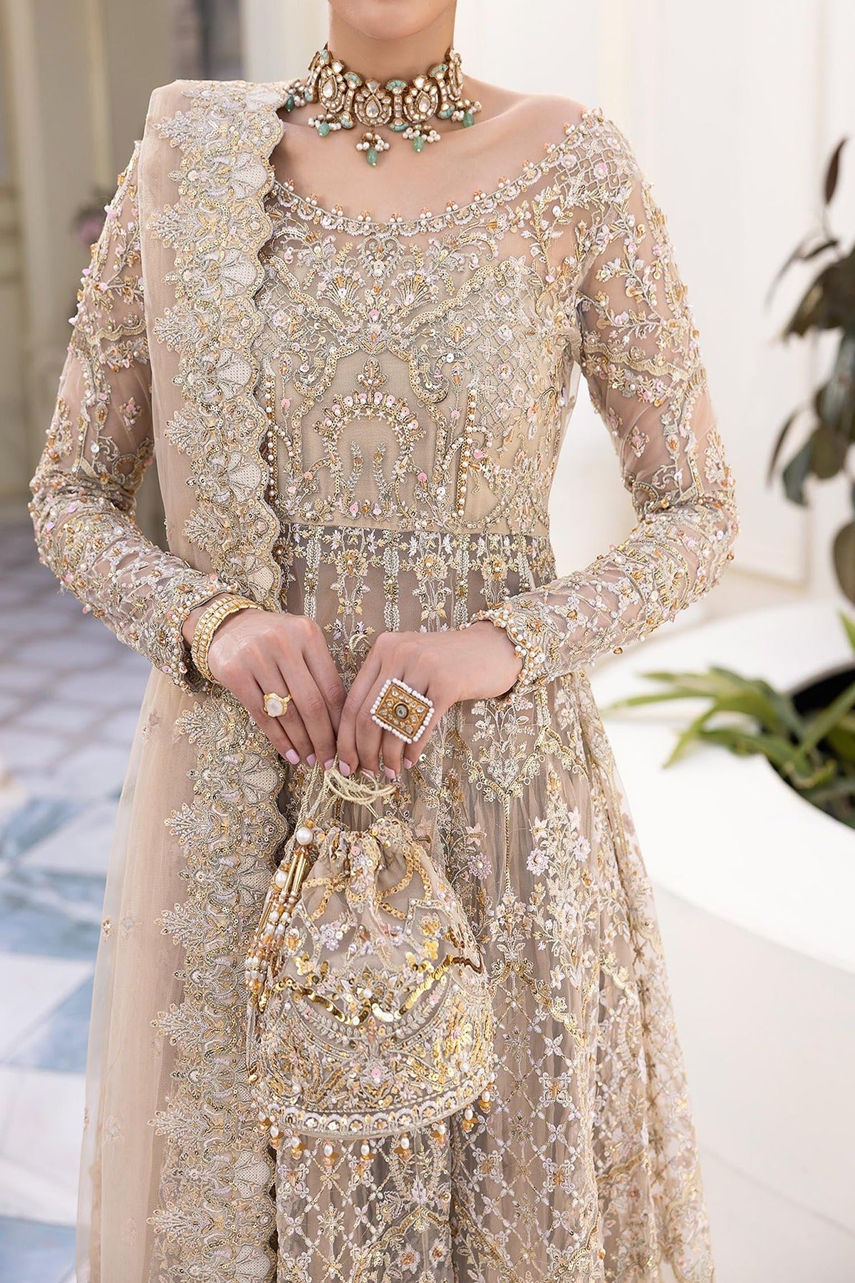 The nude Peshwas serves as the focal point of the ensemble, exuding elegance and grace in its delicate hue. Crafted from net fabric, the Peshwas features intricate embroidery that adorns the bodice, sleeves,and flare adding a touch of opulence to its timeless silhouette. Delicate floral and geometric design, intricate patterns, and shimmering embellishments come together to create a mesmerizing tapestry of