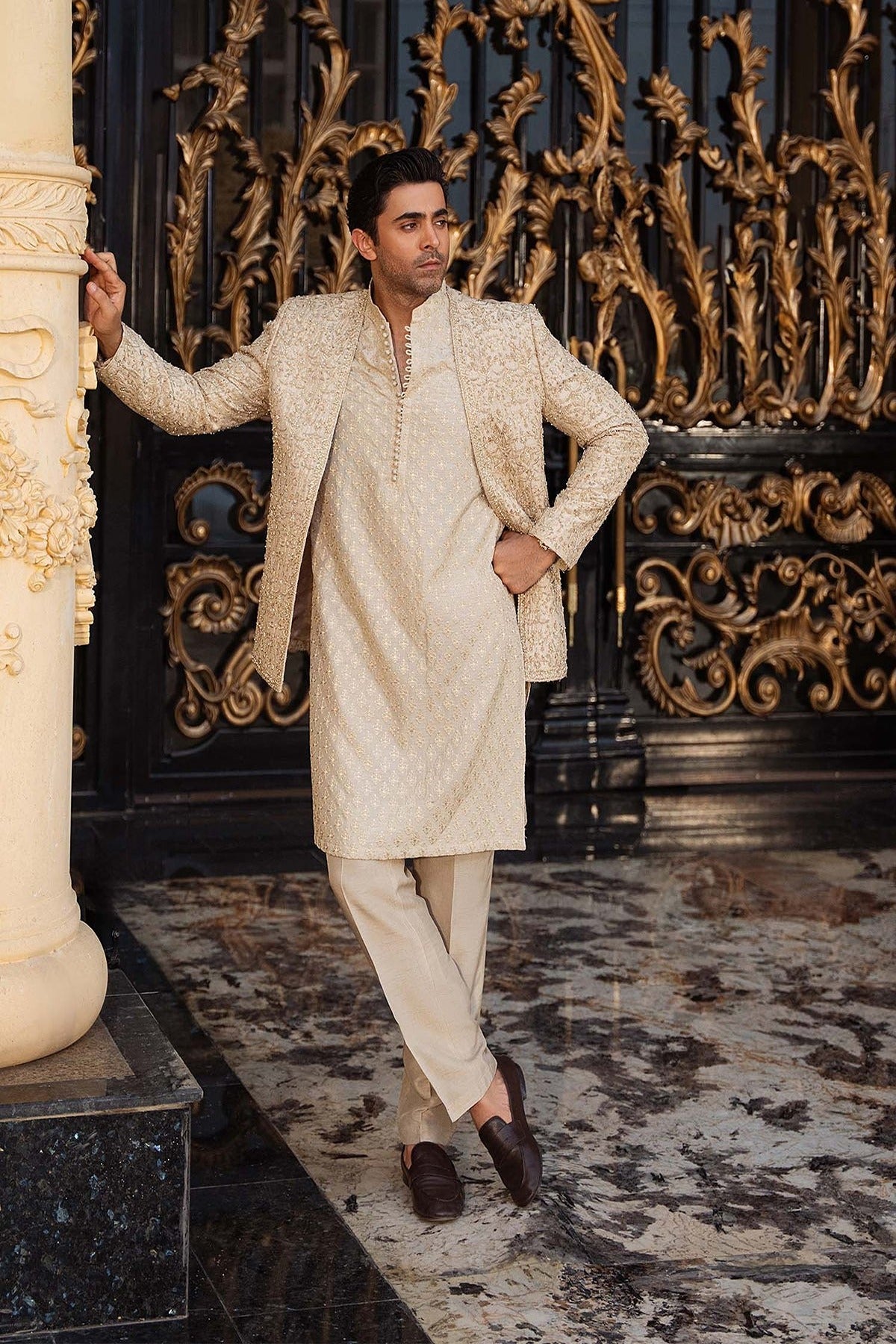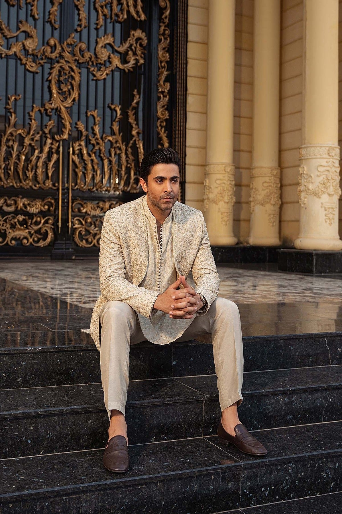 A statement-making golden front-open prince jacket crafted from luxurious pure raw silk. The sharp, modern cutline and striking gold-beige hue are elevated with intricate embroidery and exquisite embellishments. Paired with an elegantly embroidered inner kurta and plain tailored trousers, this ensemble perfectly balances opulence with contemporary sophistication.