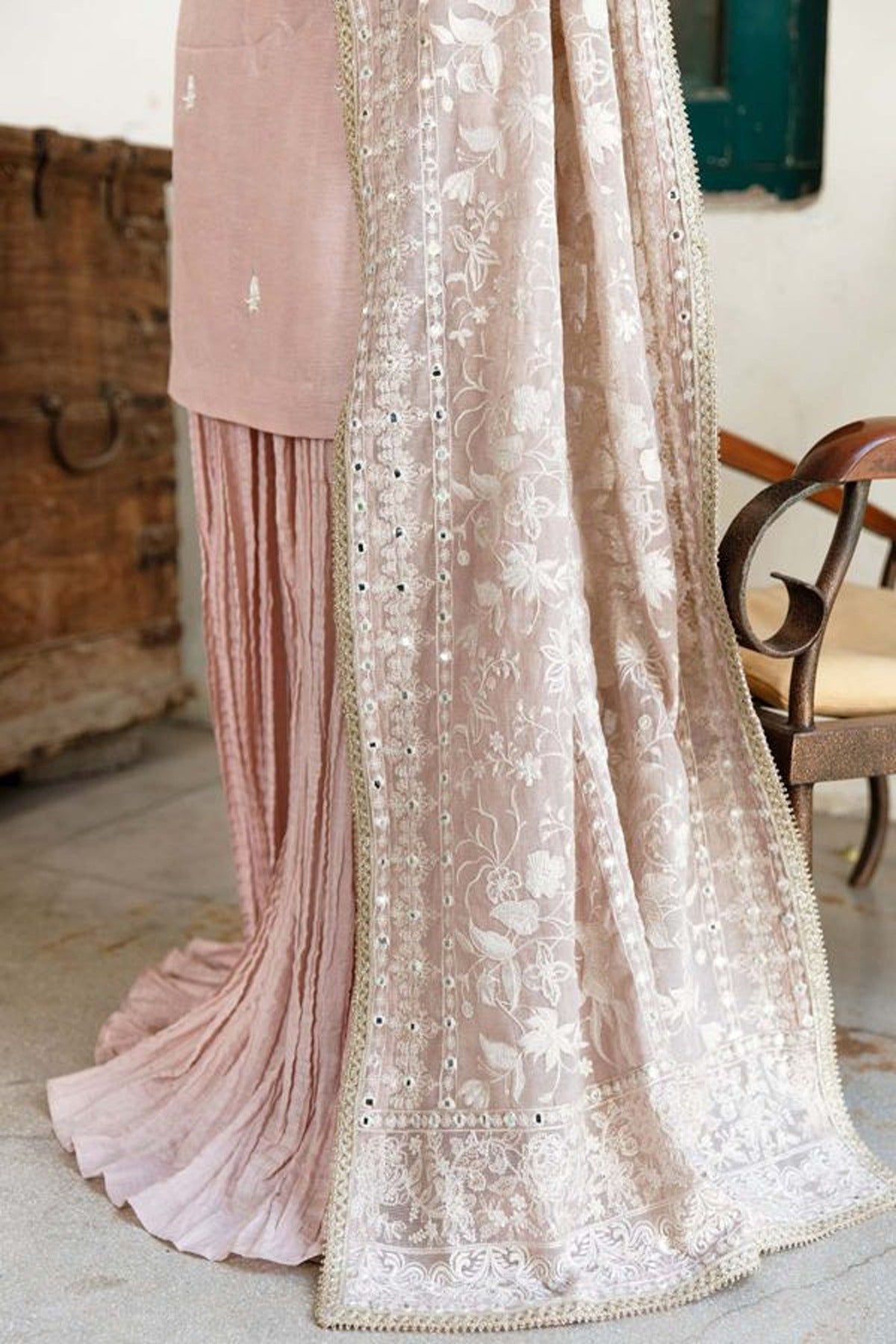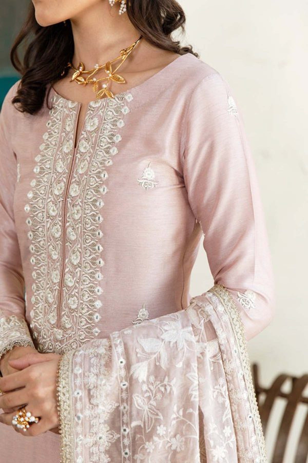 - Designed with an enchanting shade of pink, Mehrmaa comes with a charming Korean silk shirt adorned with dazzling sheesha work and eye catching sequins, as well as intricate embroidery and gold tilla work on the neckline which appeals to the senses.This outfit comes with crushed pants that create a dramatic flair and an embroidered cotton net dupatta with a 4-sided border delicately made with lace.