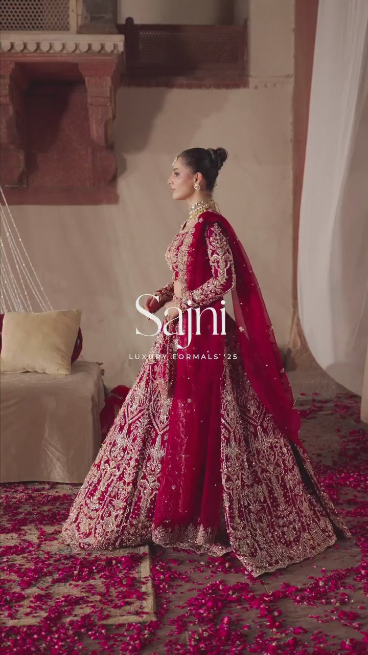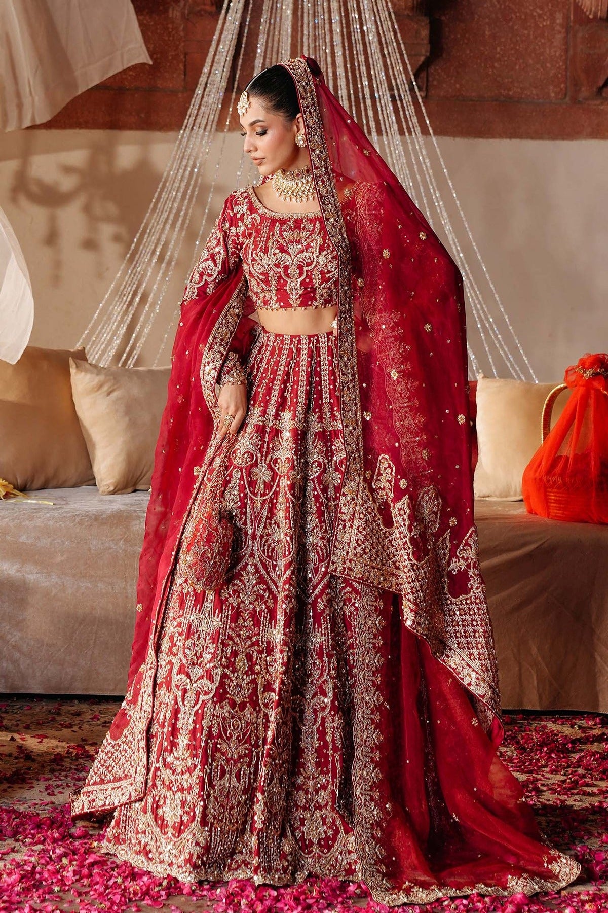 Drape yourself in timeless luxury with this rich red lehenga choli set, crafted from premium Korean silk. The ensemble is brought to life with intricate embroidery and heavy embellishments on both the lehenga and choli, reflecting exquisite craftsmanship and opulence. A delicate kathaan organza dupatta, adorned with an all-over spray of embellished embroidery, completes the look with a graceful and elevated finish. Perfect for bridal and festive occasions, this outfit is a true celebration of grandeur and elegance.