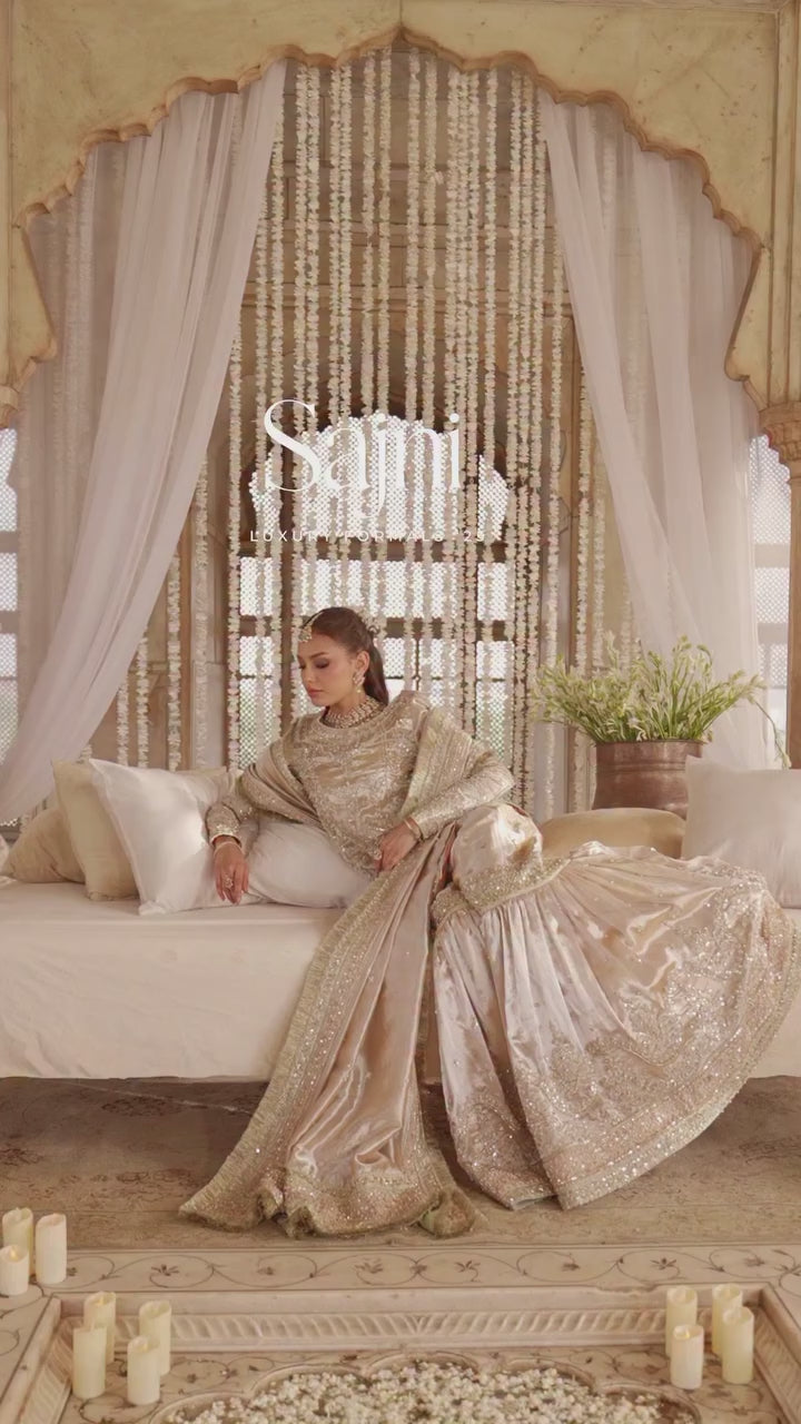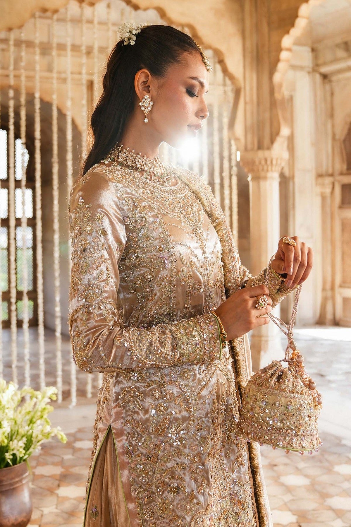 Embrace understated luxury with this stunning three-piece set in soft pink, crafted entirely from sumptuous tissue fabric. The straight-cut shirt is beautifully adorned with detailed ada work, offering a touch of timeless refinement. It is paired with a heavily embroideredand embellished gharara, enriched with intricate borders that exude grandeur. Completing the ensemble, the tissue dupatta features a delicate all-over embroidered spray, adding a graceful and elegant finish. Perfect for weddings and festive occasions, this outfit captures both softness and sophistication.