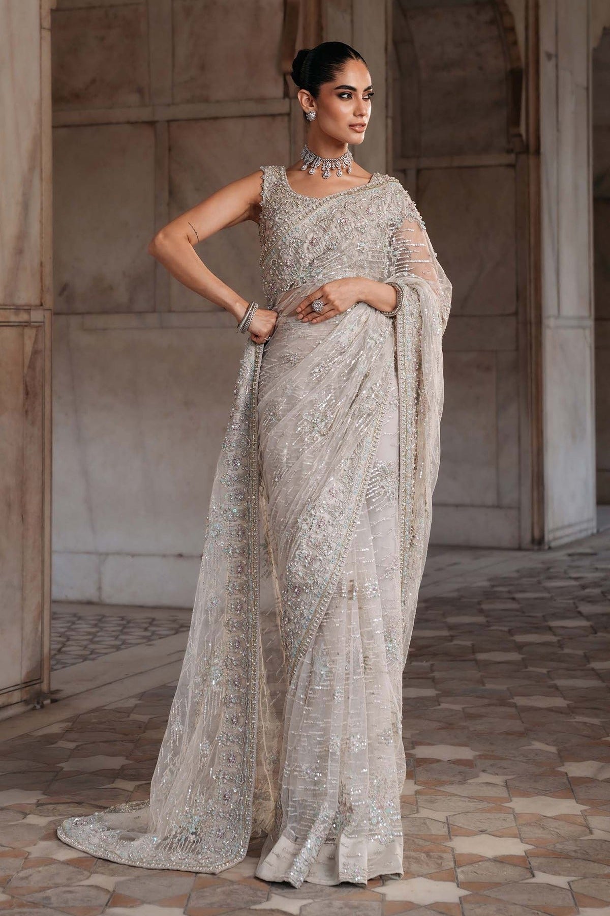 Elevate your occasion wear with this ivory net saree, a masterpiece of timeless elegance. Featuring delicate floral bunches, a subtle all-over spray of sequins, and intricate ada work, it brings just the right touch of shimmer and sophistication. The look is completed with a matching net blouse, meticulously hand-embellished to perfection. Exuding grace and refined craftsmanship, this ensemble is designed for those who appreciate understated luxury and everlasting style.