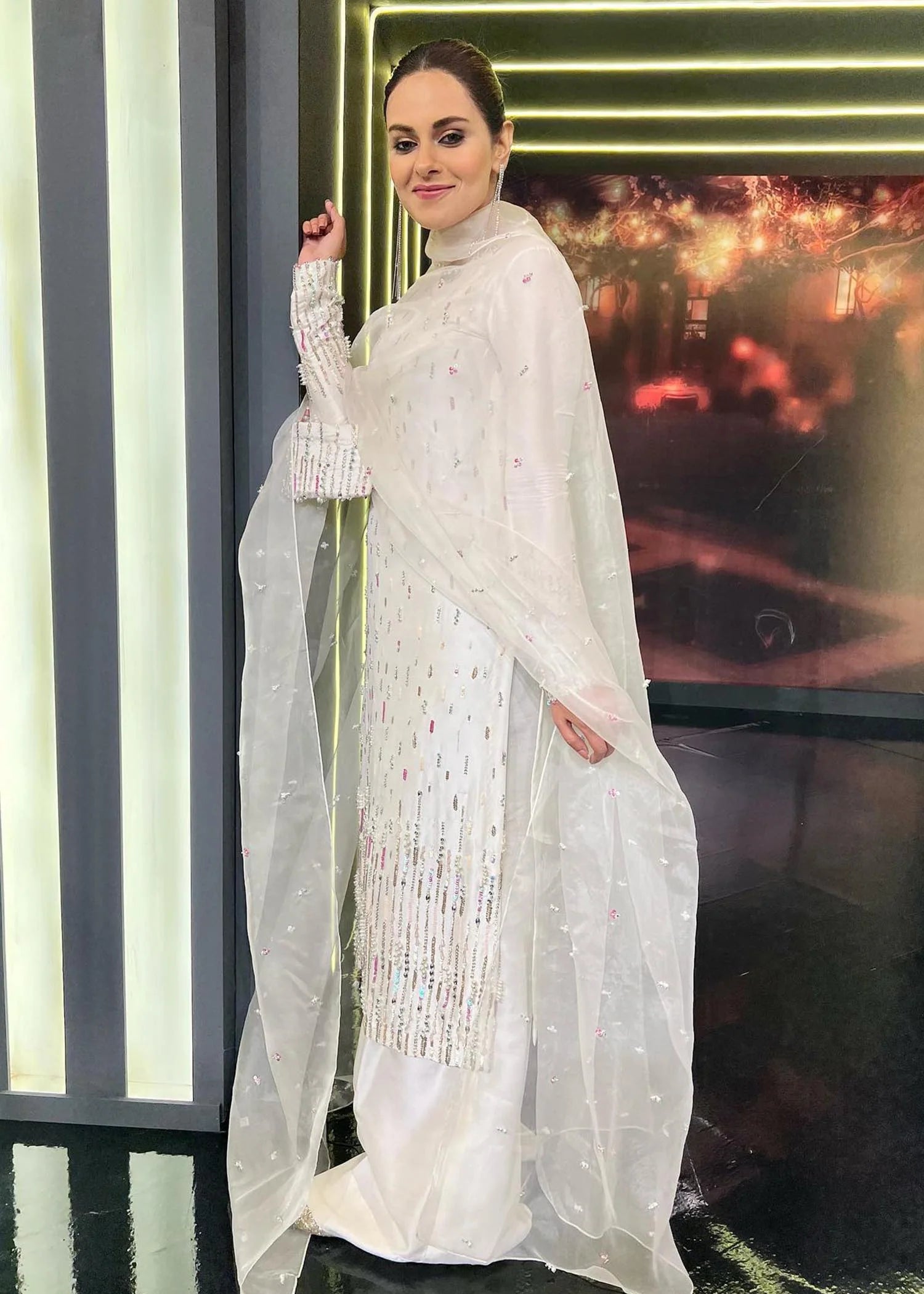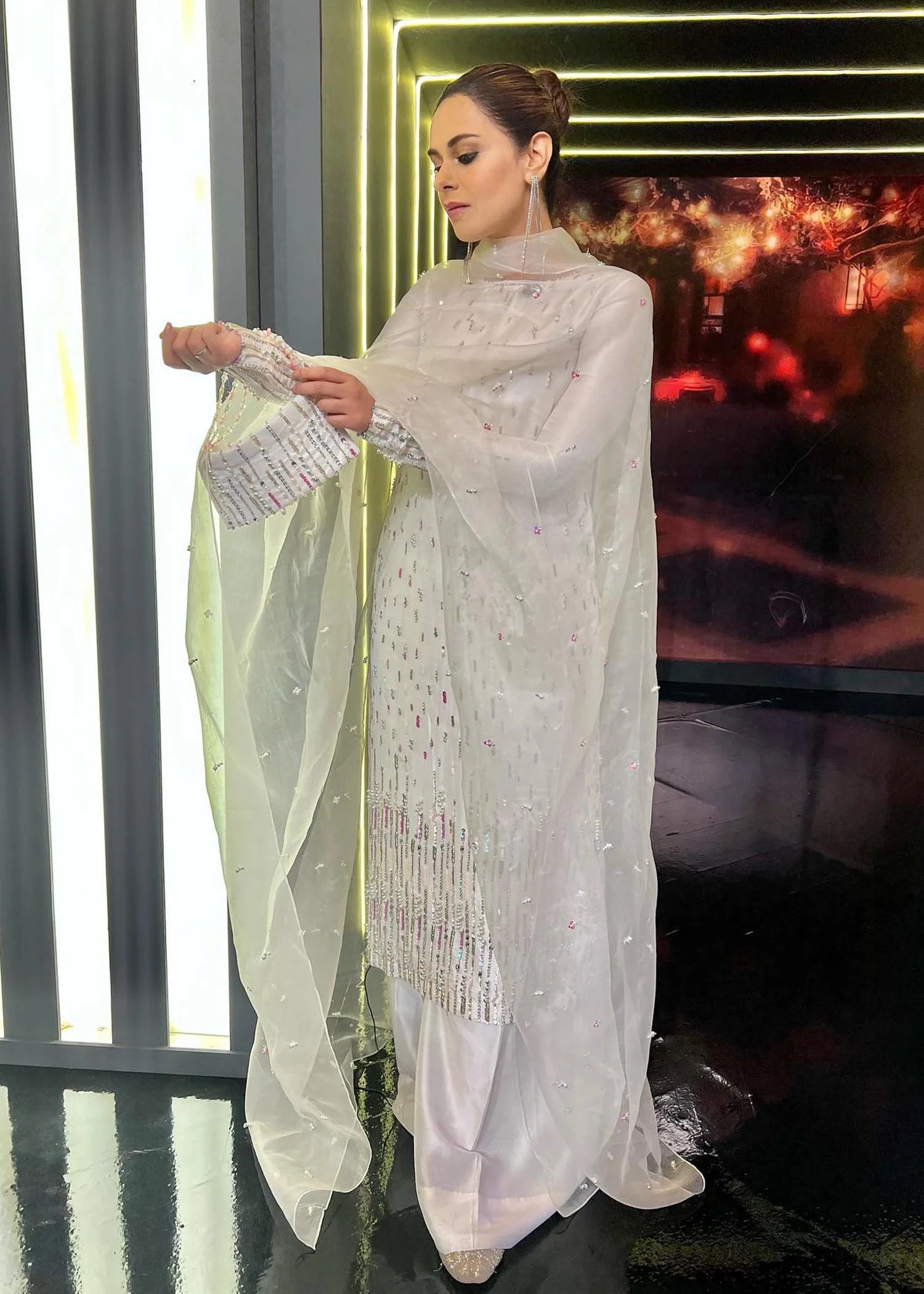 Celeste is adorned with hand embellishments in crystals and French sequins, adding a touch of sparkle and shine. The raw silk straight shirt has a sleek and sophisticated silhouette, with clean lines and simple details that allow the hand embellishments to take center stage. The flared pants are both stylish and comfortable, with a flattering fit that complements the shirt perfectly. The organza dupatta adds a touch of elegance, with a sheer and delicate fabric that drapes beautifully over the shoulders.
