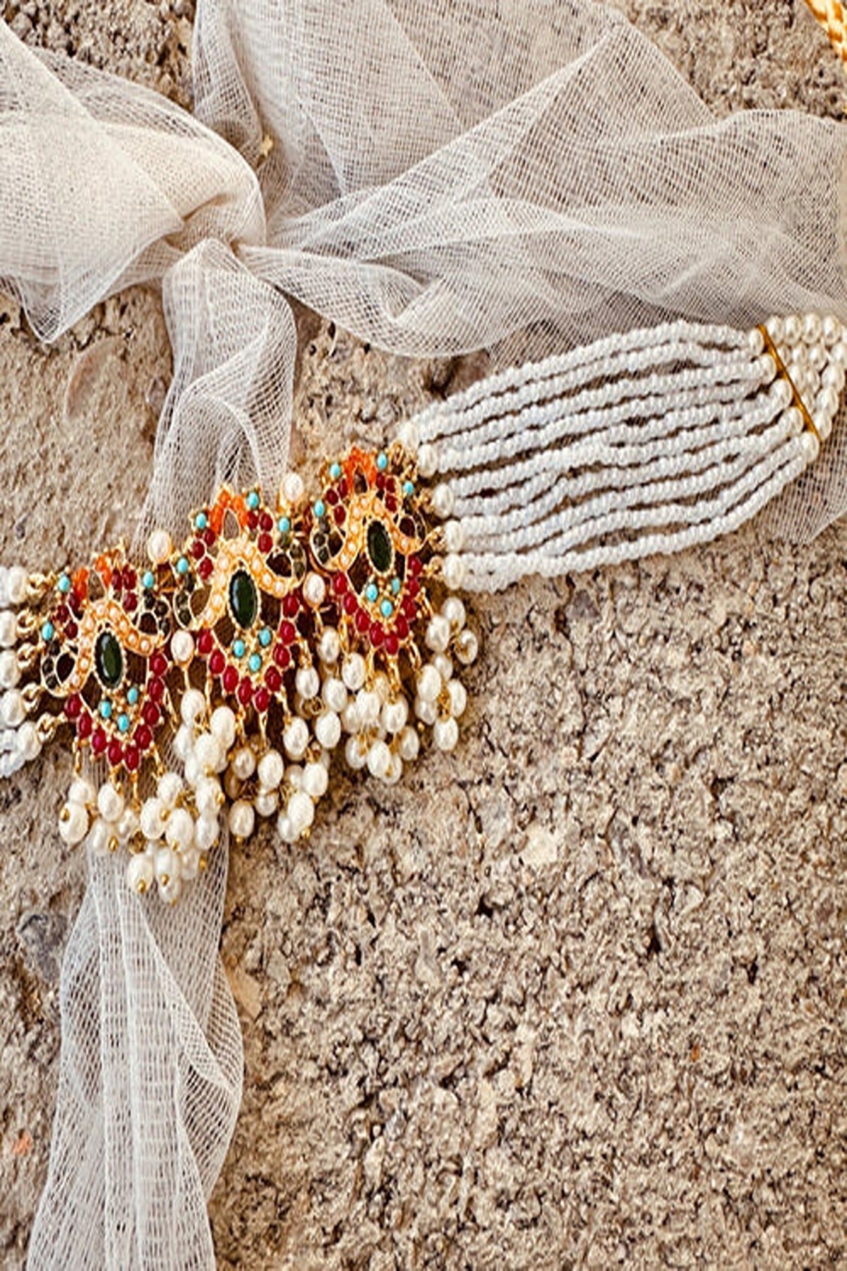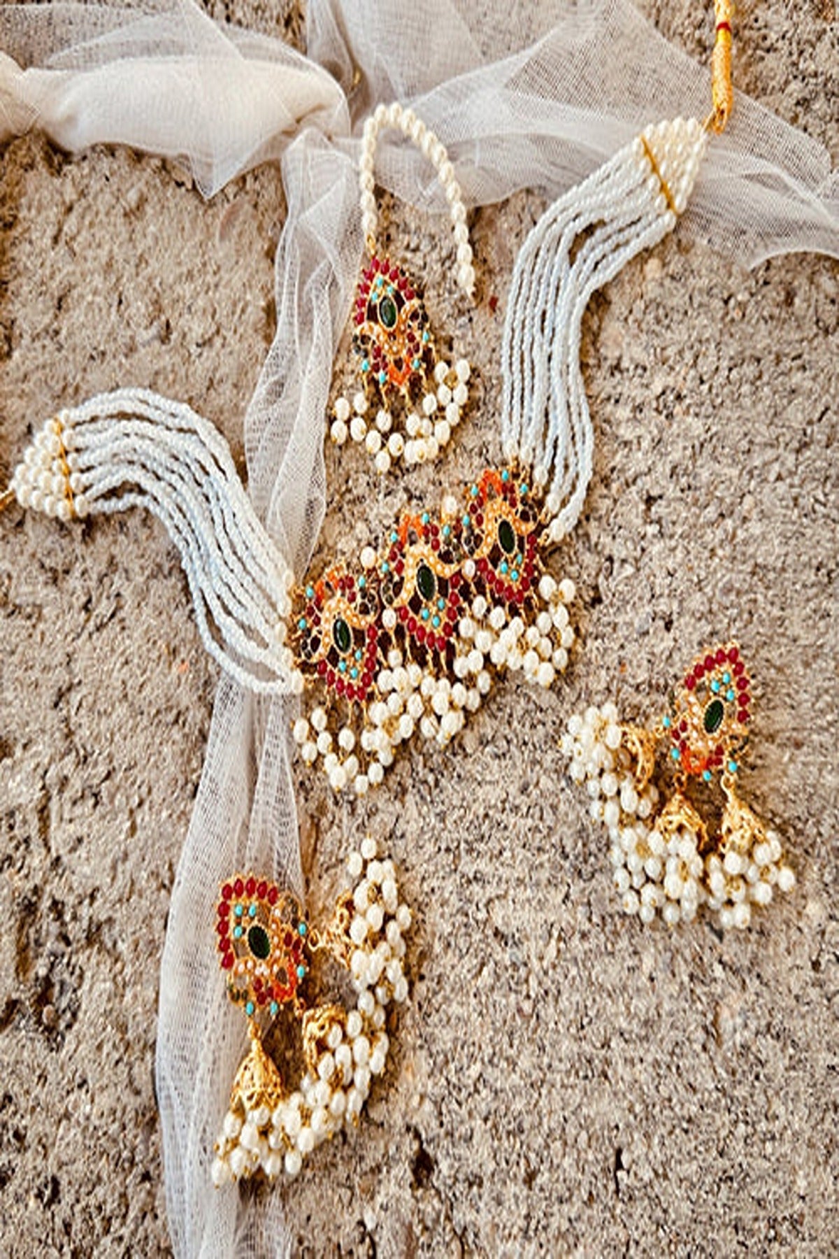 The Nauratan Choker Set in Green radiates the beauty of nature. With its rich, emerald-like stones, this set embodies freshness, vitality, and timeless elegance. It is perfect for brides seeking a vibrant, yet classic touch that stands out with every movement.