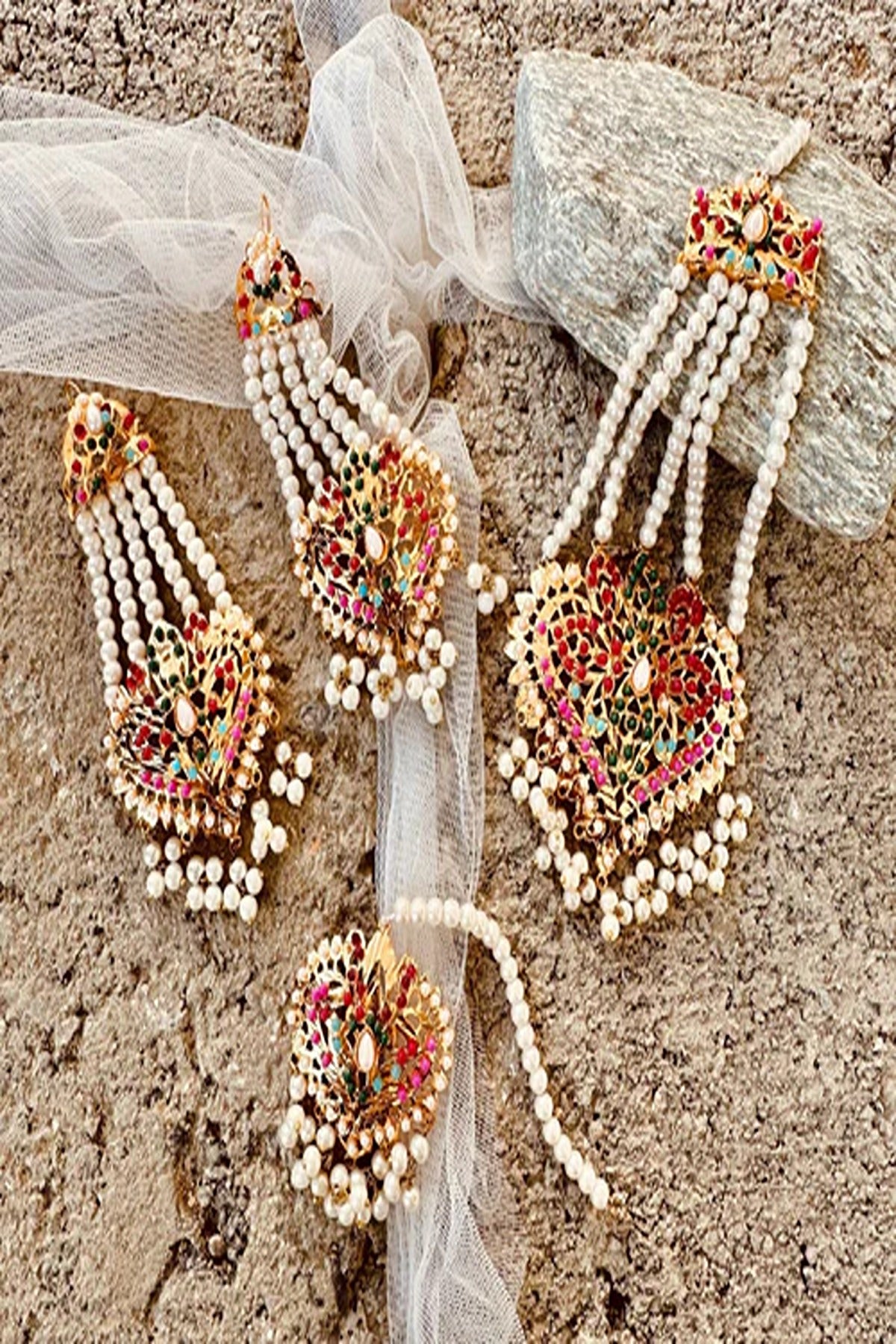 - Complete set includes malaa, choker, earrings, jhoomer, tikka, and bracelet for a head-to-toe statement look.
