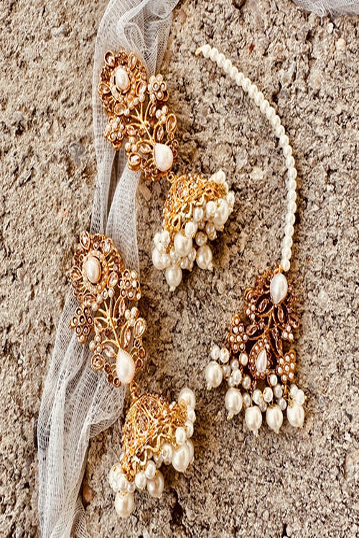 Pure and ethereal, the Mehr Pearl White Choker Set embodies understated luxury. Crafted with a delicate pearl white choker, matching jhumki earrings, and a tikka, this set is ideal for bridal wear, engagements, and timeless celebrations.