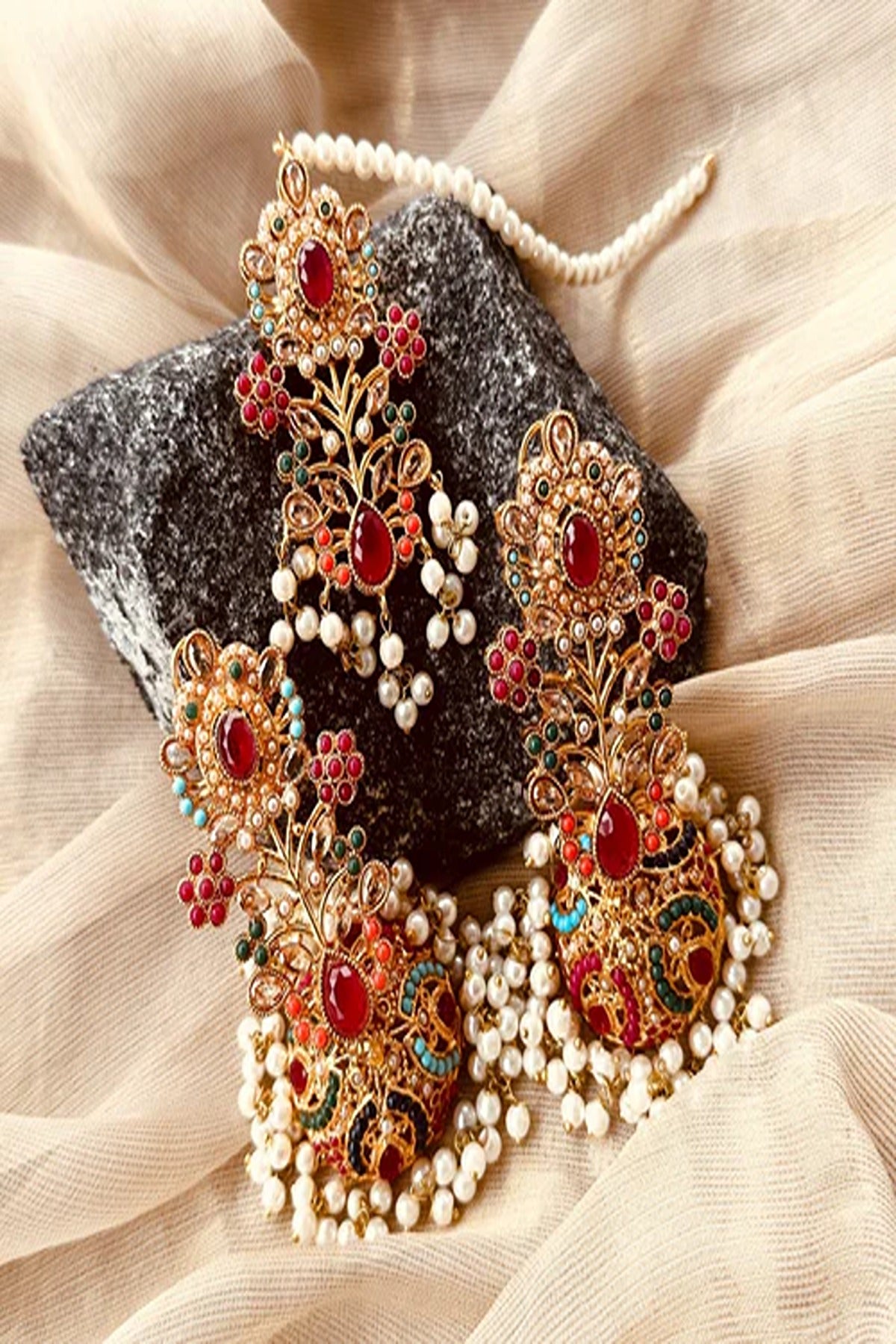 Elevate your elegance with the Naurang Noor Collar Set, a stunning combination of traditional charm and contemporary design. This set features a beautifully crafted collar, complemented by intricate earrings and a matching tikka, making it the perfect accessory for any special occasion.